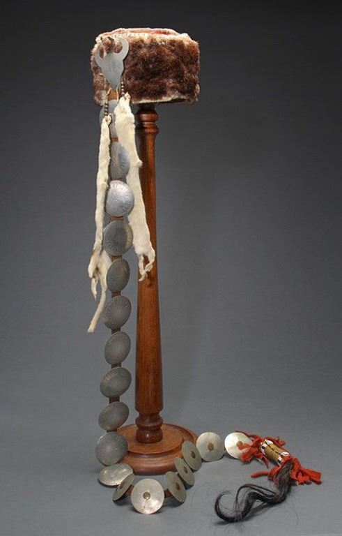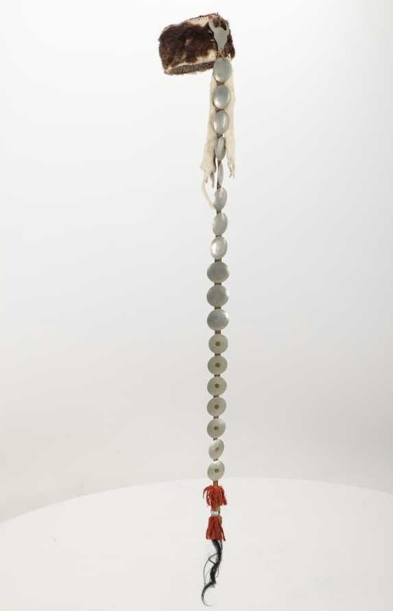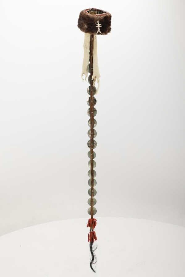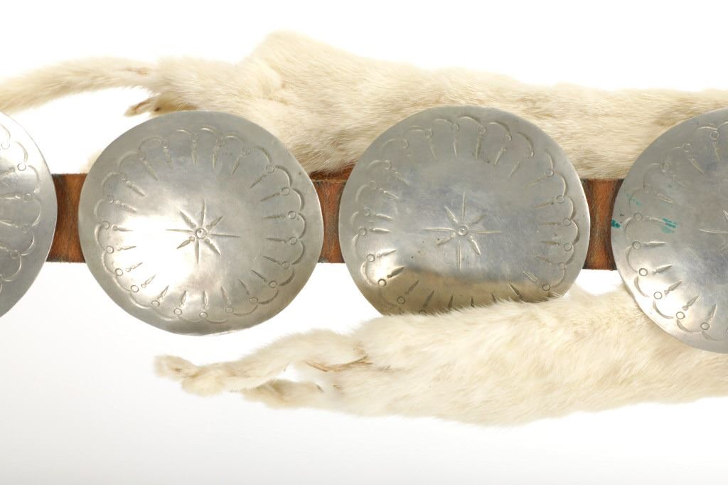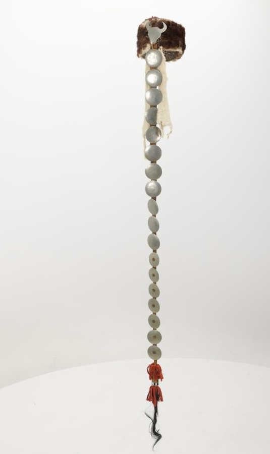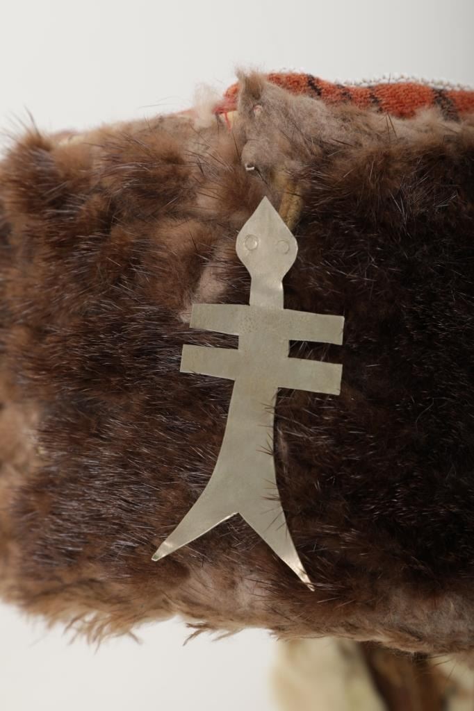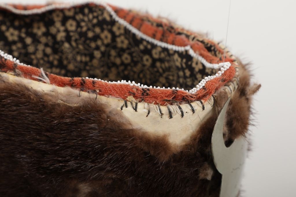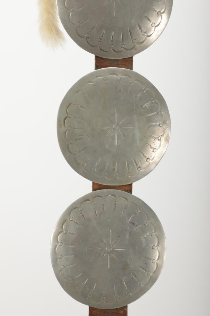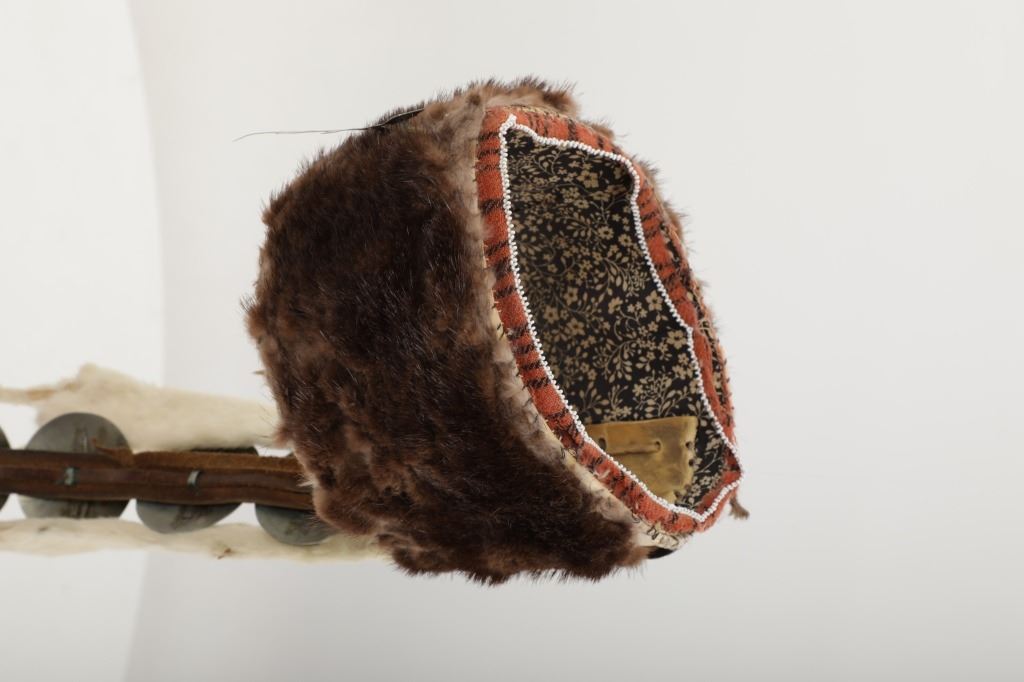 This is an outstanding 19th Century Northern Arapaho otter turban with silver concho drop from the ex-collection of Sherwoods Spirit of America Gallery in Santa Fe Mark Kokin. Early Indians from the the Omaha-Ponca Hethuska, Osage Inlonshka, Northern Arapaho, Kiowa, Prairie, amongst other tribes worn turban's of otter fur such as this, unlike the traditional war bonnet or headdresses of the Plains. Dr. James Howard summized "The otterskin hat, rather than the war bonnet, was the 'chief's' headdress, while a similar headdress of fox fur marked the experienced warrior." (Howard, 1965, p. 66). “The peculiar headgear shown in plates 36 and 49 (otter fur turbans), was worn only by chiefs; it bore the name watha’ge, which was applied to all caps which fit the head.” (Fletcher & LaFlesche, 1911, p. 354). These original otter turban's are incredibly scarce with this being an example from the Northern Arapaho dating to the 1800's. This example shows a parfleche rawhide band of otterskin / otter skin with otter fur on the outside sewn to calico floral trade clothe and trade clothe canvas inner linning which holds a stiff backing, possibly a later addition, and along the top is a band of red stroud wool trade clothe with a fancy beaded edge at the top in period correct glass trade seed beads chalk white showing mainly trade thread sewing. The back of the turban shows a unique piece of nickel silver showing a modified cross of loraine with head at the top and split tail bottom. The front shows a nickel silver Buffalo Bison skull shape with four-point line and circle design stamped at the front with Indian tanned tied on fringes with solid brass trade beads and long ermine skins and lastly tied on the long drop of harness saddle trade leather. The long piece of harness saddle leather has rows of original nickel silver large conchos / conchas, first a row totaling eleven being approximatley 2 7/8" in diameter having a stamped pattern on each and nickel silver slide on back. At the end of the leather strip tied on is another added leather strip which holds seven other conchos / conchas having a nickel silver body with simple stamped patternwith drilled hole at the center having a round copper button which has a loop on the bottom and is tied onto Indian tanned hide. At the bottom of this section is tied on a drop which consist of a trade clothe canvas core having a wrapping of Indian tanned hide with glass trade seed bead beadwork with fringe strips of red stroud trade clothe at teh top and bottom as well as tied on the bottom a strip of rawhide from the end of a horse tail with long horse tail hair. The last seven conchos and horsetail hair drop is likely a later old addition. Provenance: From the collection of Sherwoods Spirit of America Santa Fe, New Mexico Mark Kokin, an ex-collection of Oklahoma and a private collection from outside Milwaukee, Wisconsin. Original Turban bonnets such as this are exceedingly rare with examples holding original nickel concho drops being even more scarce. For reference see the Kiowa Hair Roach and Trade Clothe Drop sold by Skinner Bonhams in 2013 for nearly $10,000, the Prairie Otter fur turban with german silver broach circa 1880. Truly a sale highlight. The piece overall measures 77 inches in total length. The turban is 5 inches wide at the band by approximately 24.75" circumference around the outside. The piece has a custom plexiglass plastic frame for mounting on the wall (with break). Included is the image from Sherwoods Spirit of America Santa Fe, New Mexico Mark Kokin, stand not included.