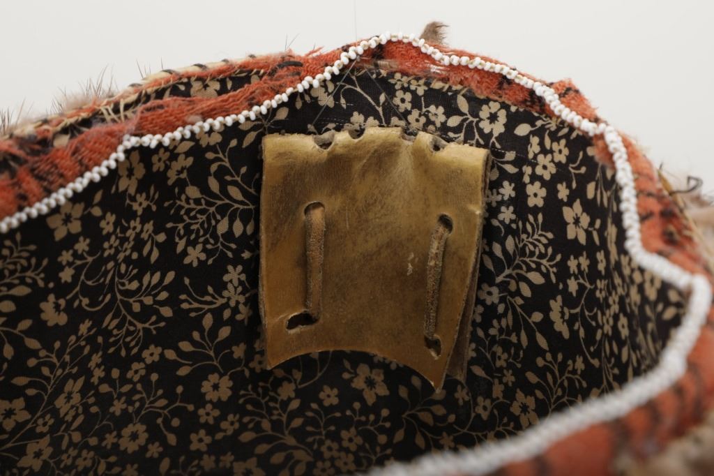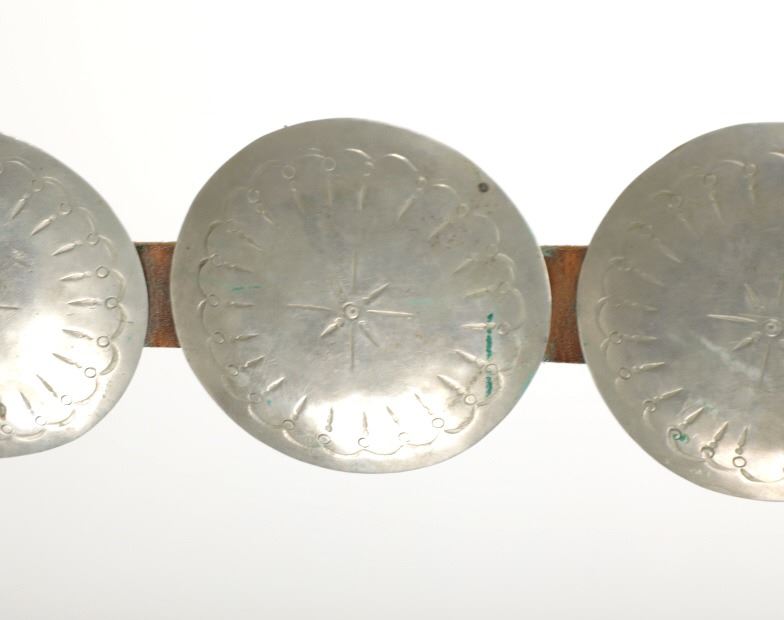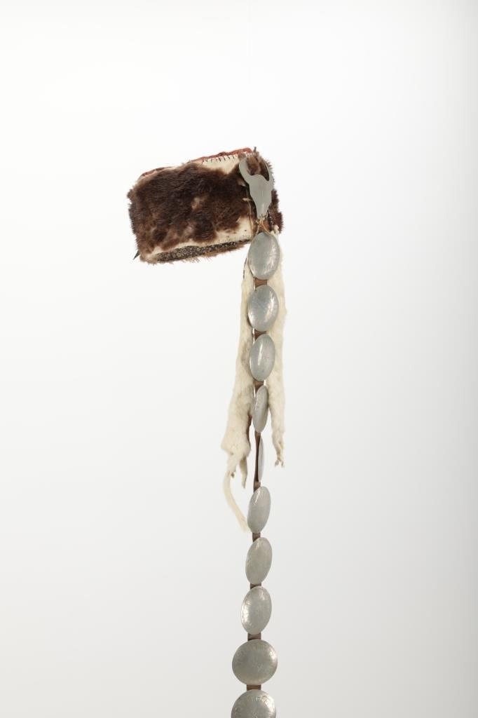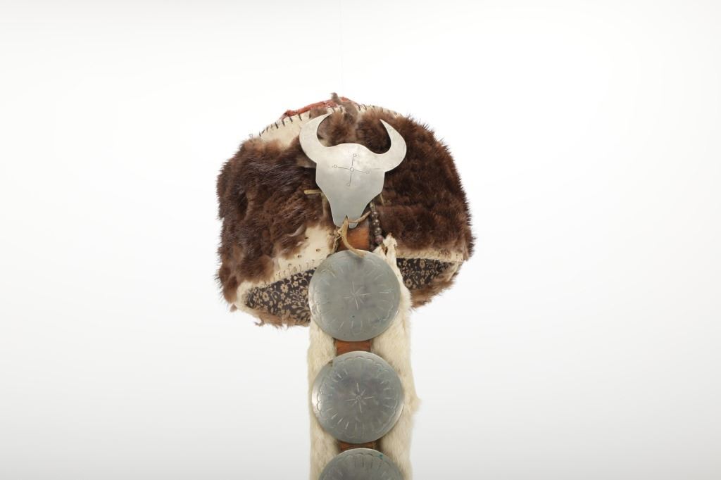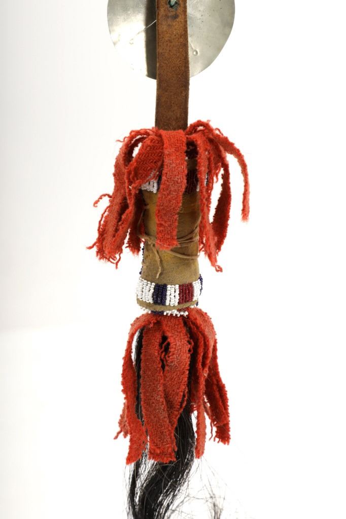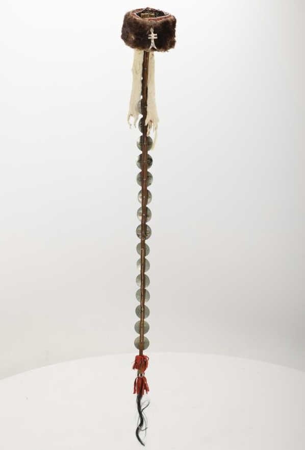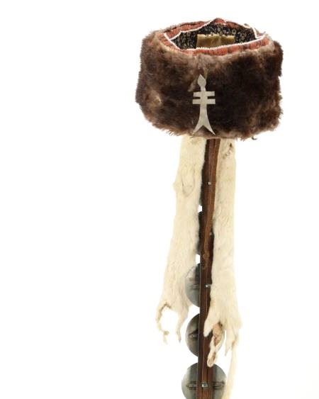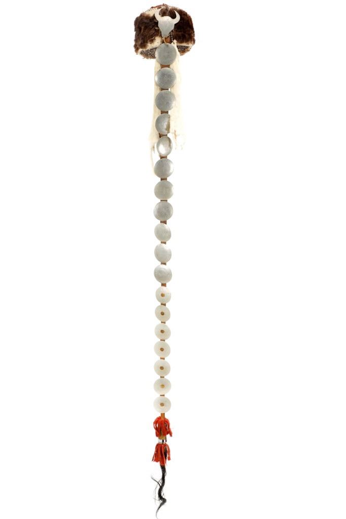 This is an outstanding 19th Century Northern Arapaho otter turban with silver concho drop from the ex-collection of Sherwoods Spirit of America Gallery in Santa Fe Mark Kokin. Early Indians from the the Omaha-Ponca Hethuska, Osage Inlonshka, Northern Arapaho, Kiowa, Prairie, amongst other tribes worn turban's of otter fur such as this, unlike the traditional war bonnet or headdresses of the Plains. Dr. James Howard summized "The otterskin hat, rather than the war bonnet, was the 'chief's' headdress, while a similar headdress of fox fur marked the experienced warrior." (Howard, 1965, p. 66). “The peculiar headgear shown in plates 36 and 49 (otter fur turbans), was worn only by chiefs; it bore the name watha’ge, which was applied to all caps which fit the head.” (Fletcher & LaFlesche, 1911, p. 354). These original otter turban's are incredibly scarce with this being an example from the Northern Arapaho dating to the 1800's. This example shows a parfleche rawhide band of otterskin / otter skin with otter fur on the outside sewn to calico floral trade clothe and trade clothe canvas inner linning which holds a stiff backing, possibly a later addition, and along the top is a band of red stroud wool trade clothe with a fancy beaded edge at the top in period correct glass trade seed beads chalk white showing mainly trade thread sewing. The back of the turban shows a unique piece of nickel silver showing a modified cross of loraine with head at the top and split tail bottom. The front shows a nickel silver Buffalo Bison skull shape with four-point line and circle design stamped at the front with Indian tanned tied on fringes with solid brass trade beads and long ermine skins and lastly tied on the long drop of harness saddle trade leather. The long piece of harness saddle leather has rows of original nickel silver large conchos / conchas, first a row totaling eleven being approximatley 2 7/8" in diameter having a stamped pattern on each and nickel silver slide on back. At the end of the leather strip tied on is another added leather strip which holds seven other conchos / conchas having a nickel silver body with simple stamped patternwith drilled hole at the center having a round copper button which has a loop on the bottom and is tied onto Indian tanned hide. At the bottom of this section is tied on a drop which consist of a trade clothe canvas core having a wrapping of Indian tanned hide with glass trade seed bead beadwork with fringe strips of red stroud trade clothe at teh top and bottom as well as tied on the bottom a strip of rawhide from the end of a horse tail with long horse tail hair. The last seven conchos and horsetail hair drop is likely a later old addition. Provenance: From the collection of Sherwoods Spirit of America Santa Fe, New Mexico Mark Kokin, an ex-collection of Oklahoma and a private collection from outside Milwaukee, Wisconsin. Original Turban bonnets such as this are exceedingly rare with examples holding original nickel concho drops being even more scarce. For reference see the Kiowa Hair Roach and Trade Clothe Drop sold by Skinner Bonhams in 2013 for nearly $10,000, the Prairie Otter fur turban with german silver broach circa 1880. Truly a sale highlight. The piece overall measures 77 inches in total length. The turban is 5 inches wide at the band by approximately 24.75" circumference around the outside. The piece has a custom plexiglass plastic frame for mounting on the wall (with break). Included is the image from Sherwoods Spirit of America Santa Fe, New Mexico Mark Kokin, stand not included.