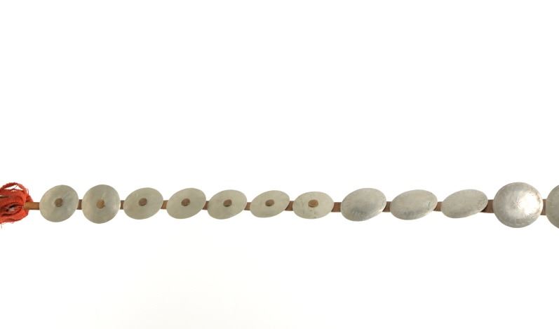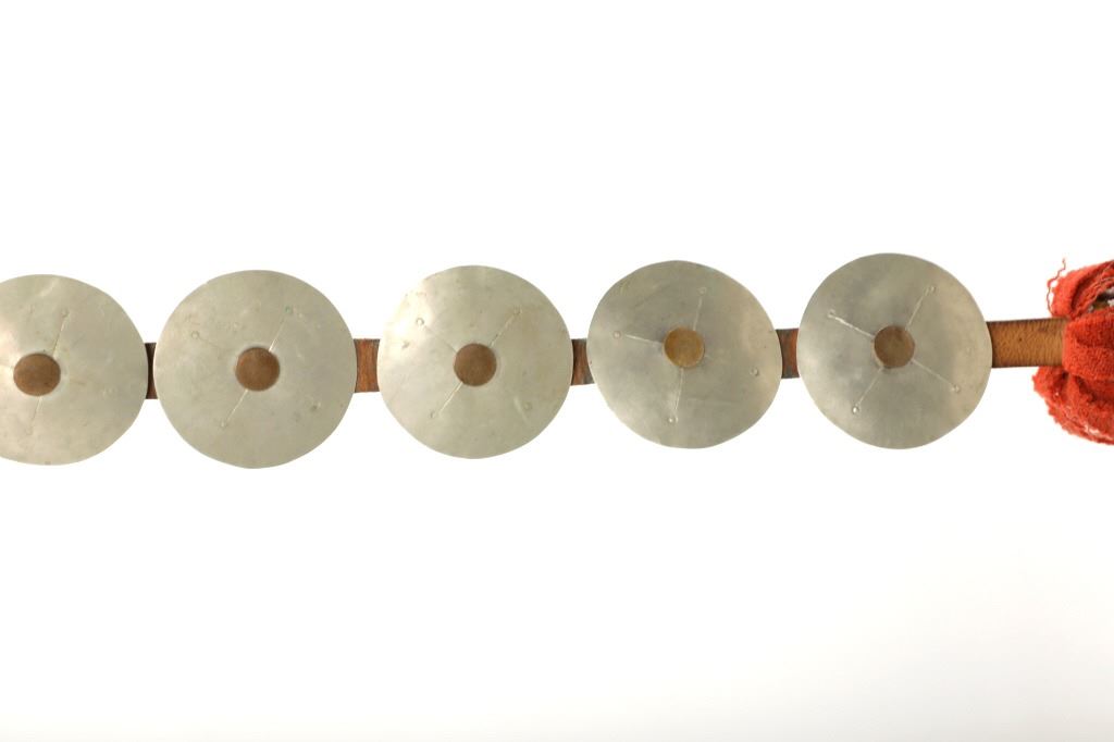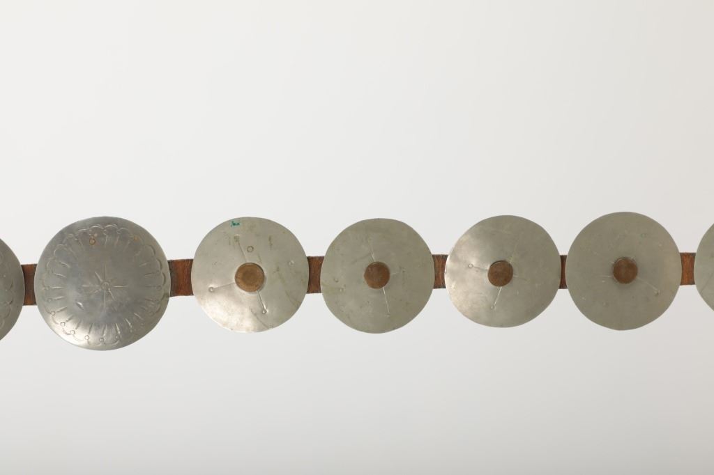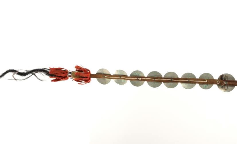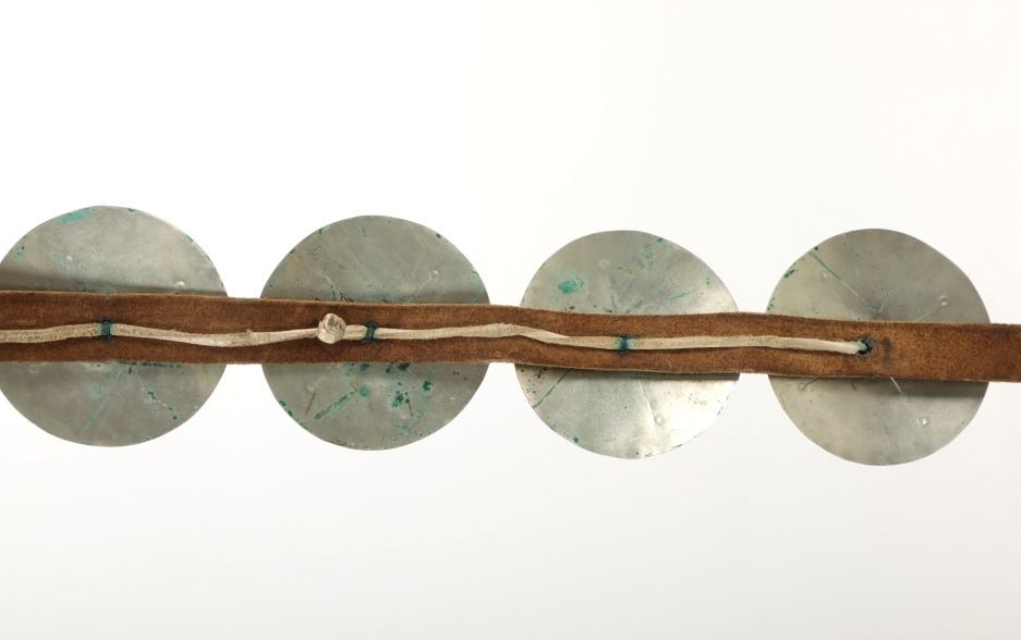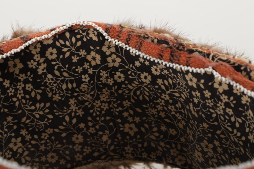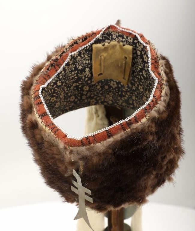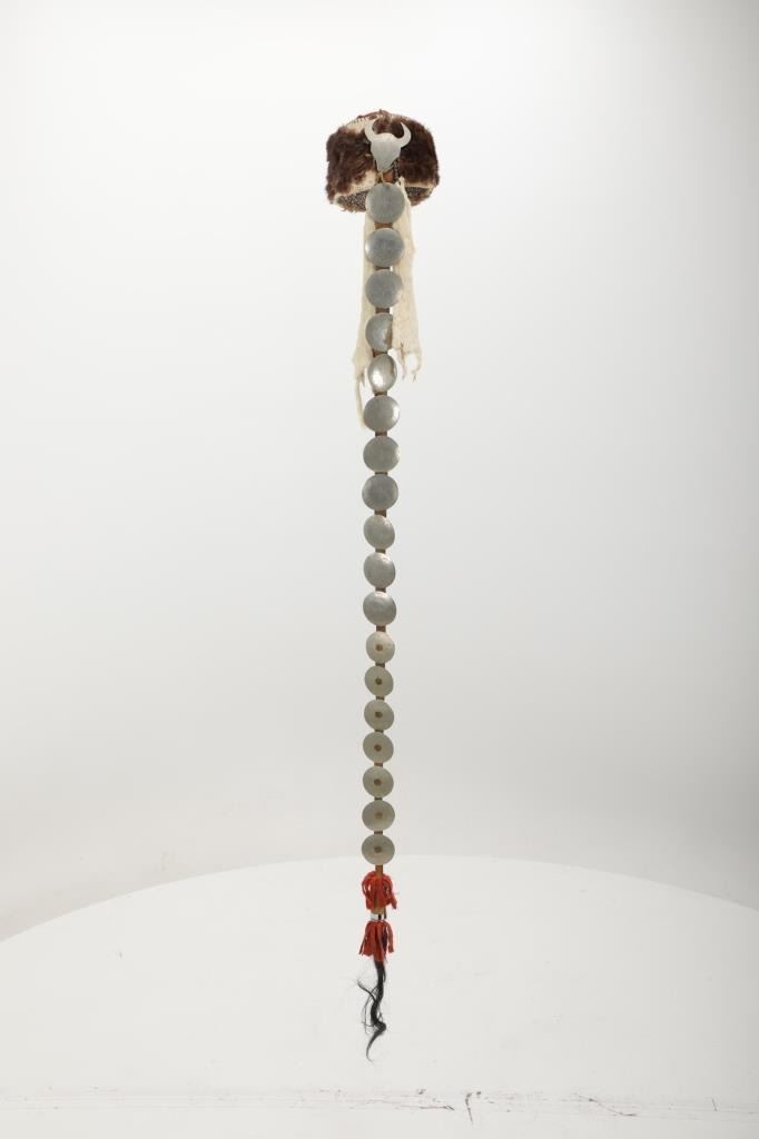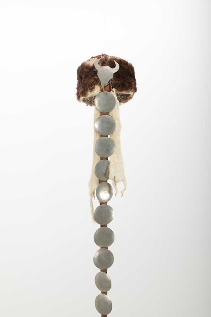 This is an outstanding 19th Century Northern Arapaho otter turban with silver concho drop from the ex-collection of Sherwoods Spirit of America Gallery in Santa Fe Mark Kokin. Early Indians from the the Omaha-Ponca Hethuska, Osage Inlonshka, Northern Arapaho, Kiowa, Prairie, amongst other tribes worn turban's of otter fur such as this, unlike the traditional war bonnet or headdresses of the Plains. Dr. James Howard summized "The otterskin hat, rather than the war bonnet, was the 'chief's' headdress, while a similar headdress of fox fur marked the experienced warrior." (Howard, 1965, p. 66). “The peculiar headgear shown in plates 36 and 49 (otter fur turbans), was worn only by chiefs; it bore the name watha’ge, which was applied to all caps which fit the head.” (Fletcher & LaFlesche, 1911, p. 354). These original otter turban's are incredibly scarce with this being an example from the Northern Arapaho dating to the 1800's. This example shows a parfleche rawhide band of otterskin / otter skin with otter fur on the outside sewn to calico floral trade clothe and trade clothe canvas inner linning which holds a stiff backing, possibly a later addition, and along the top is a band of red stroud wool trade clothe with a fancy beaded edge at the top in period correct glass trade seed beads chalk white showing mainly trade thread sewing. The back of the turban shows a unique piece of nickel silver showing a modified cross of loraine with head at the top and split tail bottom. The front shows a nickel silver Buffalo Bison skull shape with four-point line and circle design stamped at the front with Indian tanned tied on fringes with solid brass trade beads and long ermine skins and lastly tied on the long drop of harness saddle trade leather. The long piece of harness saddle leather has rows of original nickel silver large conchos / conchas, first a row totaling eleven being approximatley 2 7/8" in diameter having a stamped pattern on each and nickel silver slide on back. At the end of the leather strip tied on is another added leather strip which holds seven other conchos / conchas having a nickel silver body with simple stamped patternwith drilled hole at the center having a round copper button which has a loop on the bottom and is tied onto Indian tanned hide. At the bottom of this section is tied on a drop which consist of a trade clothe canvas core having a wrapping of Indian tanned hide with glass trade seed bead beadwork with fringe strips of red stroud trade clothe at teh top and bottom as well as tied on the bottom a strip of rawhide from the end of a horse tail with long horse tail hair. The last seven conchos and horsetail hair drop is likely a later old addition. Provenance: From the collection of Sherwoods Spirit of America Santa Fe, New Mexico Mark Kokin, an ex-collection of Oklahoma and a private collection from outside Milwaukee, Wisconsin. Original Turban bonnets such as this are exceedingly rare with examples holding original nickel concho drops being even more scarce. For reference see the Kiowa Hair Roach and Trade Clothe Drop sold by Skinner Bonhams in 2013 for nearly $10,000, the Prairie Otter fur turban with german silver broach circa 1880. Truly a sale highlight. The piece overall measures 77 inches in total length. The turban is 5 inches wide at the band by approximately 24.75" circumference around the outside. The piece has a custom plexiglass plastic frame for mounting on the wall (with break). Included is the image from Sherwoods Spirit of America Santa Fe, New Mexico Mark Kokin, stand not included.