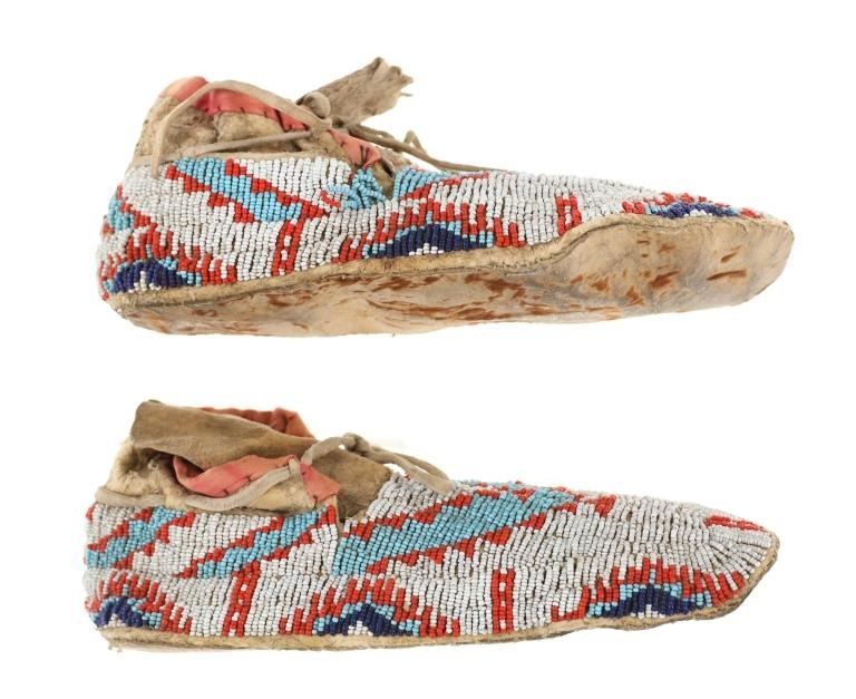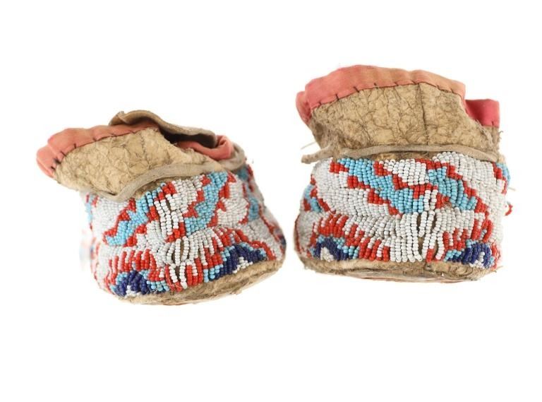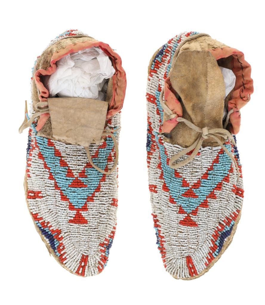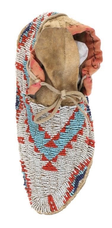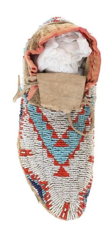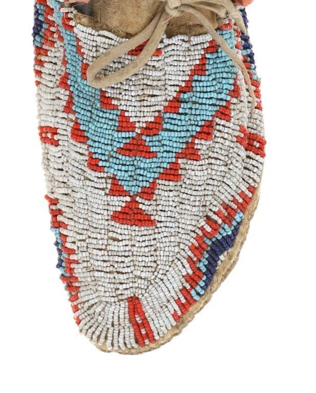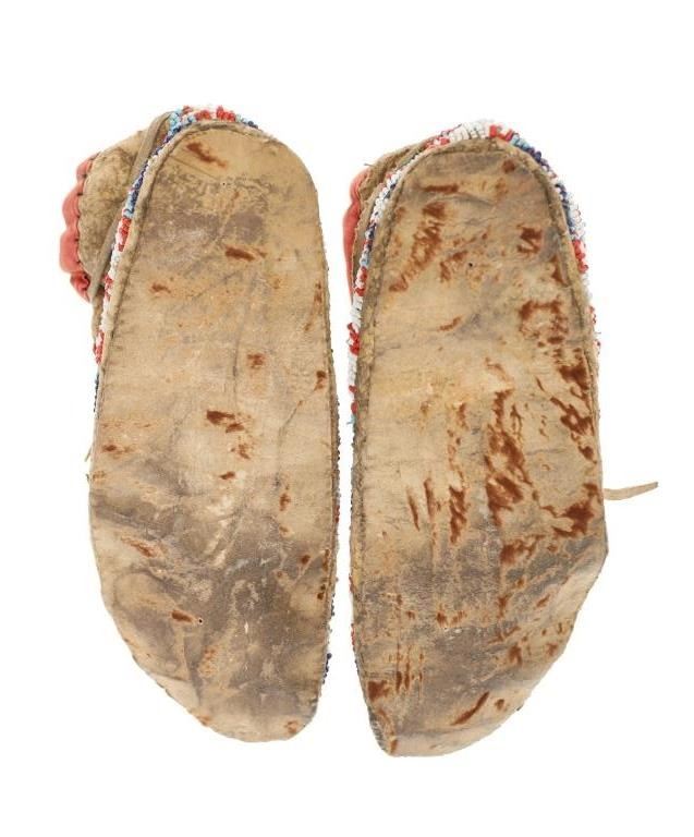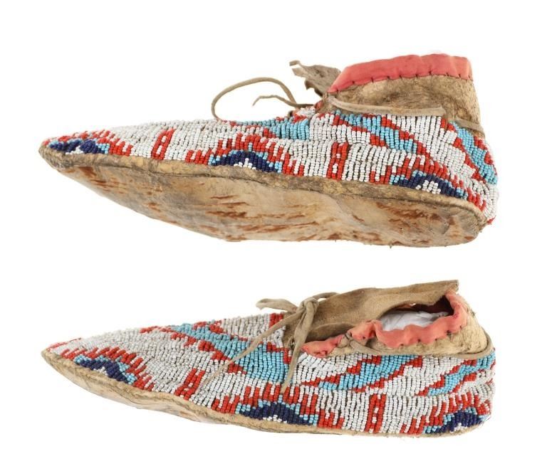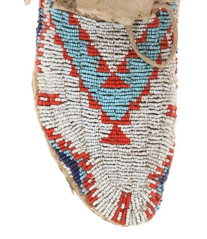 This is a great set of 19th-century Indian hide beaded men's moccasins with hard sole bottoms from the Northern Cheyenne. The set is comprised of Indian tanned hide which is sinew sewn and has thick rawhide parfleche hard sole bottoms as well as red trade clothe on the ankle. The tops are covered in sinew sewn 1800's glass trade seed beads in a stepped or serrated triangle geometric pattern. The set shows colors of chalk white, light blue, red, cobalt. There is little bead loss, being mostly present and various strands of sinew visible, an early beadwork feature. The moccasins have a hard sole rawhide bottoms with foot worn patina pattern and the entire set shows mostly supple hide with little damage and are well kept. Each moccasin measures 10.5-inches long by 4-inches wide by 4-inches high at the ankle.