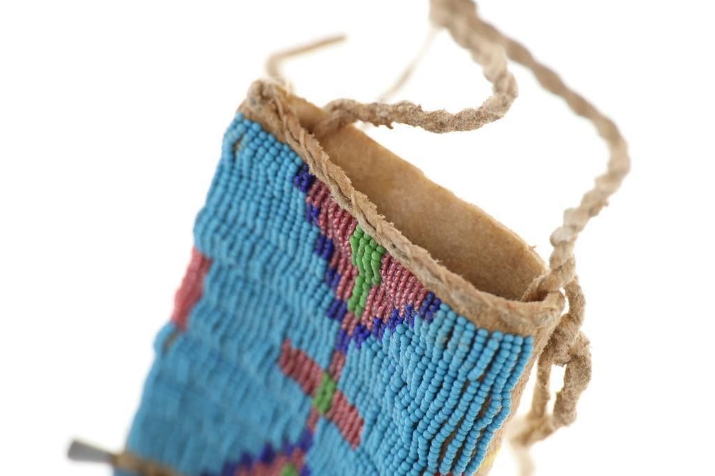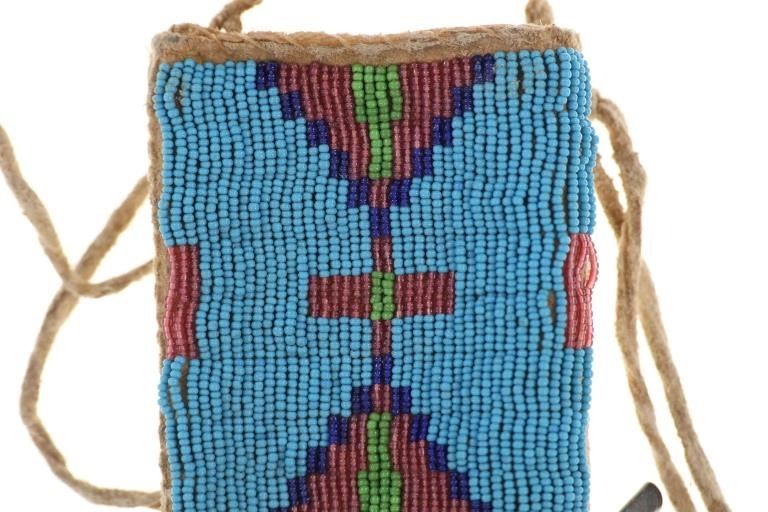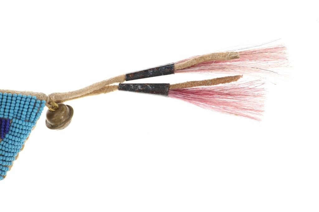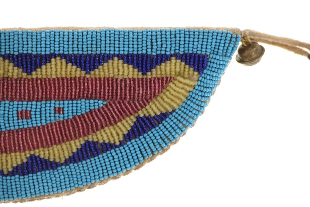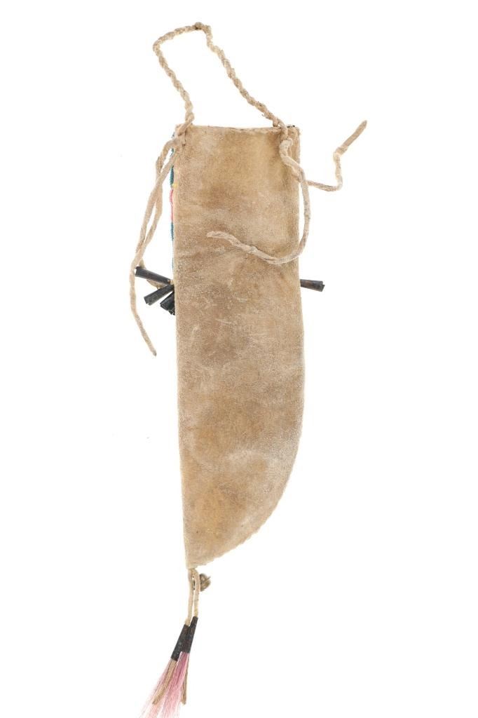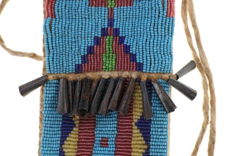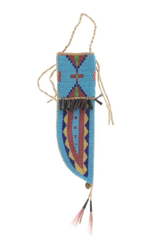 The lot features an Indian hide and rawhide lined knife sheath with beautiful beadwork and is dating to circa late-1800's from the Northern Cheyenne. The sheath exhibits Indian tanned hide body with parfleche rawhide hard inside lining all being sinew sewn with a braided Indian hide belt strap atop and Indian hide fringes at the center with rolled tin jingle dangle cones. The front of the belt sheath is covered in classic geometric beadwork from the Cheyenne and Northern Cheyenne showing a light blue bacground with symbols of stepped triangles, cross, tab squares, zig-zag river or snake patterns and banding done in greasy yellow, Cheyenne pink semi-transparent, dark blue, greasy green, and more light blue. The bottom shows an Indian hide fringe with solid brass hawk trade bell, two rolled tin metal jingle dangle cones with dyed horse tail hair. The beadwork is trade thread sewn. The piece is well kept and was likely preserved by a previous collector, truly a stunning look. Measures with fringes and belt strap 17.5--inches long and the sheath body itself without fringes is 10-inches long by 3-inches wide.