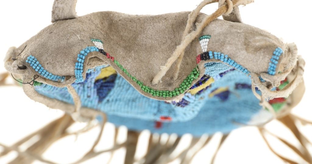 This is a fantastic circa 1880-1890 buffalo hide beaded tobacco bag from the Northern Cheyenne, collected in Montana. The bag consists of Indian tanned buffalo / bison hide with cotton thread and sinew sewing and exhibits four prominent morning star patterns. The entire front is covered in 1800's glass trade seed beadwork showing geometric pattern having colors of greasy sky padre blue, greasy yellow, cobalt, greasy green, red white heart, and chalk white. The top flap has a tab pattern and also has beadwork. There is an original belt strap and ties as well as thick hand cut Indian hide fringes along the bottom. Uncommon tobacco pouch. Some slight bead loss but well kept piece. Measures approx. 19"H by 8"W.