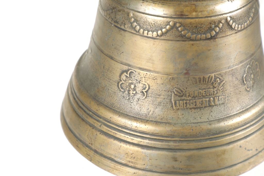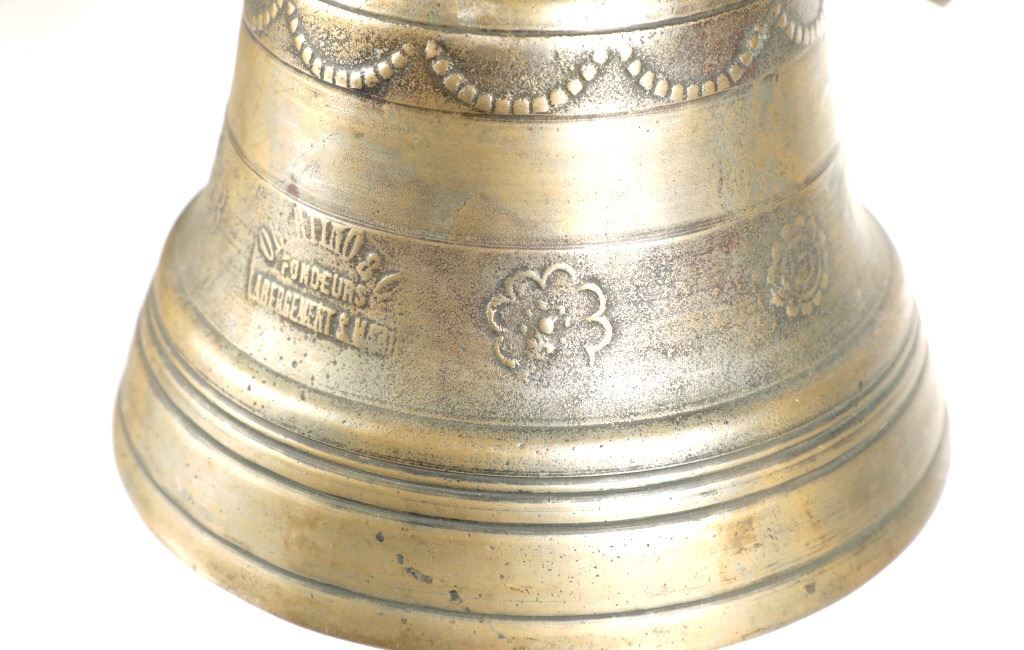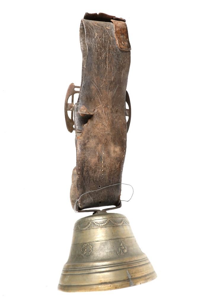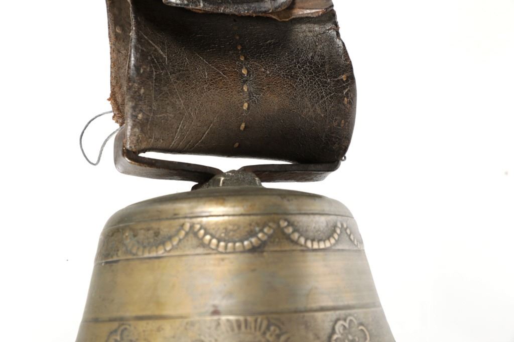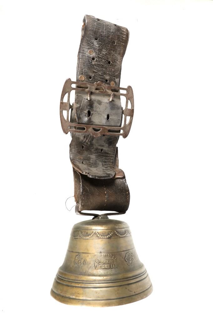 Featured in this lot is this Obertino Fondeurs Labergement cowbell circa 19th century. The cowbell features a wonderfully and professionally crafted brass and leather construction that shows a thick harness leather strap with a brass bell attached that shows a pleasant ringing sound when struck. The front of the bell is marked as follows: Obertino 8-0 - Fondeurs - Labergement S Marit. The condition of this cowbell is well preserved with the hallmark slightly worn and a patina adorning the bell and the heavy leather strap but otherwise shows a well preserved overall condition. The measurements of this cowbell is 22" x 6 3/4" x 6 3/4". The collective weight of this cowbell is 6lb 8oz.