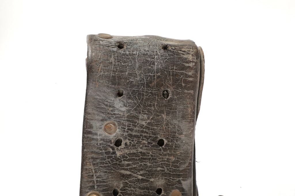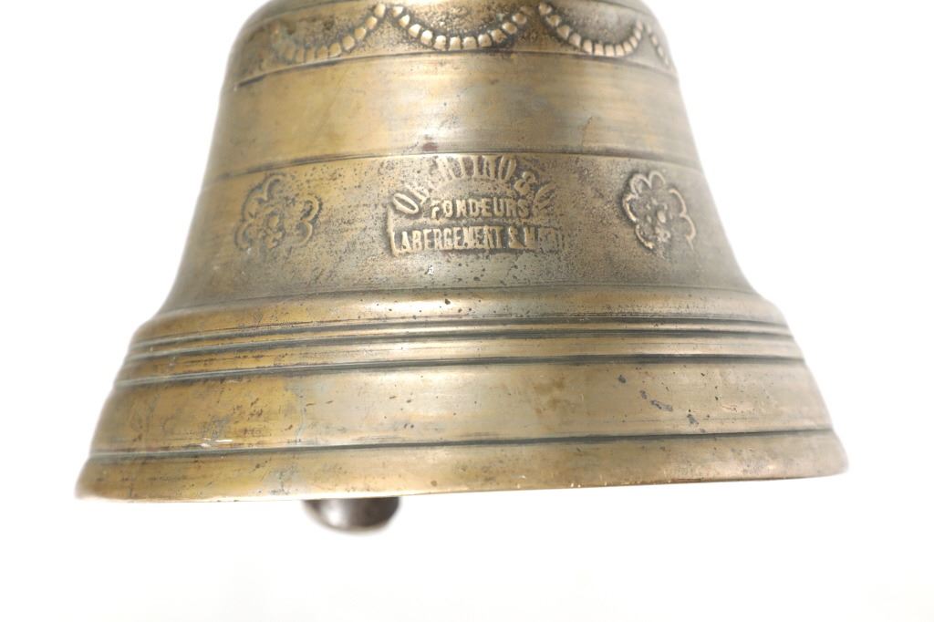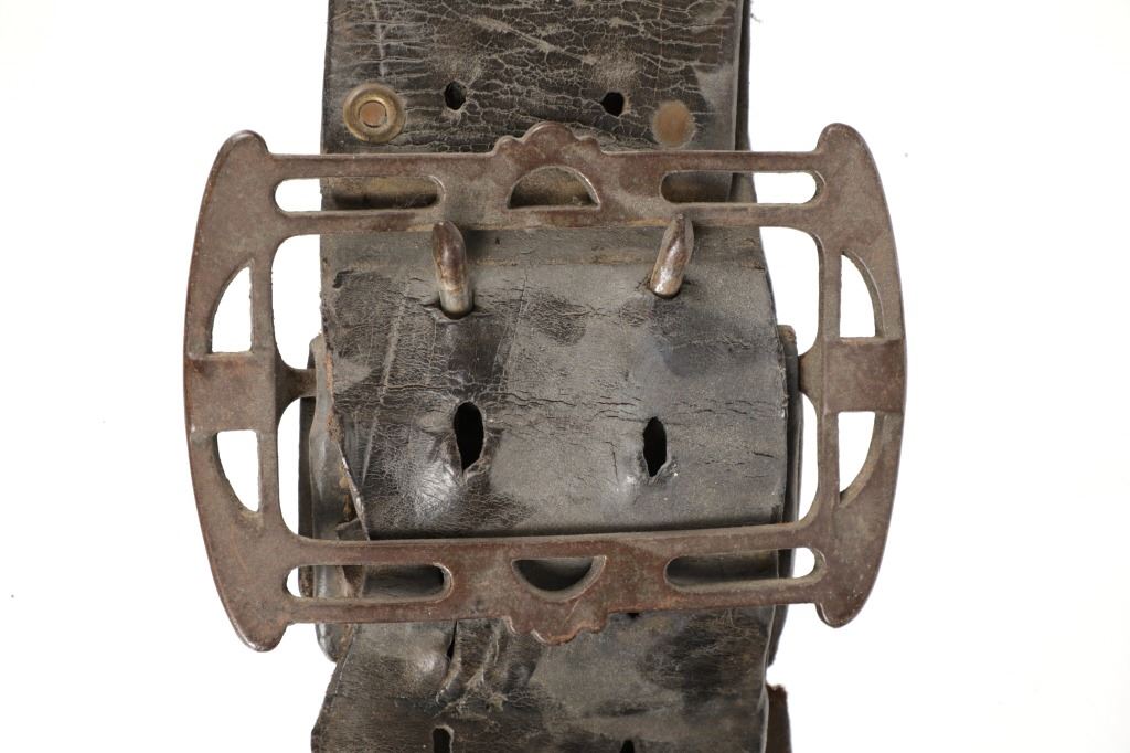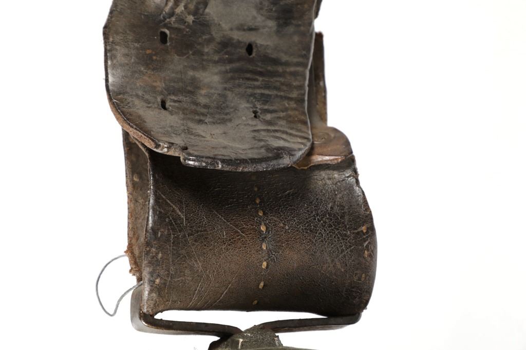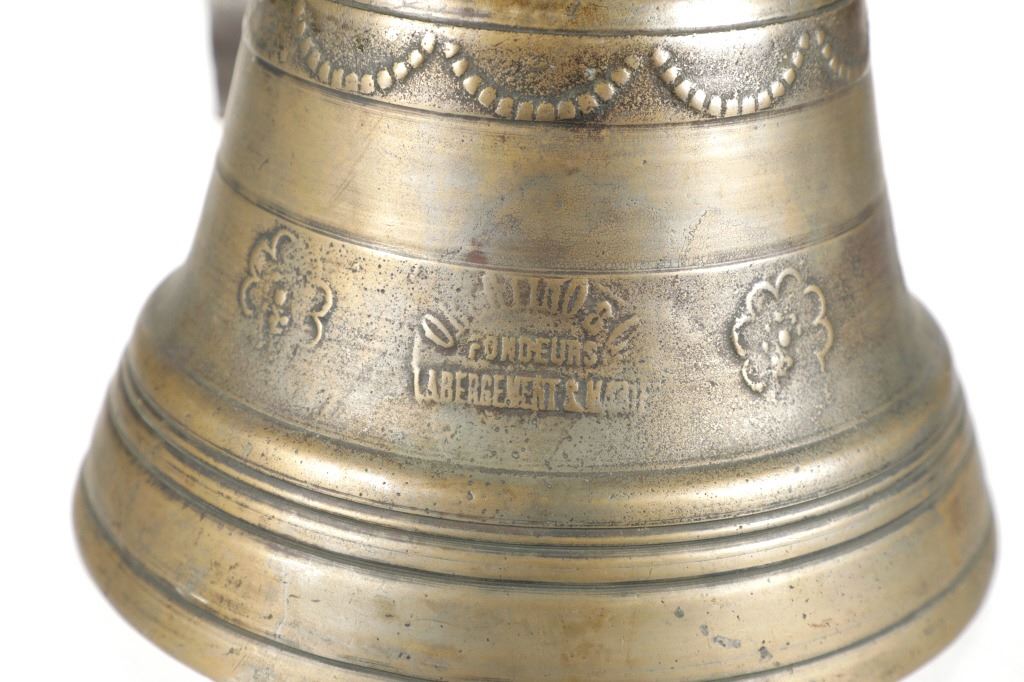 Featured in this lot is this Obertino Fondeurs Labergement cowbell circa 19th century. The cowbell features a wonderfully and professionally crafted brass and leather construction that shows a thick harness leather strap with a brass bell attached that shows a pleasant ringing sound when struck. The front of the bell is marked as follows: Obertino 8-0 - Fondeurs - Labergement S Marit. The condition of this cowbell is well preserved with the hallmark slightly worn and a patina adorning the bell and the heavy leather strap but otherwise shows a well preserved overall condition. The measurements of this cowbell is 22" x 6 3/4" x 6 3/4". The collective weight of this cowbell is 6lb 8oz.