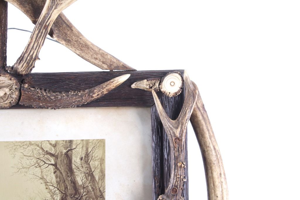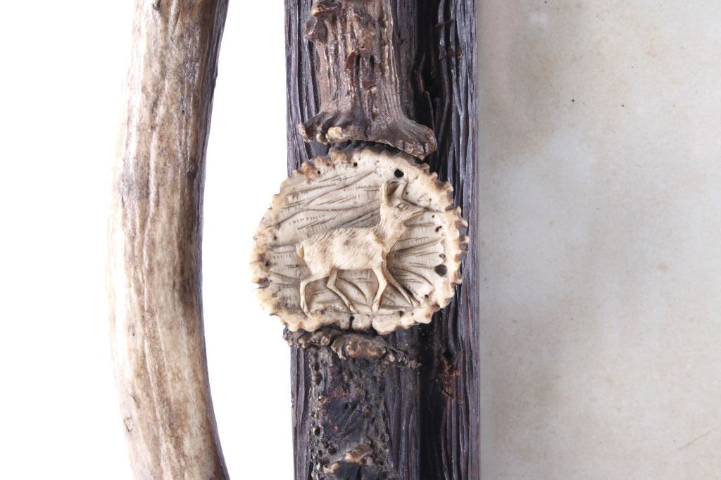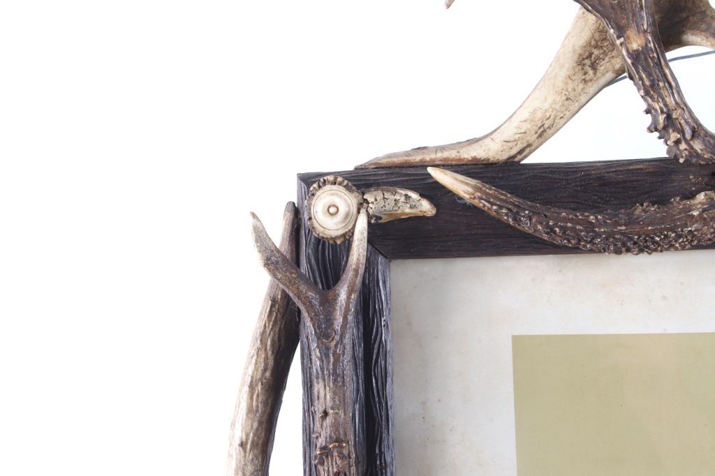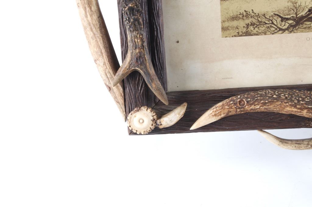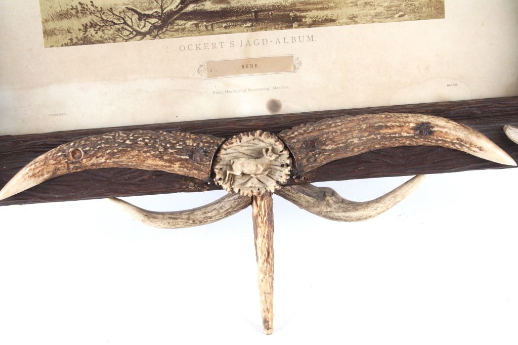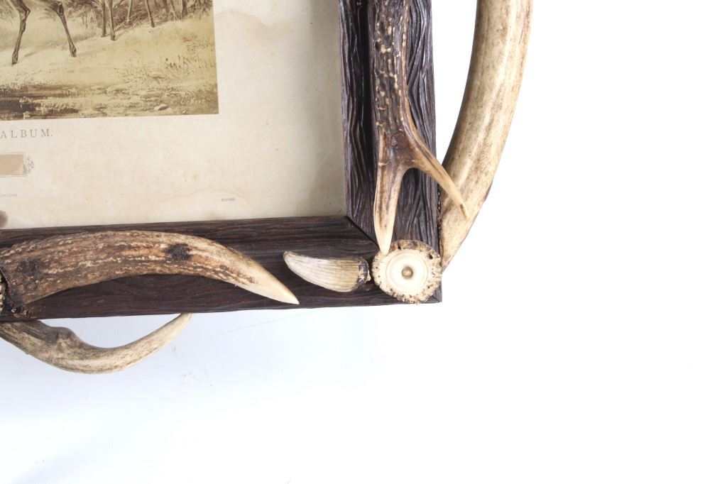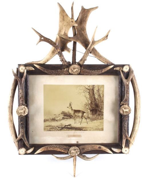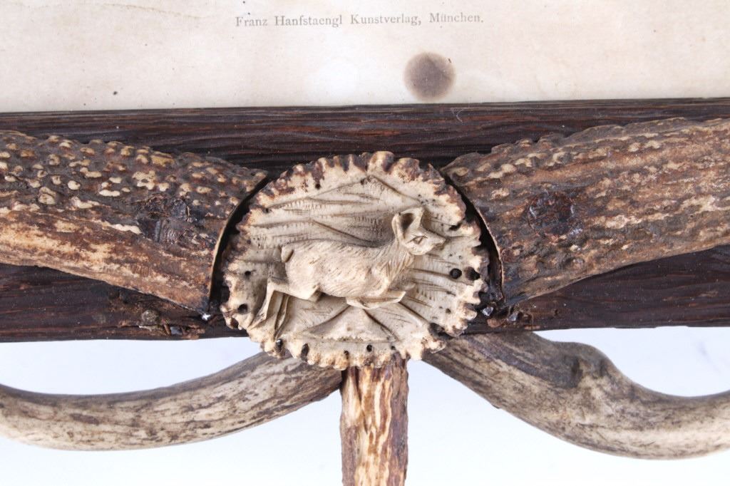 Featured in this lot is this antler frame and photogravure with a hunting scene from Ockert's Jagd-Album, a well-known German hunting art series from the 19th century. Franz Hanfstaengl Kunstverlag, Munich, a well-known German fine art publisher recognized for creating superior hunting and wildlife prints, is the publisher of this finely detailed lithograph, "Rehe" (Roe Deer). The artwork features roe deer, an animal closely linked to the European hunting tradition, in a tranquil forest setting. This frame is created from real antler that has been carefully placed to produce a rough and elaborate look reminiscent of the luxurious hunting lodges seen in Austria and Germany. Antler burls that are hand-carved and feature a detailed relief of a standing or running deer adorn the frame. Hunting was both a hobby and a status symbol in the late 1800s, and as an expression of one's love for the sport, artwork such as this was frequently hung in game rooms, hunting cabins, and estates. The piece is a wonderful example of 19th century European hunting artistry. The works of the renowned German art printing company Franz Hanfstaengl are still very sought-after today. It shows good condition overall with slight wear present to the frame and wear present to the photogravure, but no major signs of damage noted. The visible art measures 8 1/4" L x 10 5/8" W, while the entire piece measures 29 3/4" L x 23 1/4" W x 4 1/4" D. It weighs 10 pounds and 14 ounces.