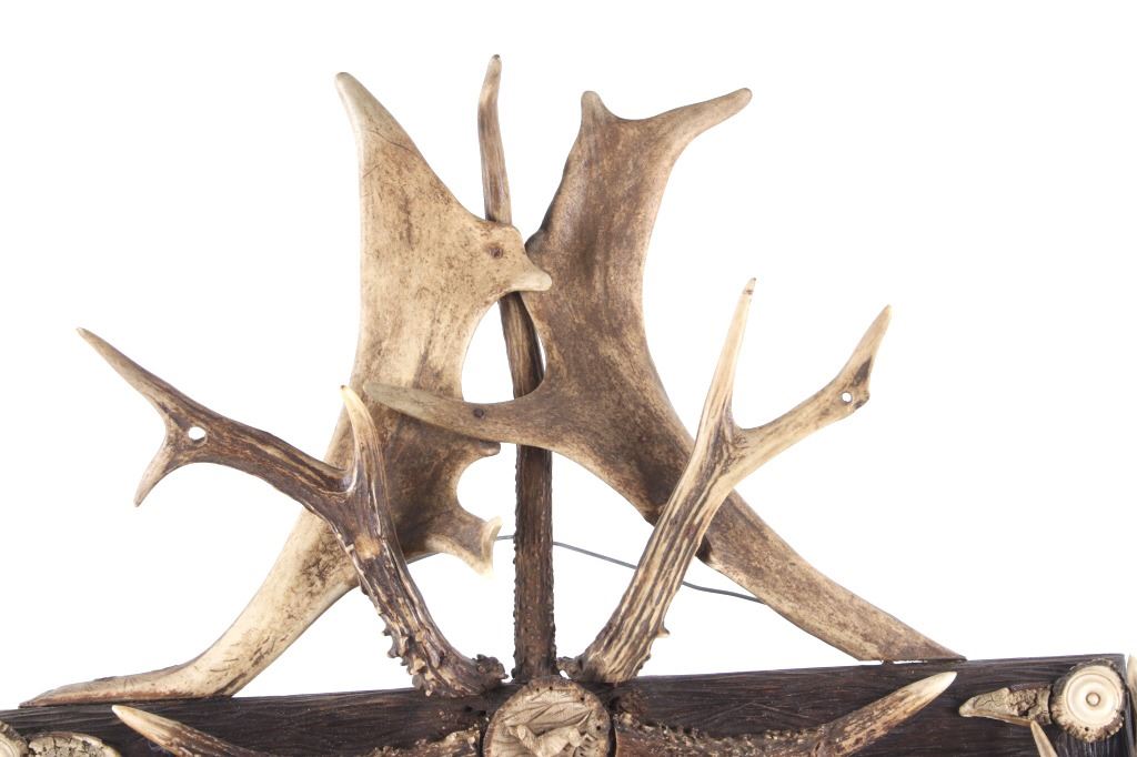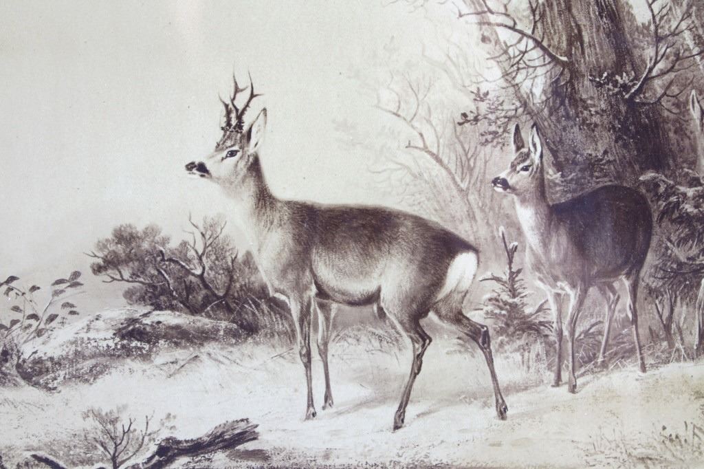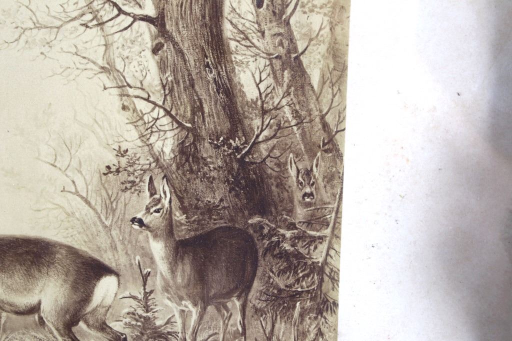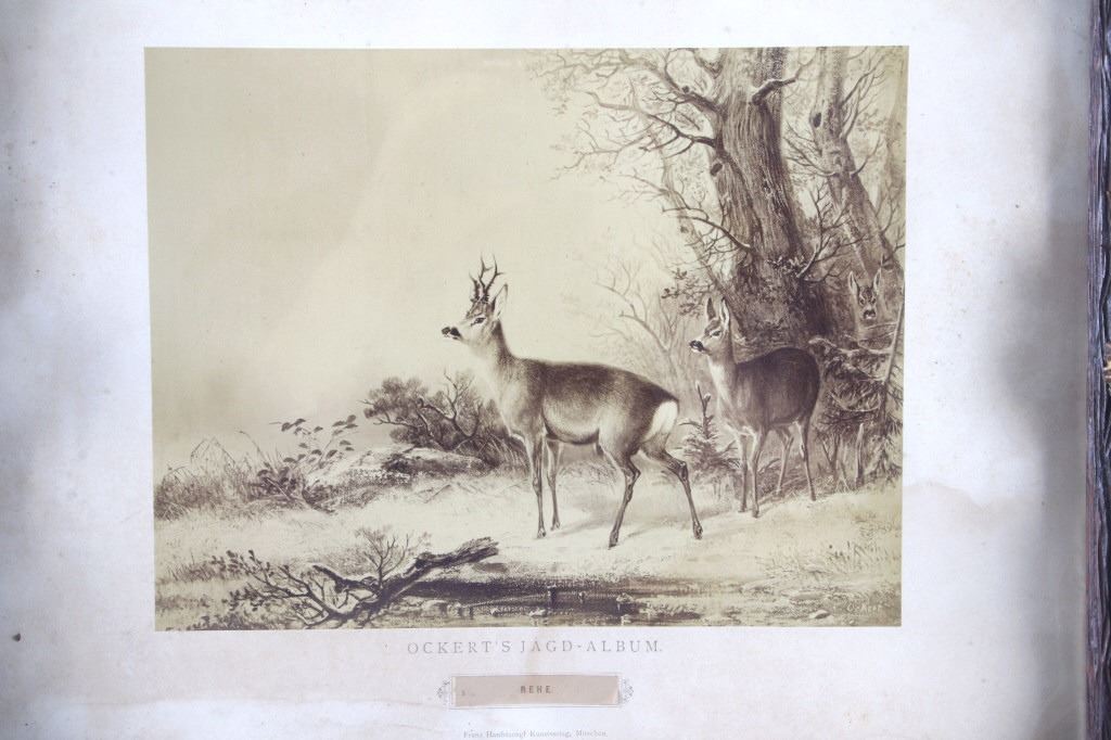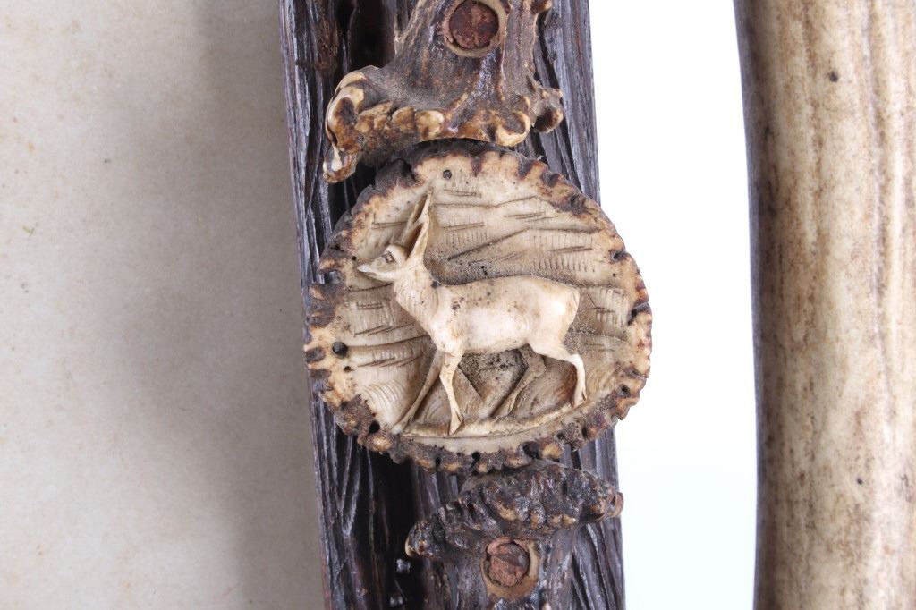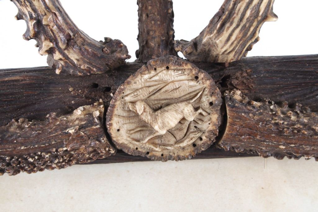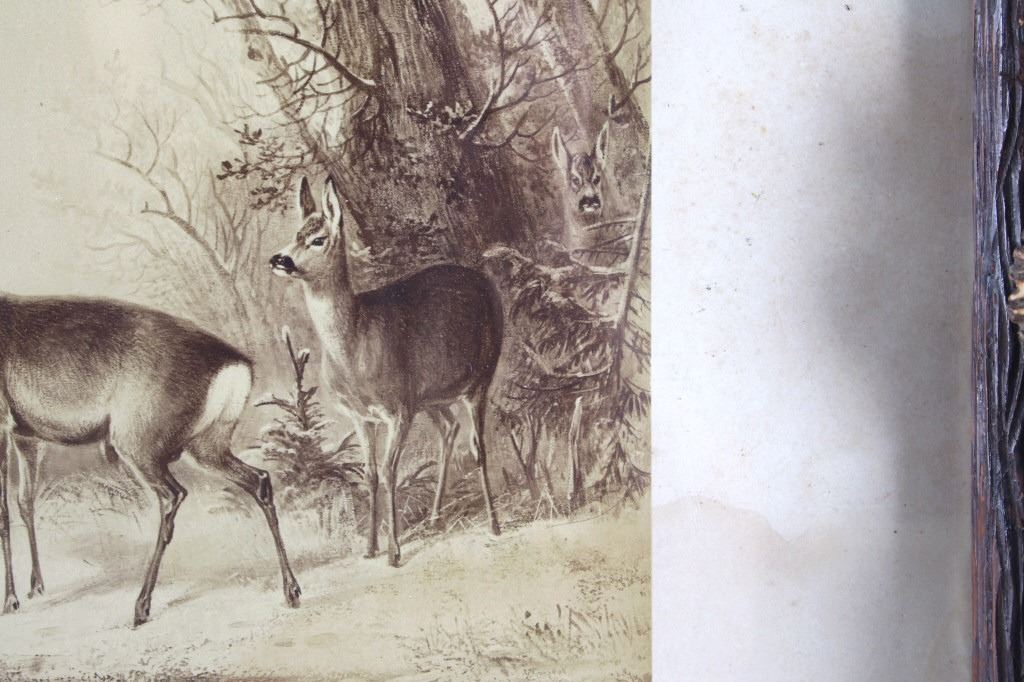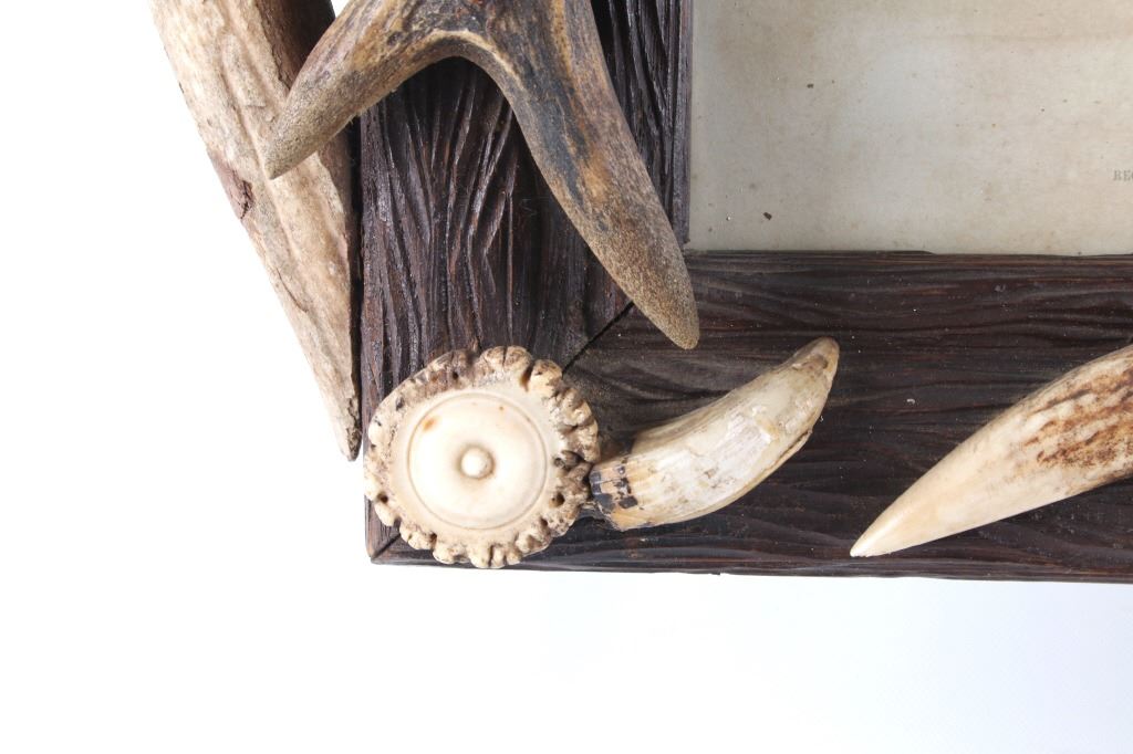 Featured in this lot is this antler frame and photogravure with a hunting scene from Ockert's Jagd-Album, a well-known German hunting art series from the 19th century. Franz Hanfstaengl Kunstverlag, Munich, a well-known German fine art publisher recognized for creating superior hunting and wildlife prints, is the publisher of this finely detailed lithograph, "Rehe" (Roe Deer). The artwork features roe deer, an animal closely linked to the European hunting tradition, in a tranquil forest setting. This frame is created from real antler that has been carefully placed to produce a rough and elaborate look reminiscent of the luxurious hunting lodges seen in Austria and Germany. Antler burls that are hand-carved and feature a detailed relief of a standing or running deer adorn the frame. Hunting was both a hobby and a status symbol in the late 1800s, and as an expression of one's love for the sport, artwork such as this was frequently hung in game rooms, hunting cabins, and estates. The piece is a wonderful example of 19th century European hunting artistry. The works of the renowned German art printing company Franz Hanfstaengl are still very sought-after today. It shows good condition overall with slight wear present to the frame and wear present to the photogravure, but no major signs of damage noted. The visible art measures 8 1/4" L x 10 5/8" W, while the entire piece measures 29 3/4" L x 23 1/4" W x 4 1/4" D. It weighs 10 pounds and 14 ounces.