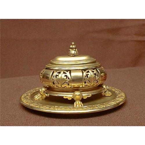 <table width="100%" border="0" cellspacing="0" cellpadding="4"><tr><td><em> An unusual bronze matchstrike</em></td></tr><tr> <td width="100%"> A 19th C. bronze dore matchstrike on oval base. The body of this paw-footed oval matchstike holder has both flat and pierced panels depicting leaf forms. Beneath the lid is the strike plate.