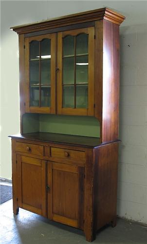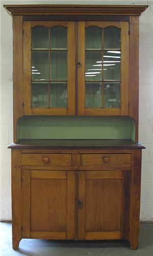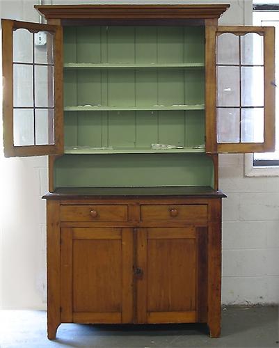19th C. Pennsylvania poplar stepback cupboard; overhanging cornice over two doors; each with six glazed panels; the top two with scalloped top; sits on cabinet base with two short drawers over two recessed panel doors; straight bracket feet; C.1830; provenance - purchased at the New Hope Pennsylvania Antiques Show in 1977 (normal wear)
