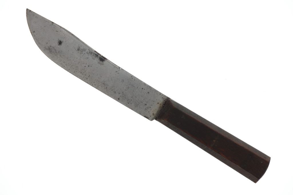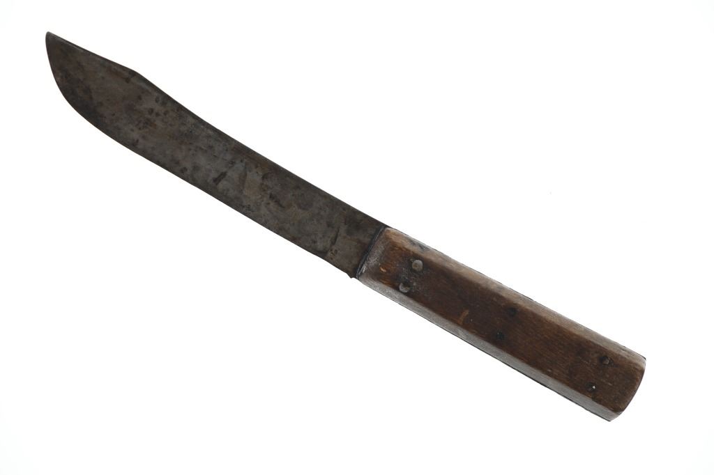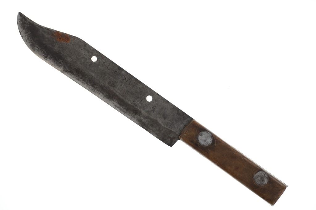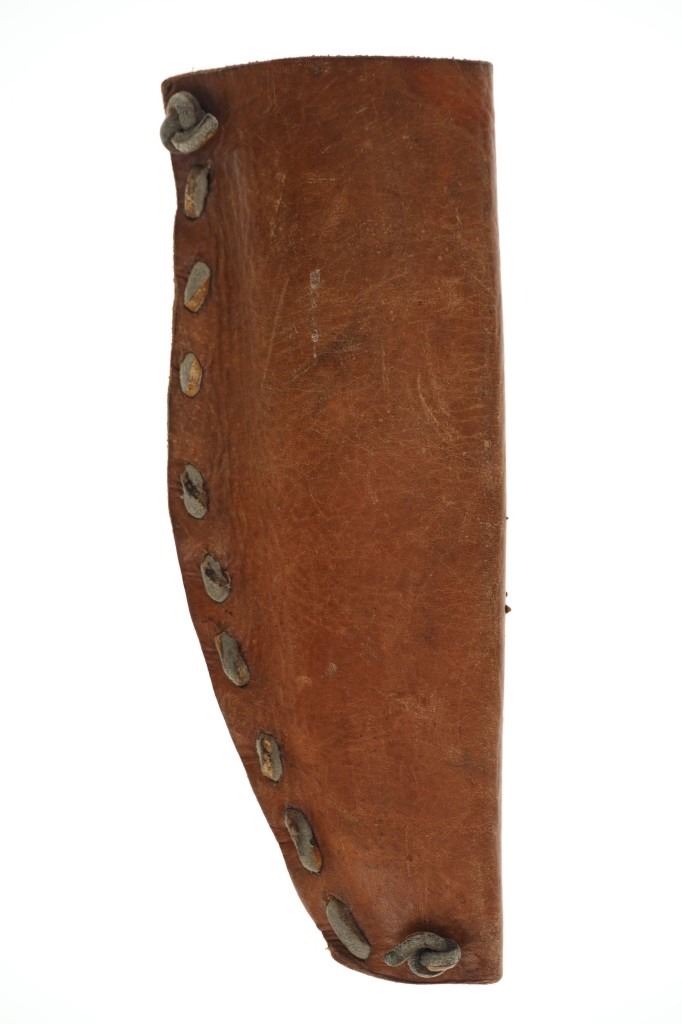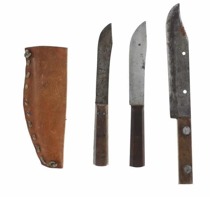 Featured in this lot is this Plains Buffalo / Bison Skinning belt knives set circa 19th century with a 20th century leather sheath. There are three Plains Indians belt knives in this collection with one leather sheath. Two of the knives are unmarked with clip points and wooden handles; and the third knife shows a Bowie fighting knife design with a clip point and is etched "LEM - 5-1-36" and is believed to be etched well later than its origin. The leather sheath is a 20th century thick leather sheath with buck stitching to secure it together. The condition of this collection of Plains belt knives and sheath is preserved with oxidation and a slight patina adorning the blades and the handles of all three knives with some slight wear to the leather sheath. The measurements of this collection of knives and sheath is 13" x 1 5/8" and 10 3/8" x 1 1/4" and 10 1/4" x 1 1/8" for the knives and the sheath measures 8 5/8" x 3 1/4".