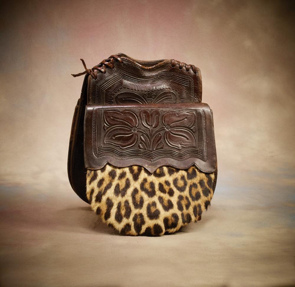 Scarce and very decorative 1880s-90s California pommel bags with raised incised tooling in the Main & Winchester tradition. Hair is probably not original and remnants of an interior holster pocket remains. Otherwise good condition