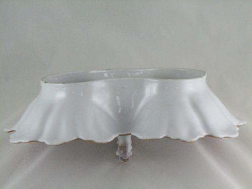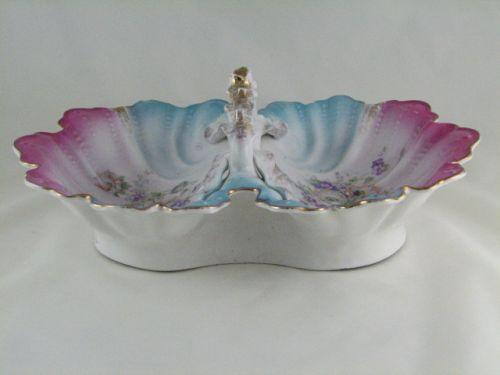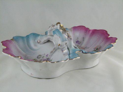 19th C. 2-part Dish with handle. Marked: 4317 in gold. Features scroll relief with floral transfer with graduating pink and blue on edge with gold highlighted handle. One star crack and crack on one side handle. Dimensions: 4.5"H x 13.5"L x 10"W