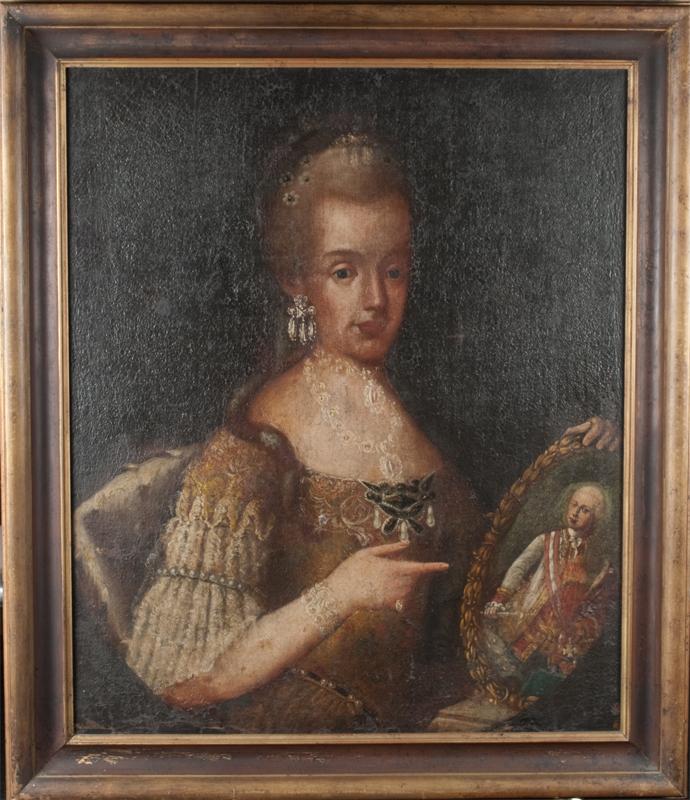 Stylistically painted old portrait of a noble lady, probably French and probably after an 18th century French artist. Lined canvas, measures 30.25" H x 25" W. Craquelure throughout and in a newer period frame. Private collection Rochester Hills, Michigan.