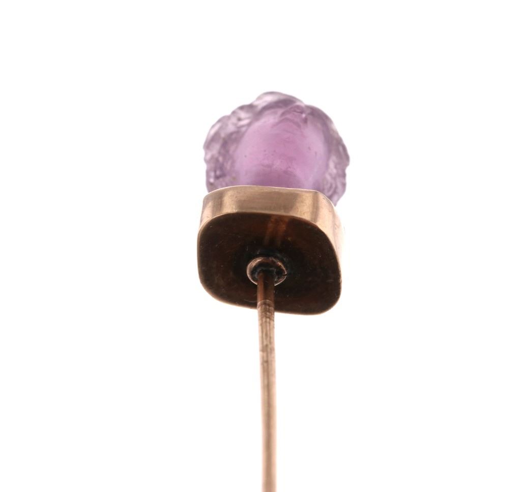 This lot has a fantastic 19th Century Purple Tourmaline Bust 9k Gold Stick Pin. The antique original stick pin is from an old West Virginia estate collection. Tourmaline is a fairly popular gemstone, but, purple tourmaline is not easily found. They have the ability to absorb light in different ways from different angles, a phenomenon known as pleochroism. While purple gemstones aren’t as common as stones of other colours, they remain popular because of how rare they are, and very few of them need to undergo any treatments to enhance their natural hues. The depth and layering of their colours and facets make for beautiful trinkets that stand out in a way that most other stones don’t. Purple also goes very well with all colours of metal, so these gems can be used in almost every kind of jewellery setting. While white metals like silver, white gold and platinum give purple stones a more contemporary look, rose and yellow gold settings make the jewel look more vintage. This stick pin was most likely made for a daughter, the small bust appears to be that of a younger female.