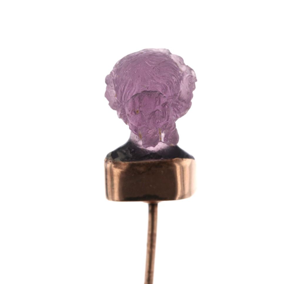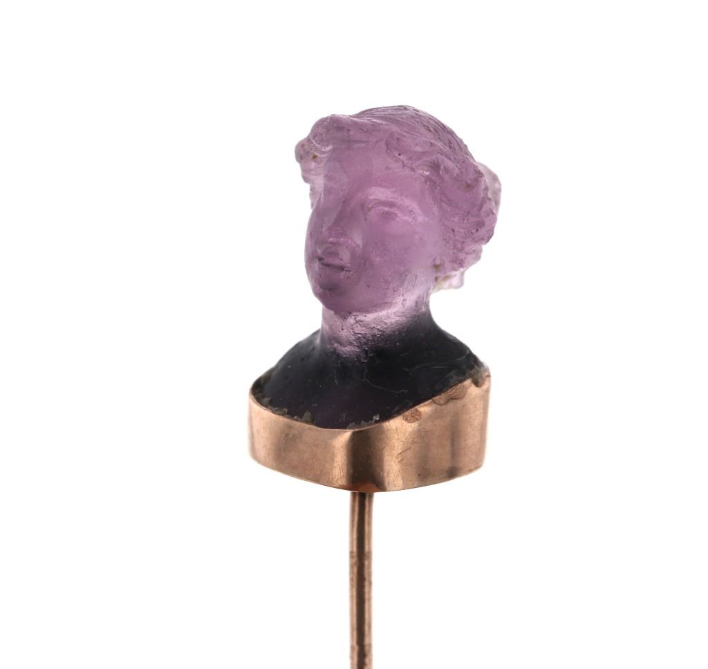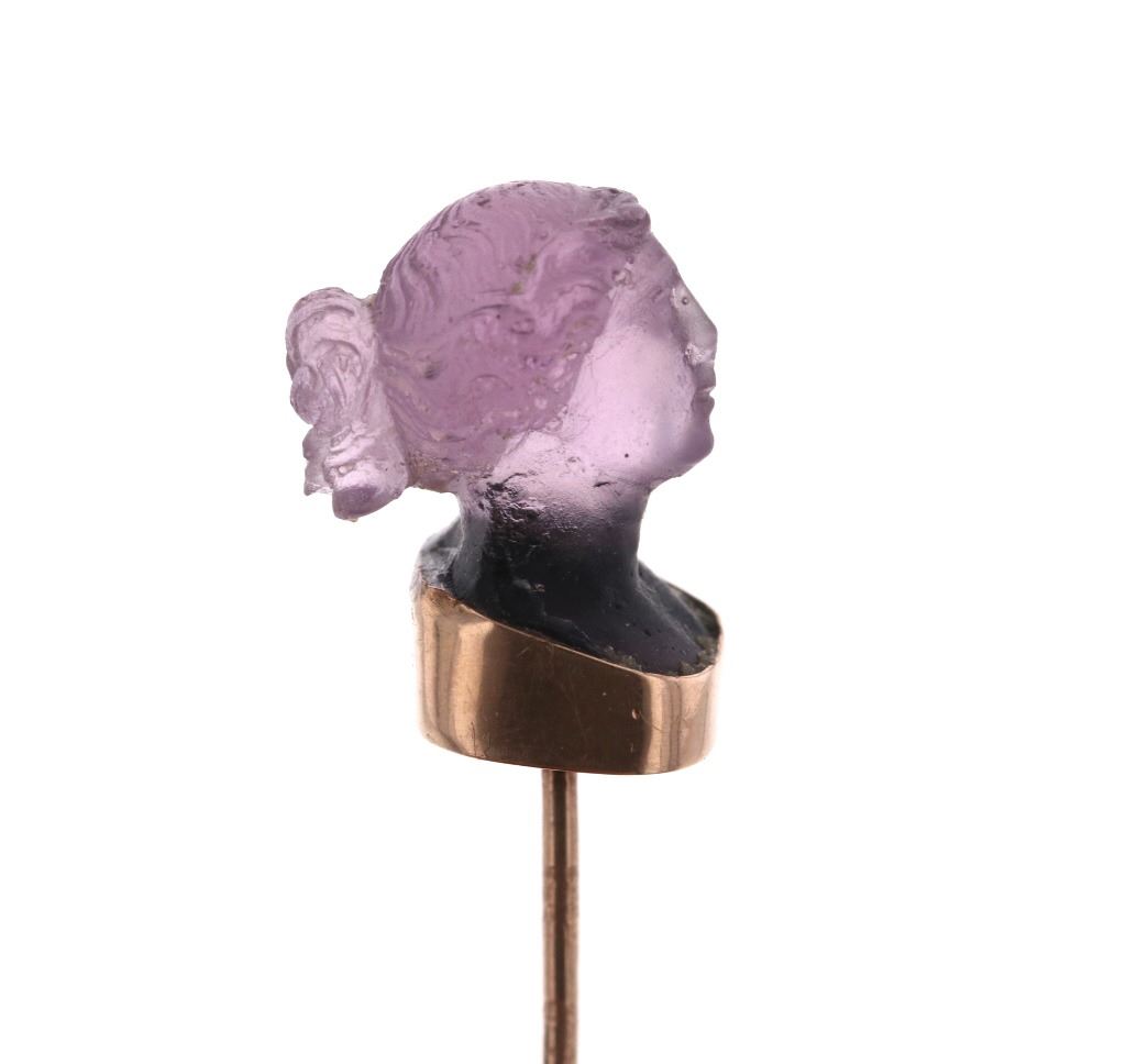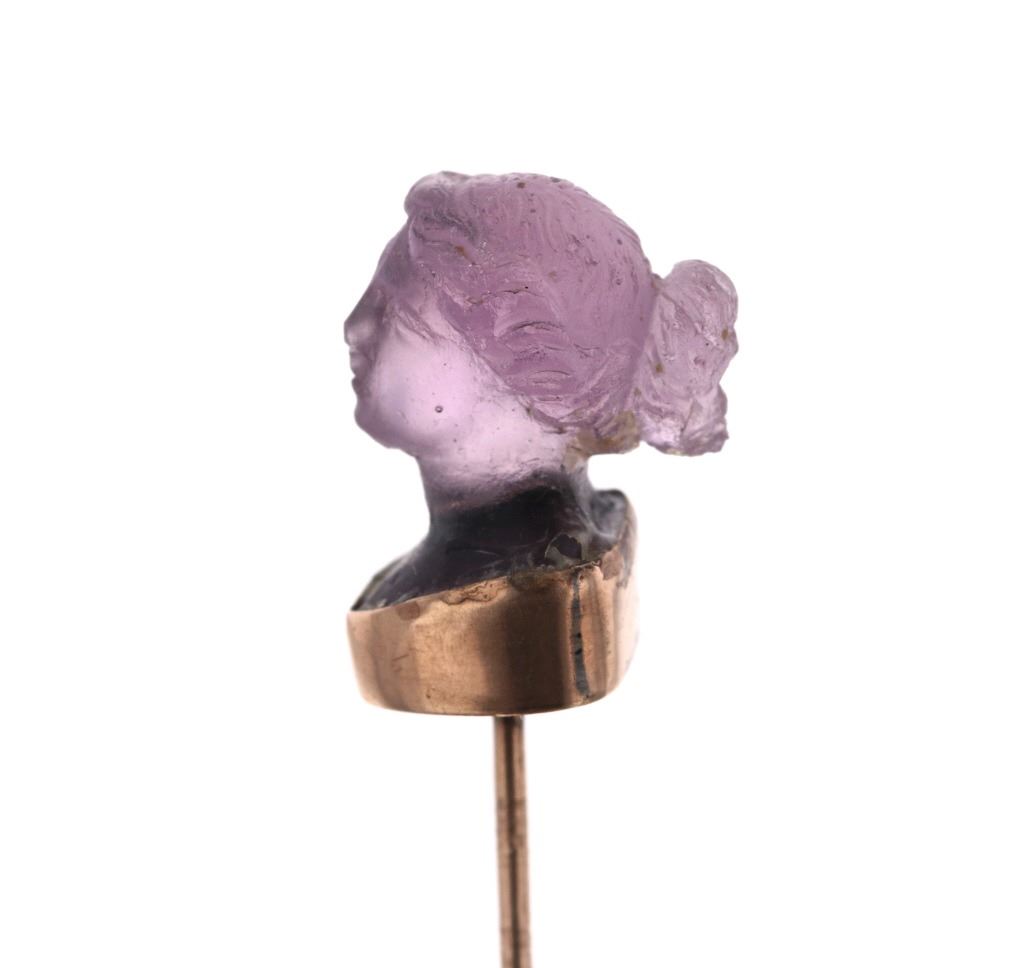 This lot has a fantastic 19th Century Purple Tourmaline Bust 9k Gold Stick Pin. The antique original stick pin is from an old West Virginia estate collection. Tourmaline is a fairly popular gemstone, but, purple tourmaline is not easily found. They have the ability to absorb light in different ways from different angles, a phenomenon known as pleochroism. While purple gemstones aren’t as common as stones of other colours, they remain popular because of how rare they are, and very few of them need to undergo any treatments to enhance their natural hues. The depth and layering of their colours and facets make for beautiful trinkets that stand out in a way that most other stones don’t. Purple also goes very well with all colours of metal, so these gems can be used in almost every kind of jewellery setting. While white metals like silver, white gold and platinum give purple stones a more contemporary look, rose and yellow gold settings make the jewel look more vintage. This stick pin was most likely made for a daughter, the small bust appears to be that of a younger female.