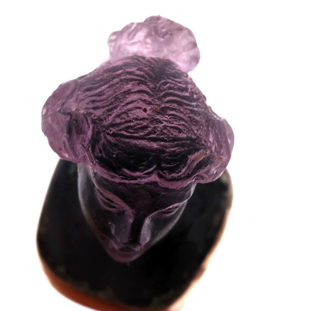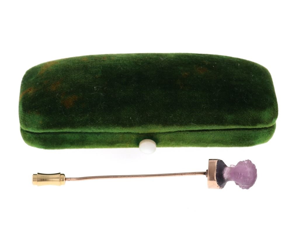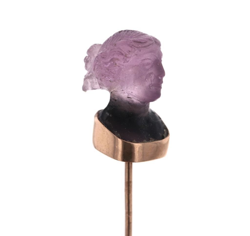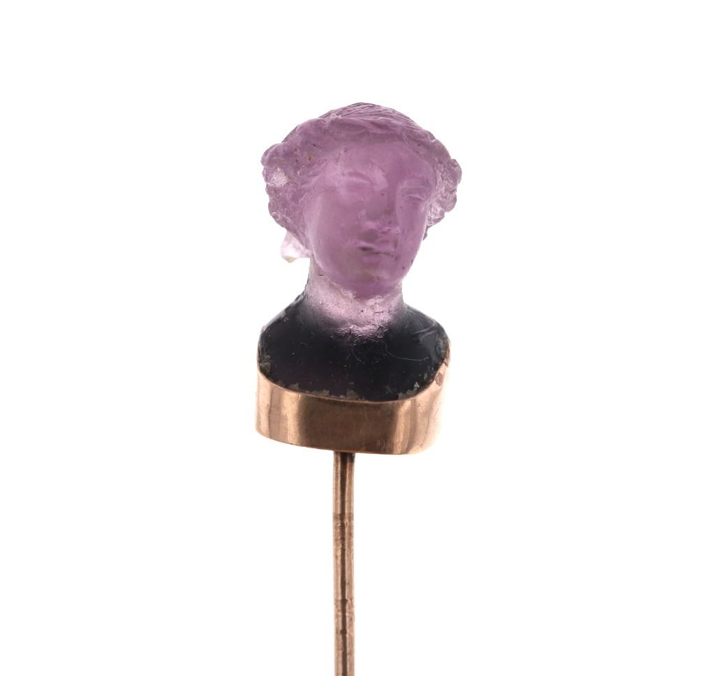 This lot has a fantastic 19th Century Purple Tourmaline Bust 9k Gold Stick Pin. The antique original stick pin is from an old West Virginia estate collection. Tourmaline is a fairly popular gemstone, but, purple tourmaline is not easily found. They have the ability to absorb light in different ways from different angles, a phenomenon known as pleochroism. While purple gemstones aren’t as common as stones of other colours, they remain popular because of how rare they are, and very few of them need to undergo any treatments to enhance their natural hues. The depth and layering of their colours and facets make for beautiful trinkets that stand out in a way that most other stones don’t. Purple also goes very well with all colours of metal, so these gems can be used in almost every kind of jewellery setting. While white metals like silver, white gold and platinum give purple stones a more contemporary look, rose and yellow gold settings make the jewel look more vintage. This stick pin was most likely made for a daughter, the small bust appears to be that of a younger female.