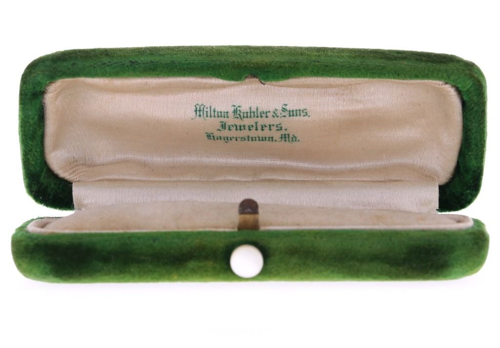 The stick pin is in good overall condition, the stone is intact. The green velvet case is in good overall condition, lock mechanism is in good working condition, soiling noted. Pin measures 3"L