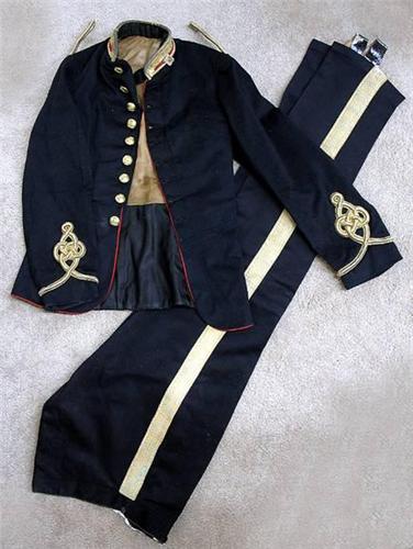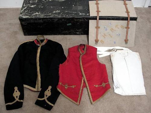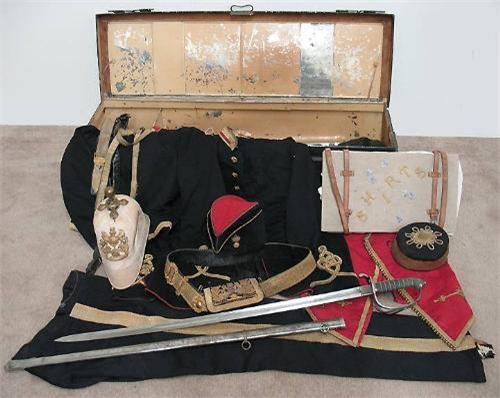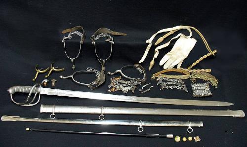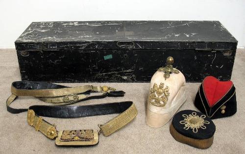 19th C. Royal Canadian artillery officer's uniform and equipment in tin campaign locker; including dress jacket; dress vest; dress pants; dress waist coat; three pair of spars (one brass and two steel); shirt with custom shirt binder with leather straps; felt folding field hat; dress hat (Bellman style); soft dress pith helmet; swagger stick with sterling top marked AEU9050059; chrome sword scabbard; dress sword with scabbard (sword marked Maynard Harris & Co. Leadenhalls London) black soft leather carrying bag; 4" x 4" piece of leather with chain front; dress belt with metal braided front pouch; seven boot chains; dress sword belt with shoulder strap; box of assorted uniform items; and one white kid glove; C.1880; (overall condition is good)