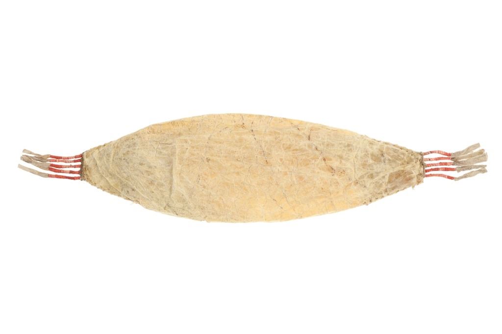 This is an exceedingly rare beaded buffalo bladder quill container both beaded and quilled from the Sioux of the Northern Plains collected from Fort Yates in North Dakota Territory. The piece exhibits a buffalo / bison bladder overlapping with Indian tanned hide trapezoid ends sinew sewn and covered in a geometric tab design having colors of red white heart, greasy green and chalk white. The ends have Indian tanned hide fringes wrapped in porcupine quill quillwork with natural red ocher mineral pigment coloring. The bag has an elliptical shape with the bladder flaps overlapping at least half. The top flap has an old red stroud trade clothe border secured with hoof glue and sinew and adorned with more beadwork. The inside contains a collection of porcupine quills tha thave been dyed blue, red and yellow. These bags are uncommon with this being a well preserved 1800's example with sinew sewing and both quillwork and beadwork. Measures overall 14.5"L by 3.5". The hide is stiff as well are the fringes.