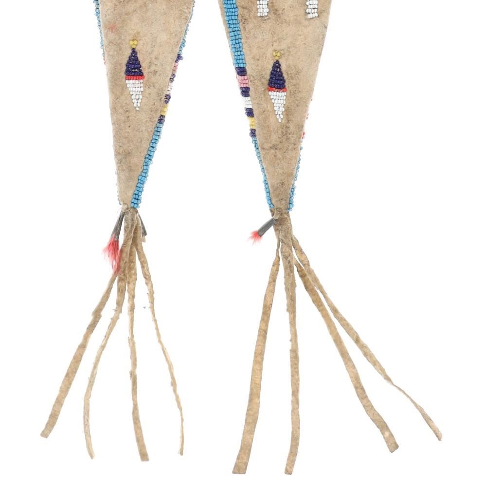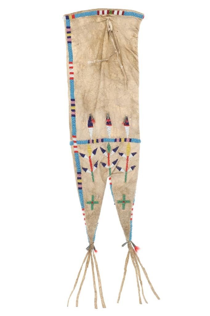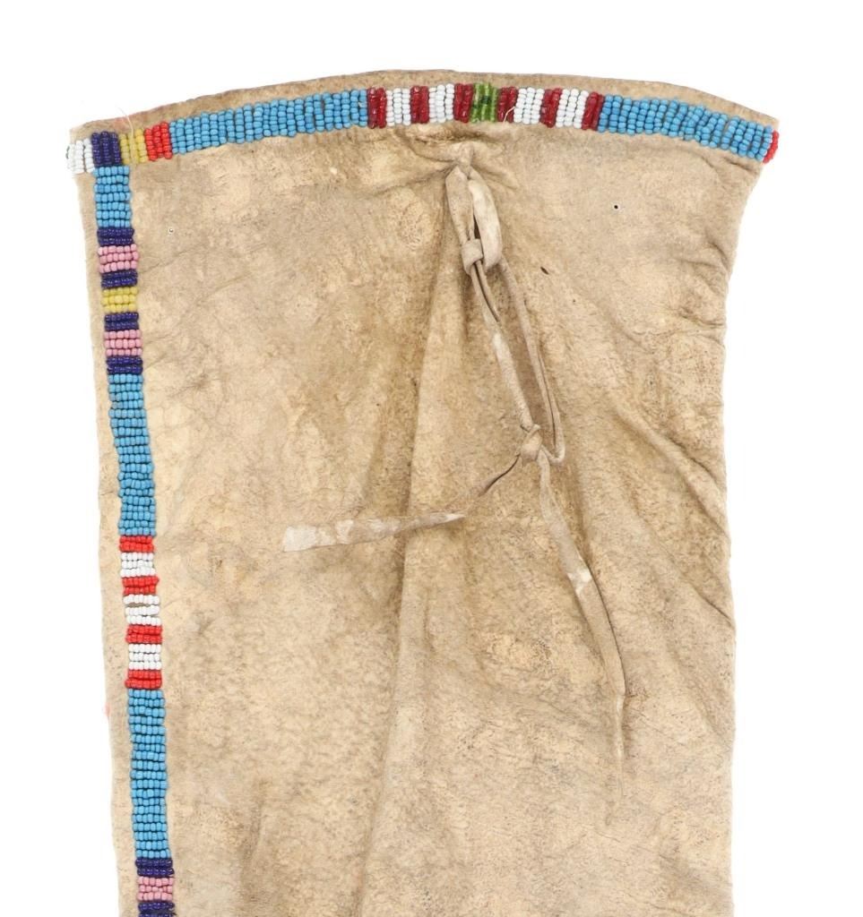 This is a fantastic 19th Century beaded hide large pipe bag with rare double tab design and buffalo track beadwork from the Sioux of the Northern Plains collected from Fort Yates in North Dakota Territory. The bag exhibits Indian tanned buffalo / bison hide being sinew sewn and in a scarcely seen double tab or tail pattern, not often seen on full-size large pipe bags. The bag exhibits 1800's period glass trade seed beads with a buffalo track, geometric and stalk pattern. The colors include greasy blue, chalk white, greasy yellow, Cheyenne pink, red, cobalt, medium green, semi-transparent green and semi-transparent red. The bag has the original hide tie straps and long hide fringes on the bottom with rolled tin jingle dangle cones and red dyed plue feathers. There are various strands of sinew exposed, an early beadwork feature. The bag also shows cross, diamond features. The bag is similar to the circa 1870 Lakota Beaded Pipe Bag with double tab as well offered from Morning Star Gallery for $24,000. The bag is well kept with some stiffened areas but mostly supple with little bead loss. Measures overall 27"L by 7"W.