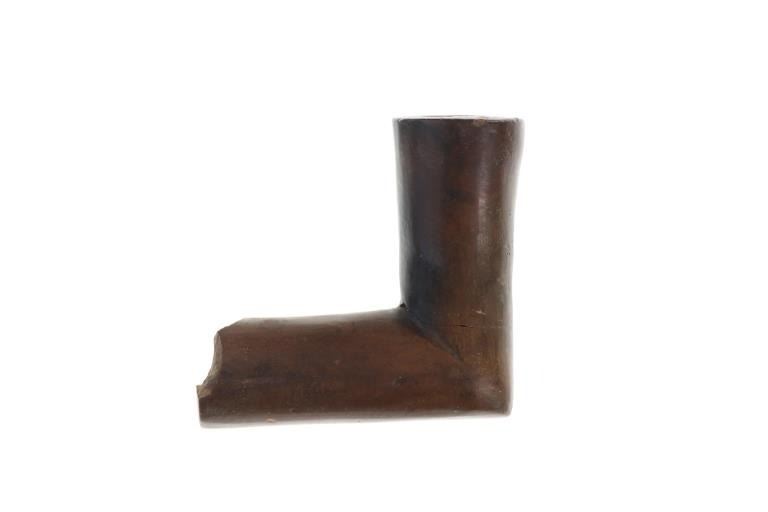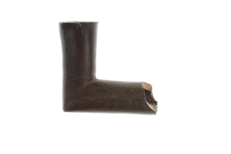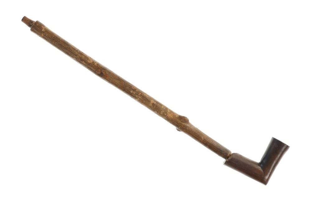 The lot features a 19th-century elbow pipe and wooden stem from the Sioux of the Northern Plains from the ex-C.M. Russell Museum Great Falls, Montana and John Kleinschmidt collections. The pipe bowl is carved from hardstone with a very dark black / grey to tan / red coloring, with a well smoked bowl. The bowl has a repair at the elbow and chipping / damage at the pipe end. The stem is carved from a tree branch and has a nice dark coloring. The piece dates to the 19th century / 1800’s.