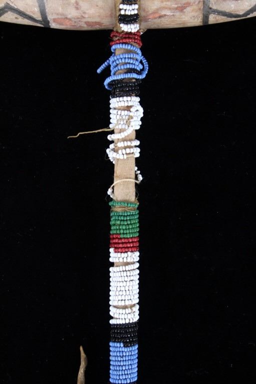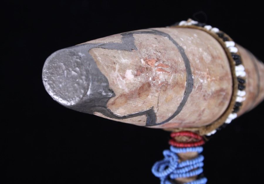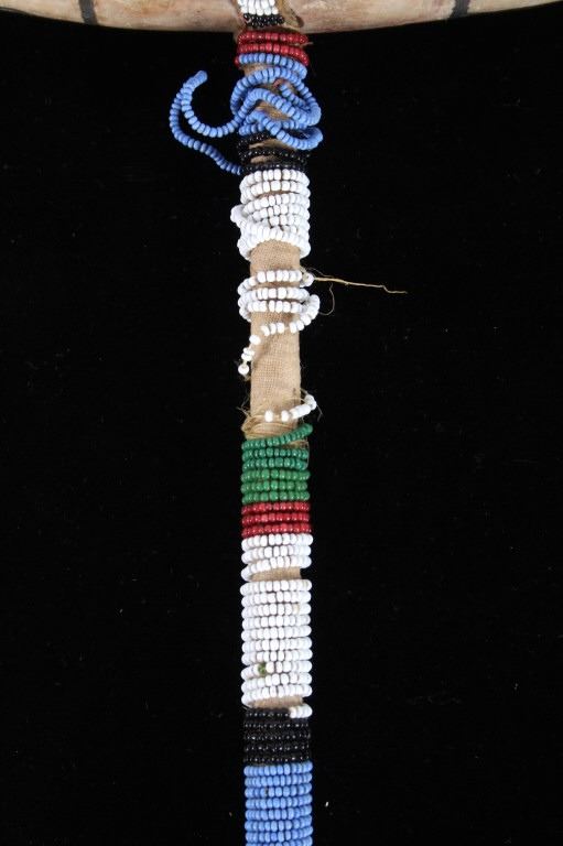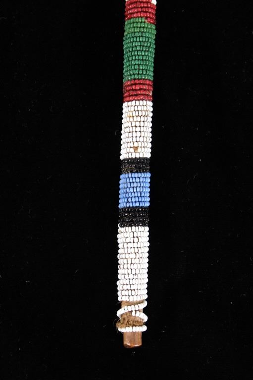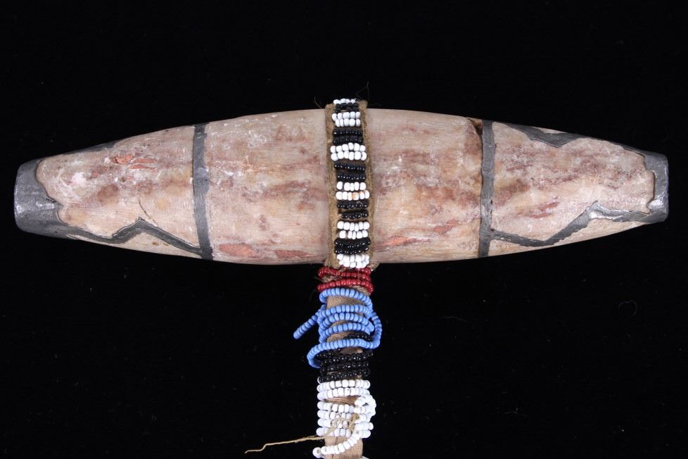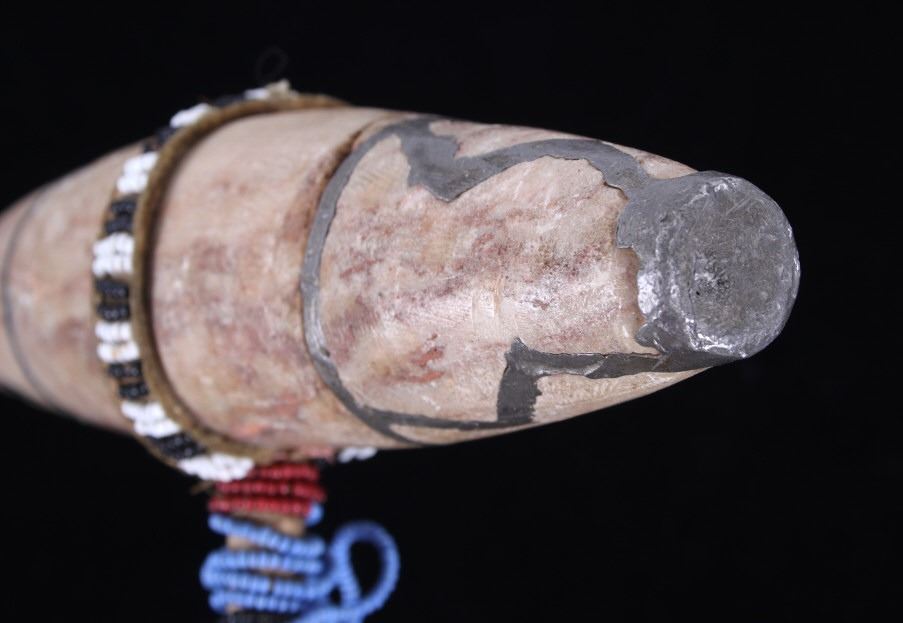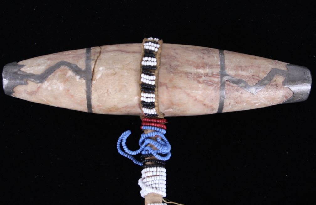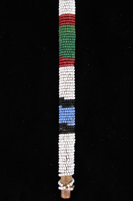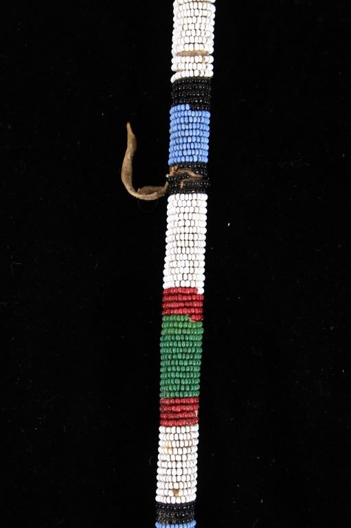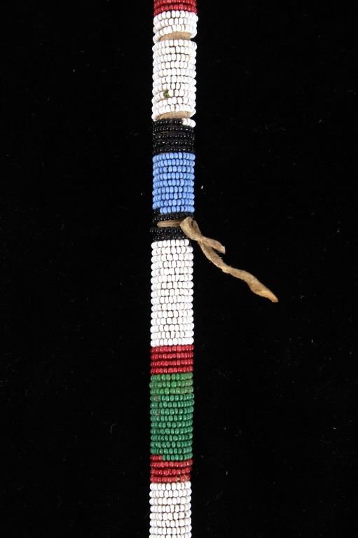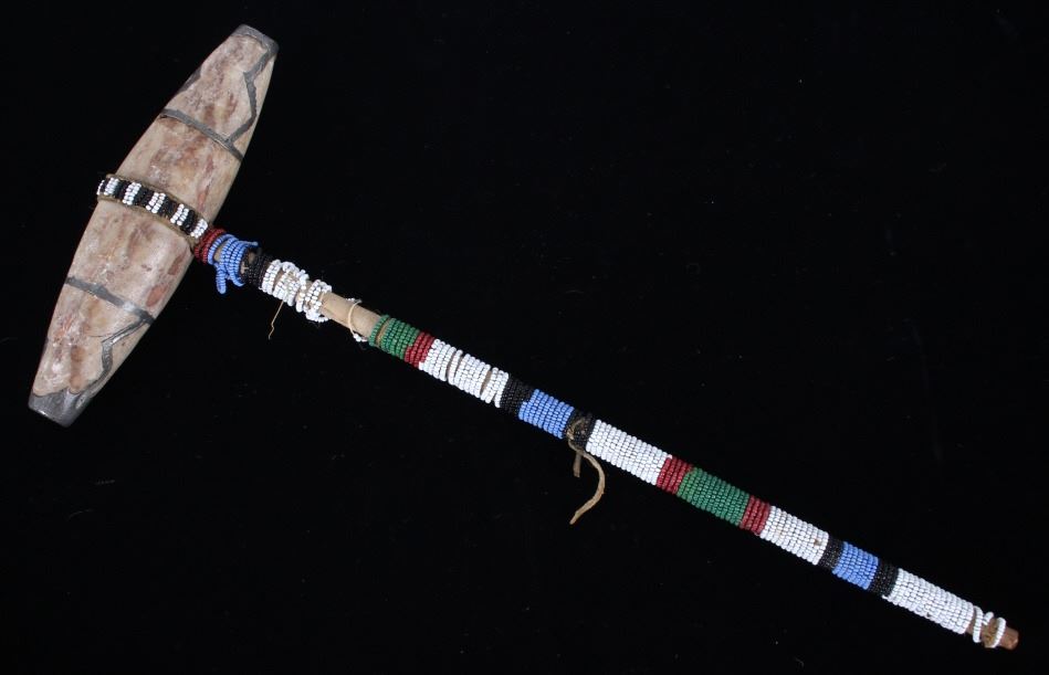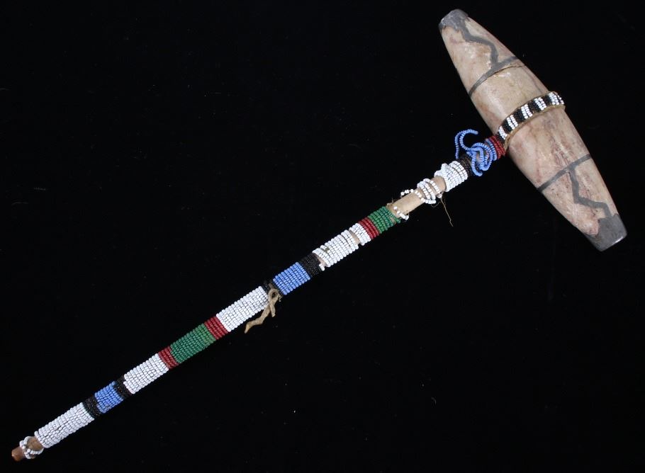 The lot features a beaded war club with pewter inlaid stone skull cracker head from the Sioux Indians of the 19th Century. The club features a bi-point solid stone carved head with geometric pewter inlaid ends and designs secured to the wood haft handle with wrappings of sinew and Indian tanned hide. The wood haft is wrapped in muslin trade clothe with banded geometric beadwork which is sinew sewn. The beadwork is all 1800's glass trade seed beads in colors of red white heart, chalk white, black, greasy medium green, medium blue. Each stone head end shows a flat end with three zig-zag lightning pattern connected with a single band towards the center. Truly a fine piece with rare pewter inlay from the 1800's. Measures 15.5"L by 7"L by 1 7/8" by 1.75".