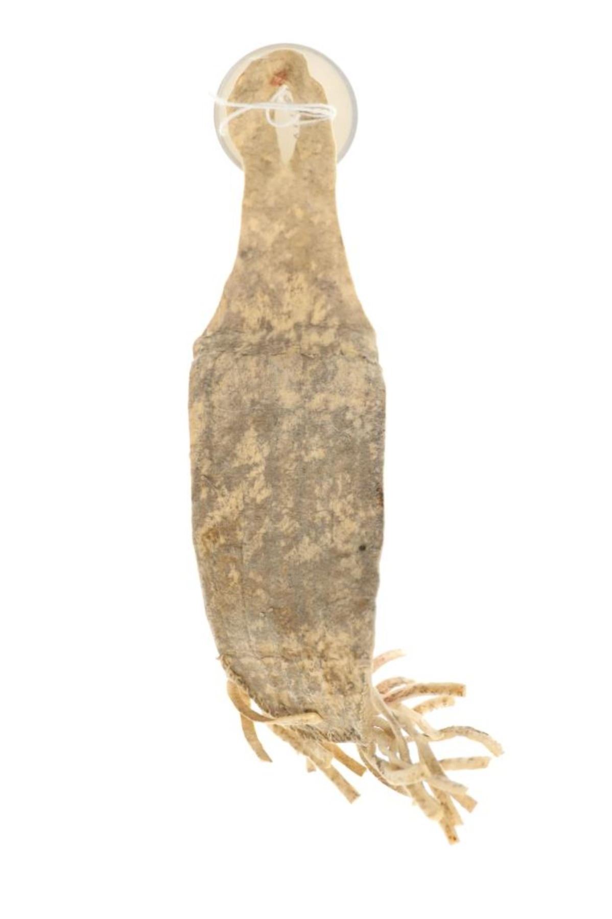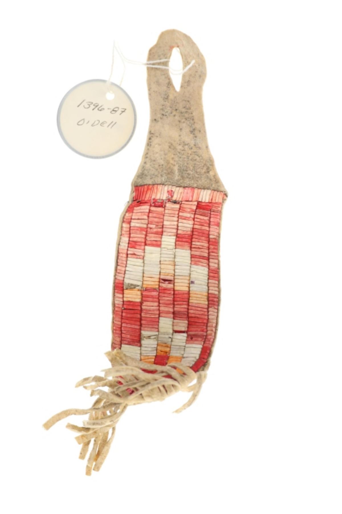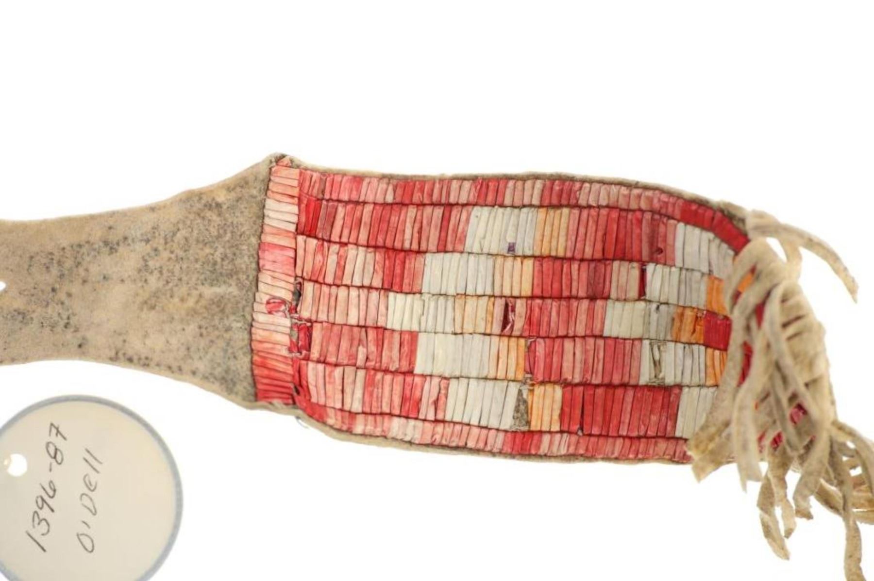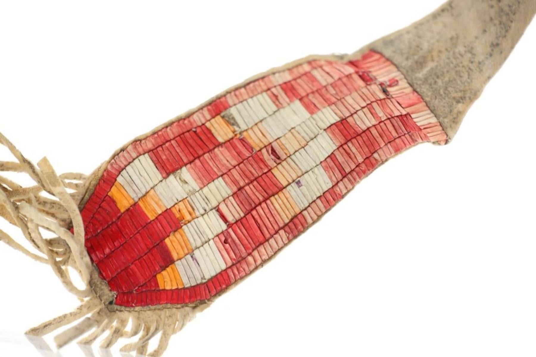 The lot features an Indian tanned hide quilled tomahawk war club drop from the Sioux in the 19th-century from the ex-C.M. Russell Museum Great Falls, Montana and John Kleinschmidt collections. The piece exhibits Indian tanned hide covered in porcupine quill quillwork with trade thread sewing. The quillwork has a nice geometric design with colors of red, orange both in natural mineral pigment dyes as well as natural cream / white. The top has a slit cut out and would have been on a war club or tomahawk and would have hung from the gripping handle, commonly referred to as a drop.
