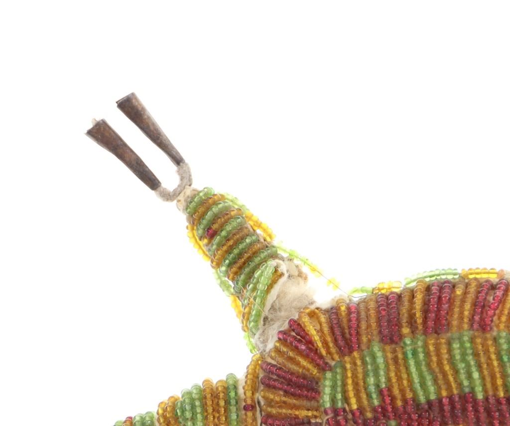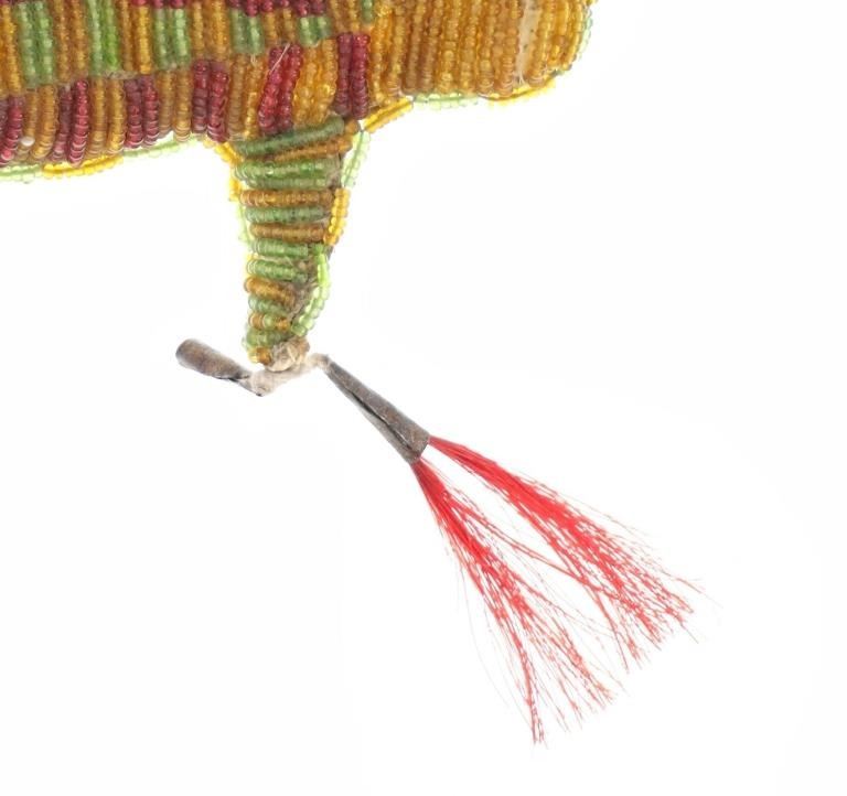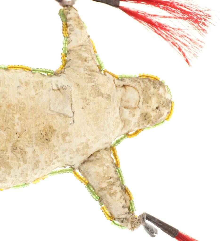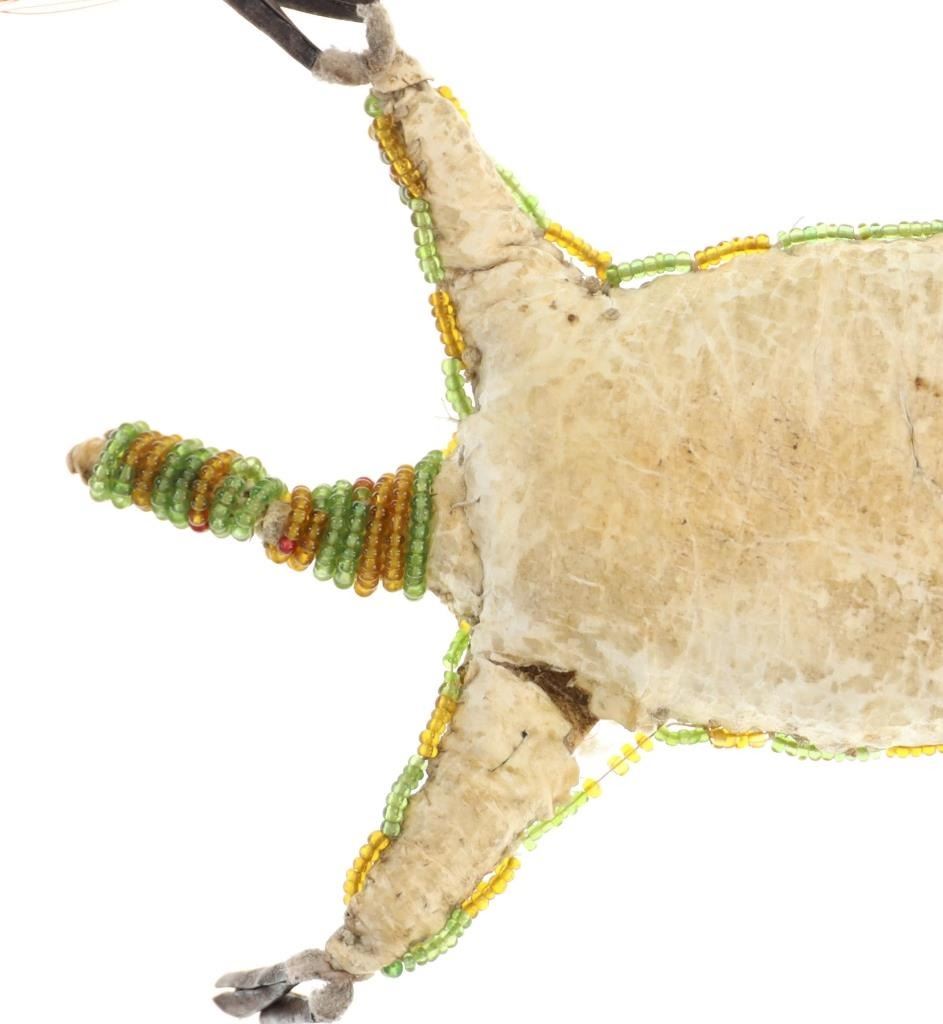 This is a fantastic 19th Century umbilical cord turtle fetish from the Sioux of the Northern Plains collected from Fort Yates in North Dakota Territory. The piece exhibits Indian tanned hide with sinew sewing covered in period 1800's glass trade seed beads with a geometic pattern showing colors of amber, semi-transparent rose, semi-transparent green. The piece has a small tear which exposes the sheep wool and horse hair packing. There is some cotton thread as well as a good bit of sinew sewing as well with rolled tin jingle dangle cones at each corner with red dyed horse tail hair fringes. The bottom shows some worn through spots as well as some nice patina. The nice large umbilical cord fetish displays well, being very similar to the Sioux 19th Century fetish sold by Hindman Freeman's in 2022 for $2,500. There are a few cracks, including the tail, but the piece displays very well with some stiffness to the hide. Measures overall 6.5" by 8.5".