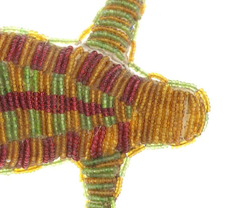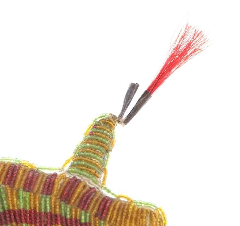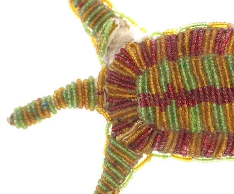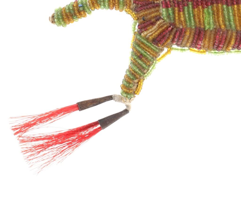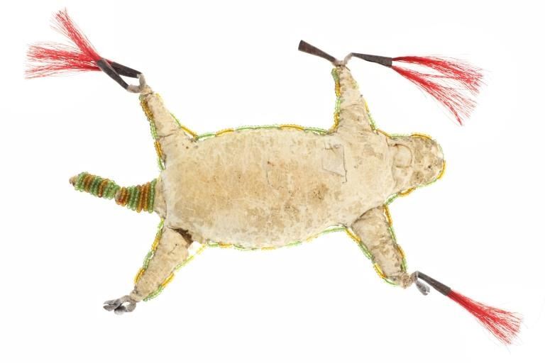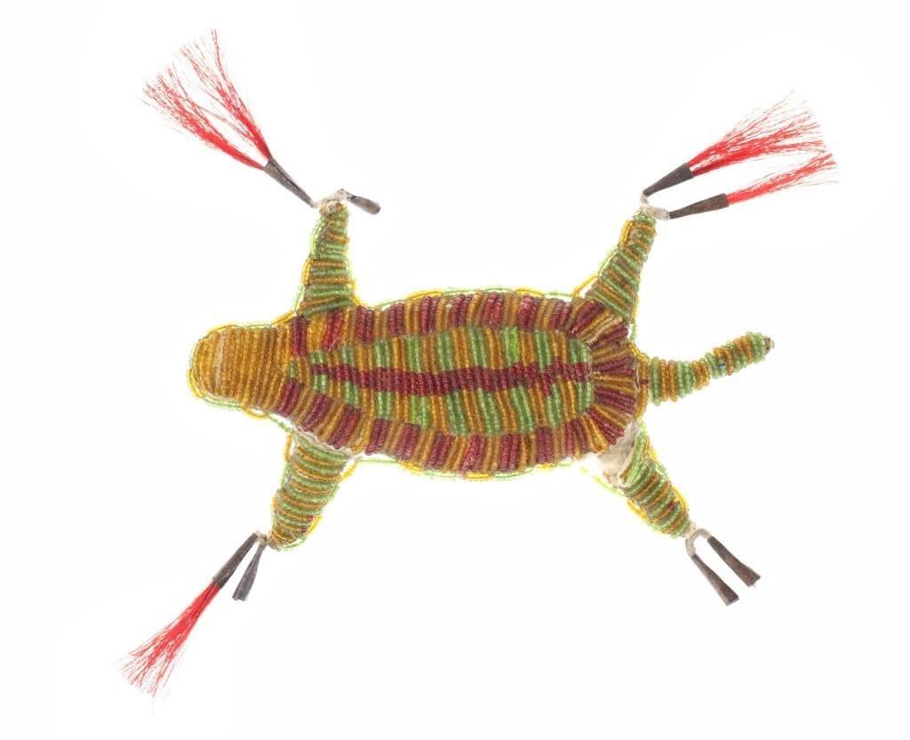 This is a fantastic 19th Century umbilical cord turtle fetish from the Sioux of the Northern Plains collected from Fort Yates in North Dakota Territory. The piece exhibits Indian tanned hide with sinew sewing covered in period 1800's glass trade seed beads with a geometic pattern showing colors of amber, semi-transparent rose, semi-transparent green. The piece has a small tear which exposes the sheep wool and horse hair packing. There is some cotton thread as well as a good bit of sinew sewing as well with rolled tin jingle dangle cones at each corner with red dyed horse tail hair fringes. The bottom shows some worn through spots as well as some nice patina. The nice large umbilical cord fetish displays well, being very similar to the Sioux 19th Century fetish sold by Hindman Freeman's in 2022 for $2,500. There are a few cracks, including the tail, but the piece displays very well with some stiffness to the hide. Measures overall 6.5" by 8.5".