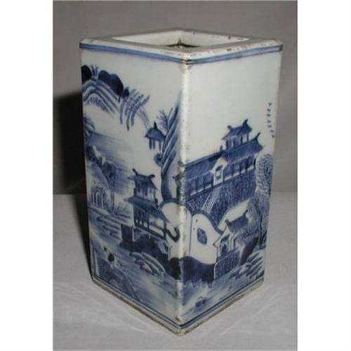 Good small 19thc. Chinese blue and white brushpot with landscape, condition has some minor age wear on the edges of the pot. Size 4 3/4 inches.