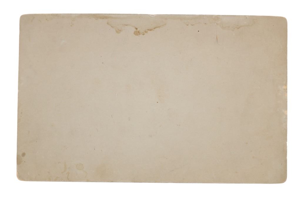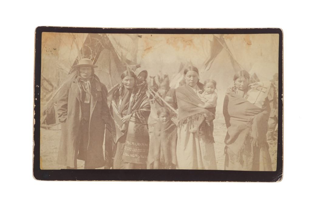 The lot features a Southern Plains Native American Indian family from the 19th Century large format photograph boudoir card. The imae shows a Southern Plains man with coboy hat and overcoat standing next to an older woman with wearing blanket and child on her back as well as a beaded necklace strand. Next to the woman is a small child with wearing blanket, another woman holding a child with wearing blanket and lastly a woman holding a fully beaded craddle board pappose, presumably with a baby in it, also with wearing blanket. This is an original photograph boudoir cabint card with gilt edge. The image has slight staining on the top and some edge wear, but overall great. Measures overall 8.5" by 5.25". U6