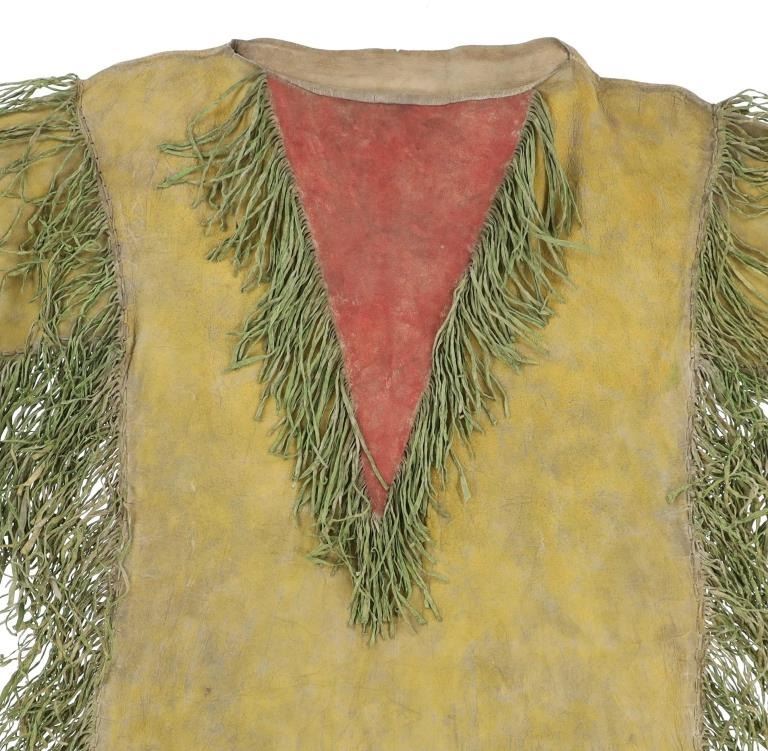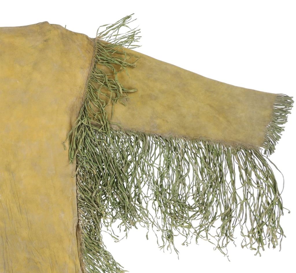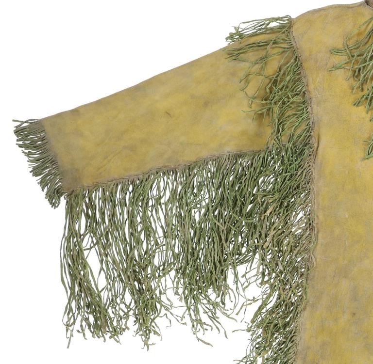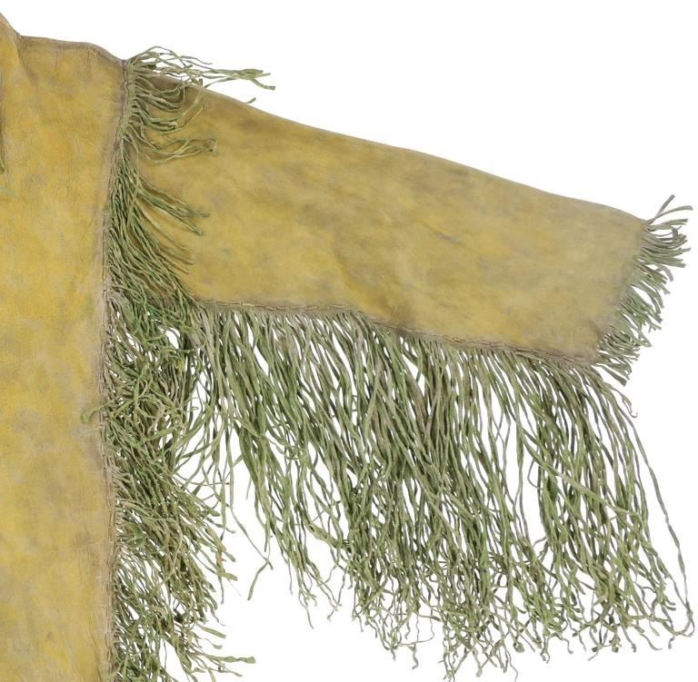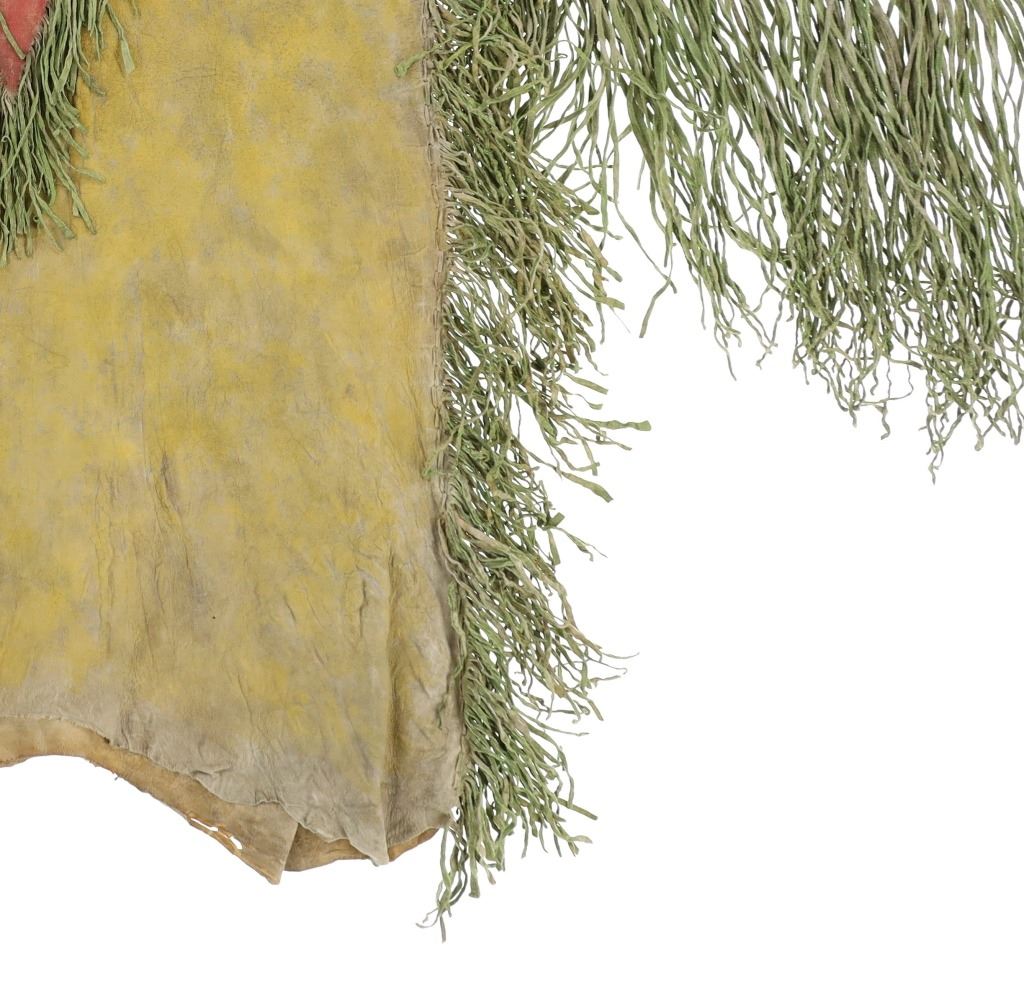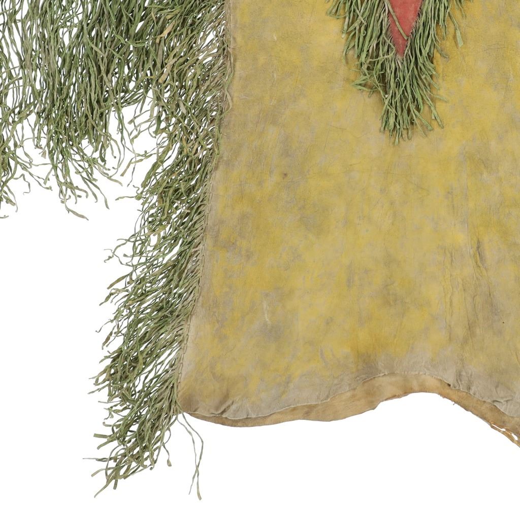 The lot features a 19th-century Southern Plains painted hide men’s shirt from a prominent private Billings, Montana collection. The piece exhibits a massive size comprised of Indian tanned hide that is sewn with hide lacing and trade thread and is covered in natural pigments yellow and red ocher and green natural pigment paints. The piece shows long frilly Indian hide fringes along the underside of the arms, inside edge of the shirt, along the bib and over the shoulders on both sides, all painted with green mineral pigment paints. The front shows a large “V” bib with green pigment painted fringe and red ocher / ochre painted center section. The shirt is in a classic Southern Plains men’s pattern with a nautral painted surface and little other decorations, commonly seen amongst the Comanche, Kiowa, Apache and Southern Ute. The shirt is very well kept with some patina but likely found little use. Provenance: From a prominent Native American private collection in Billings, Montana. The hide is well kept with mostly supple hides and little paint loss.For a similar shirt see the Circa 1880 Southern Plains painted hide shirt sold by Heritage Auctions in June 2023 for $13,750 which has a plain hide frilly fringed example with ocher paint. The shirt appears to be of an 1800's example, identified by one expert as such, but could be from late-19th century to early-20th century, truly a beautiful example. Measures overall 67-inches wide from end of cuffs by 42-inches tall from back of neck to bottom of shirt.