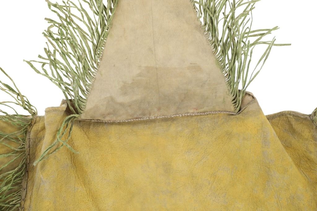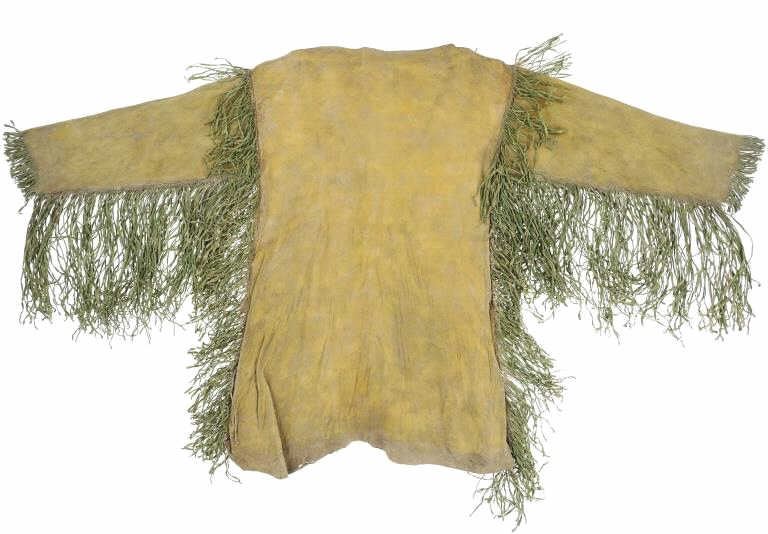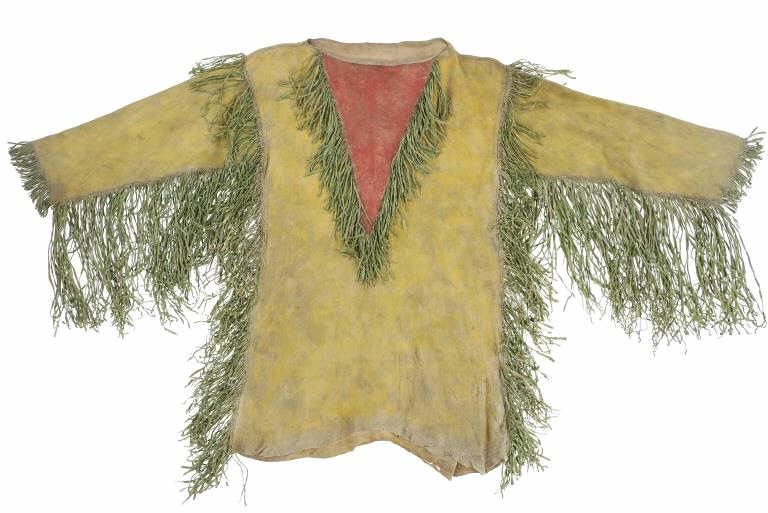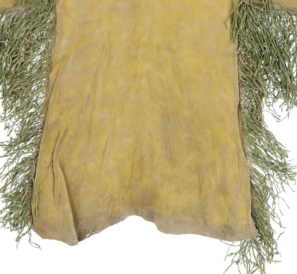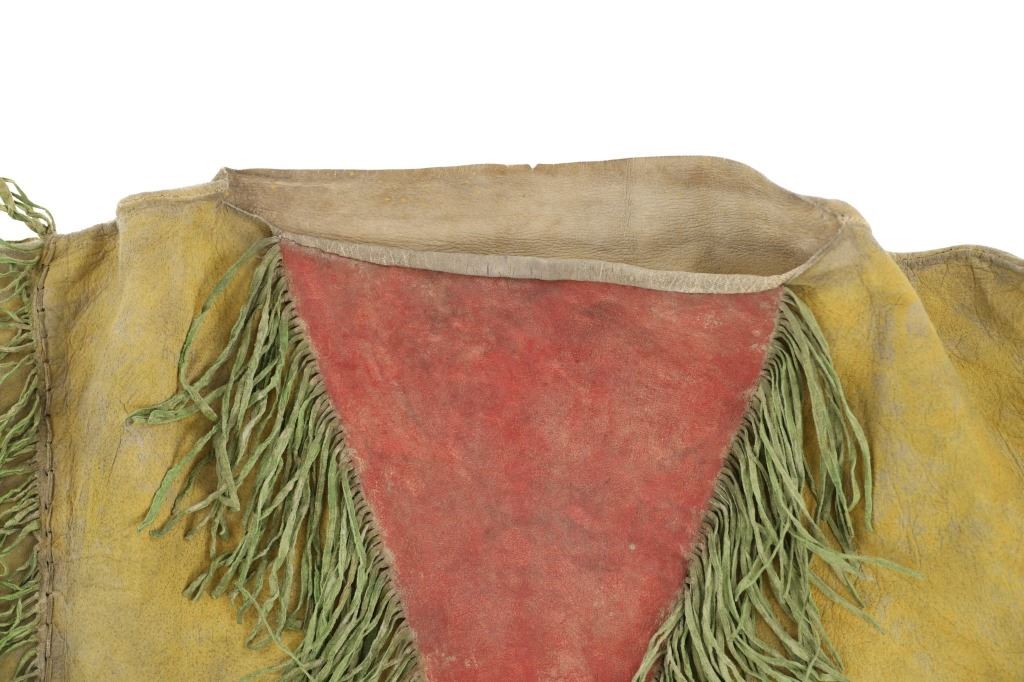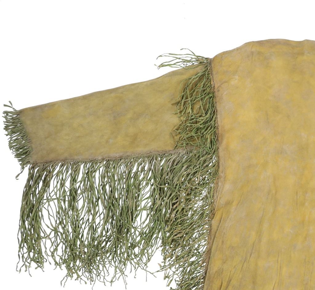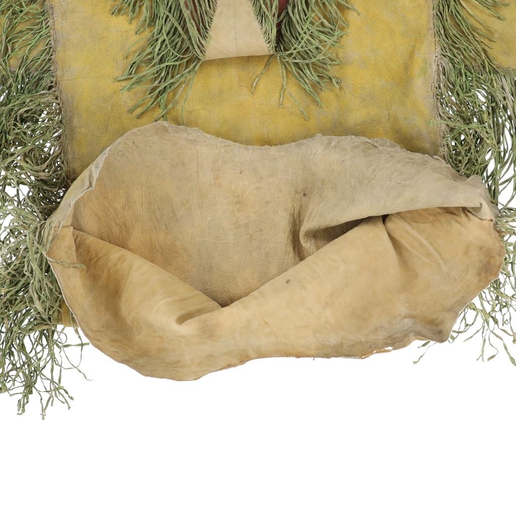The lot features a 19th-century Southern Plains painted hide men’s shirt from a prominent private Billings, Montana collection. The piece exhibits a massive size comprised of Indian tanned hide that is sewn with hide lacing and trade thread and is covered in natural pigments yellow and red ocher and green natural pigment paints. The piece shows long frilly Indian hide fringes along the underside of the arms, inside edge of the shirt, along the bib and over the shoulders on both sides, all painted with green mineral pigment paints. The front shows a large “V” bib with green pigment painted fringe and red ocher / ochre painted center section. The shirt is in a classic Southern Plains men’s pattern with a nautral painted surface and little other decorations, commonly seen amongst the Comanche, Kiowa, Apache and Southern Ute. The shirt is very well kept with some patina but likely found little use. Provenance: From a prominent Native American private collection in Billings, Montana. The hide is well kept with mostly supple hides and little paint loss.For a similar shirt see the Circa 1880 Southern Plains painted hide shirt sold by Heritage Auctions in June 2023 for $13,750 which has a plain hide frilly fringed example with ocher paint. The shirt appears to be of an 1800's example, identified by one expert as such, but could be from late-19th century to early-20th century, truly a beautiful example. Measures overall 67-inches wide from end of cuffs by 42-inches tall from back of neck to bottom of shirt.