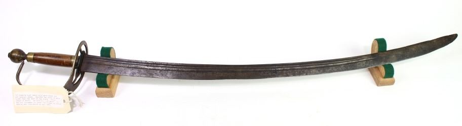 19th C. Spanish cavalry saber brass guard with heart cutout, all shows good to very good including wood grip, blade 32" curved.with heart cutout, all shows good to very good including wood grip, blade 32" curved.