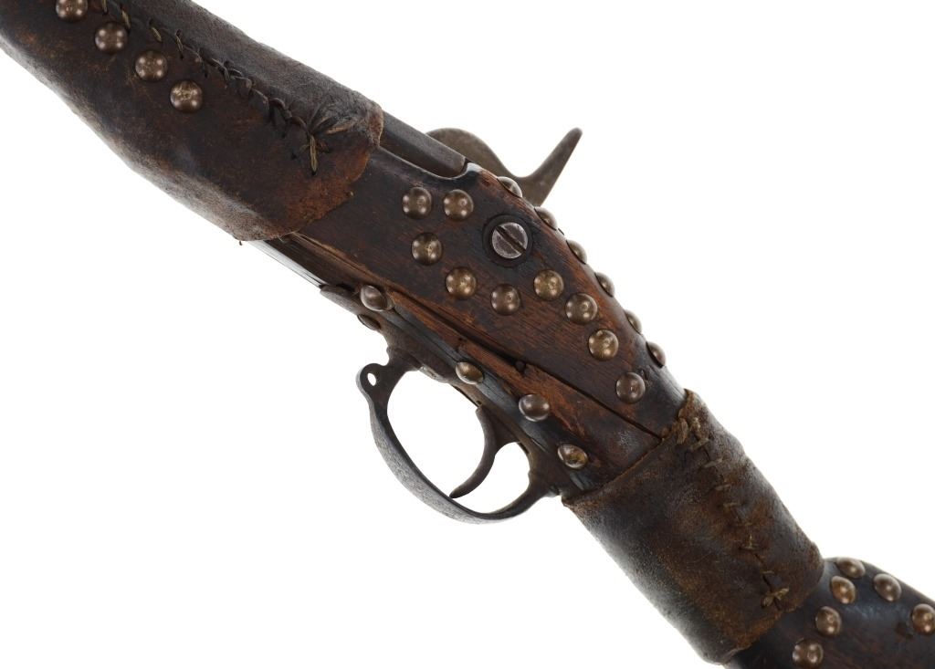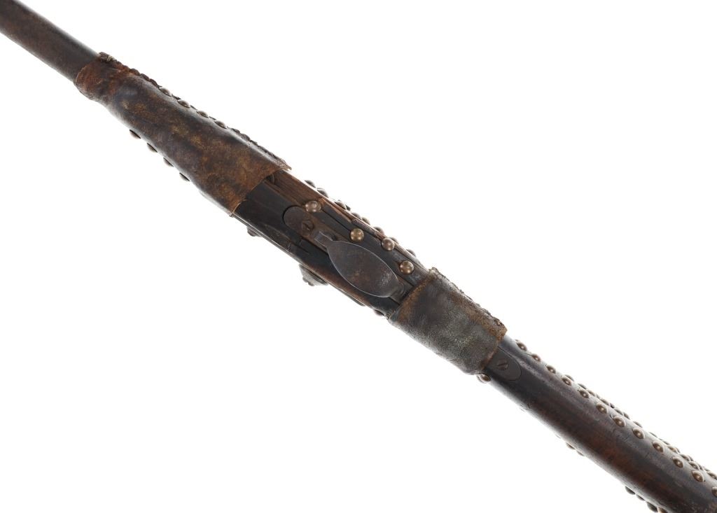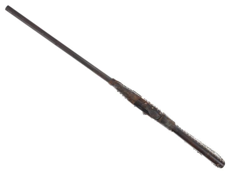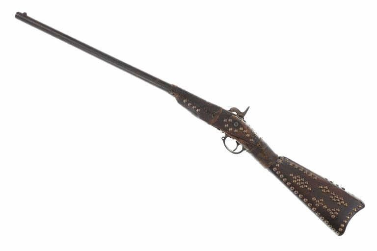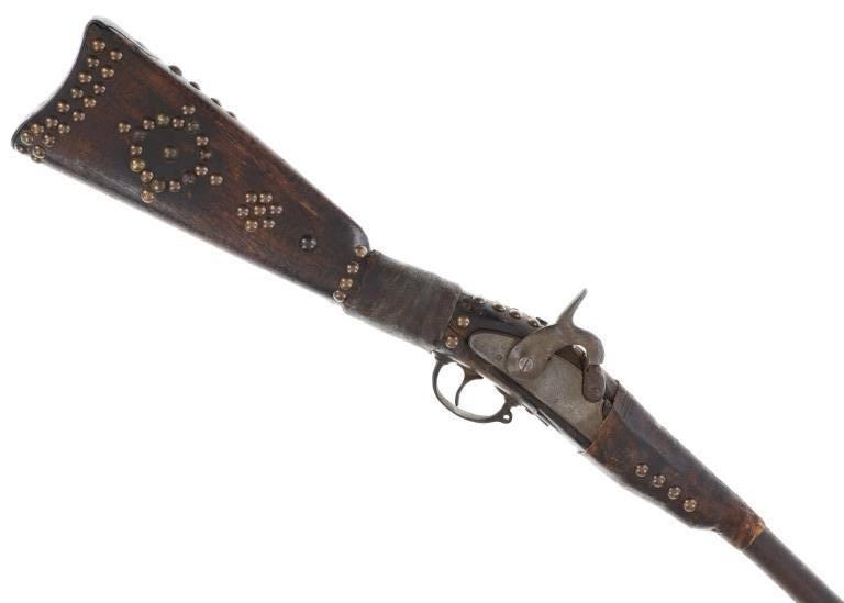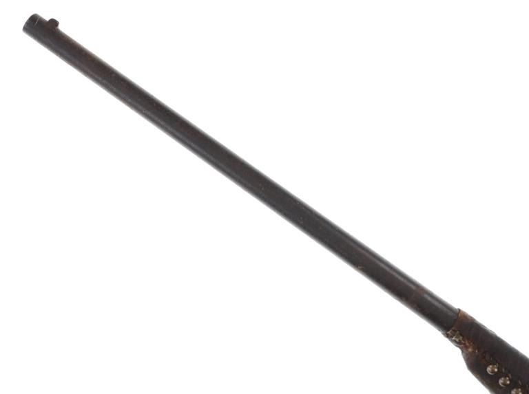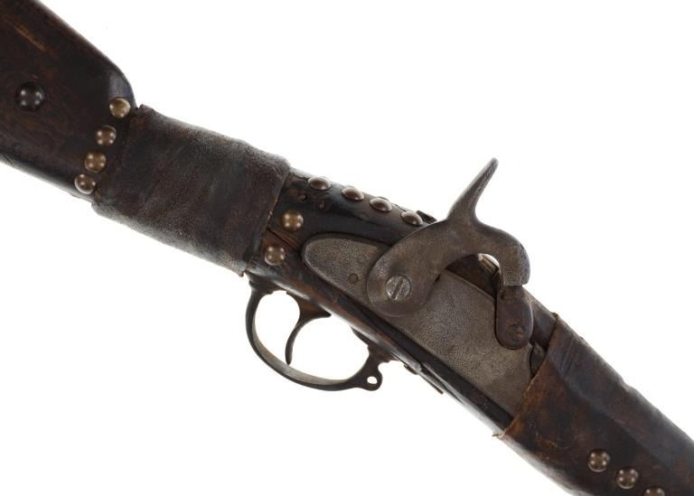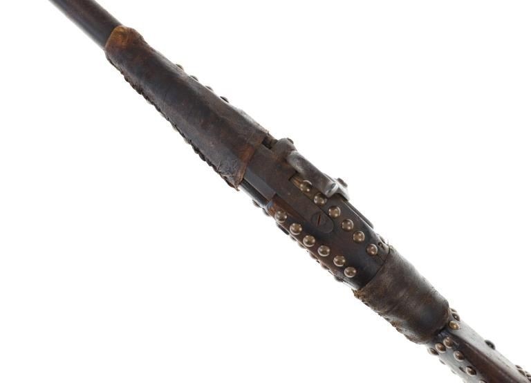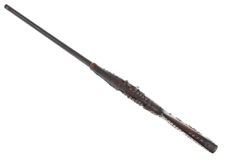 This lot features a 19th Century faintly marked Springfield percussion black powder musket rifle which was adorned by the Lakota Sioux. The rifle is from the ex-Jim Bastian collection of Kansas City, and it was acquired from a dealer at the Tulsa, Oklahoma gun show several years back. There are two wraps of thick dark rawhide parfleche hide leather which were later elaborately decorated with brass and metal tacks in circles, bands and cross symbols. The large exposed side percussion hammer still pulls back and the hammer releases it. You can very faintly see the 1800’s mark at the back of the side receiver and very faintly see the markings on the center of the plate just in front of the hammer, consistent with early Spingfield rifles. There are some minor cracks in the stock near the trigger, likely from the firing impact over long periods of time. Nice, honest condition Indian Wars era trade rifle in Springfield form with some original and later added tacking. Most of the tacks appear to be later added brass covered metal round shank trade tacks. Said to be circa 1860-1880. The hammer pulls back, clicking twice and holding, trigger releases the hammer, appearing to function. Measures overall 47 ½ inches in length.*