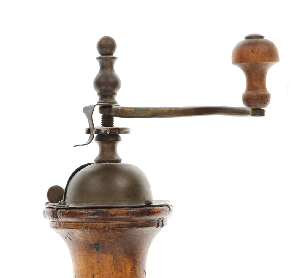 Featured in this lot is this Thense turned wooden pepper grinder circa 19th century. The pepper grinder is wonderfully and professionally crafted wooden and brass construction. The grinder is lathe turned with a plaque on the front that is hard to read but appears to be marked as follows: MSh - (cross swords) - Thense. The spindle on the top is brass with a adjustable handle. The condition of this turned wooden pepper grinder is well preserved with some deep scoring to the wood and some wear to the mouth of the grinder and some patina to the brass used on the top but otherwise shows well preserved condition. The measurements of this grinder is 16" x 3 1/4" x 3 1/4". The collective weight of this grinder is 1lbs 6oz.