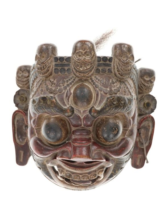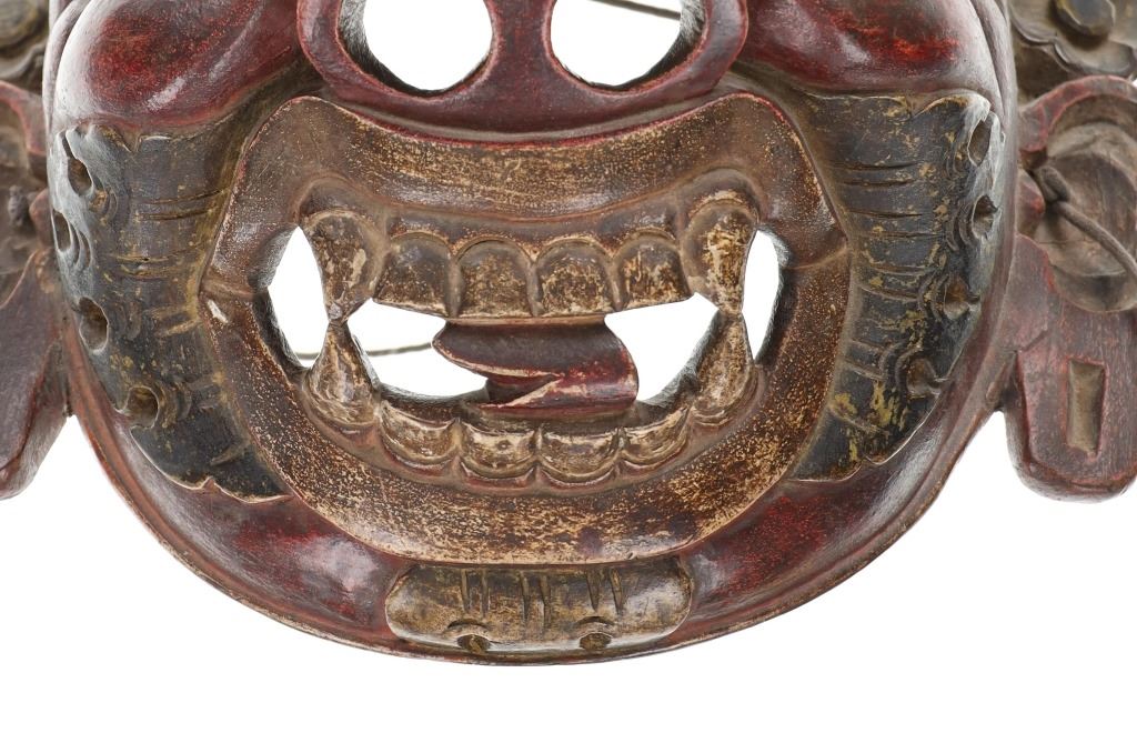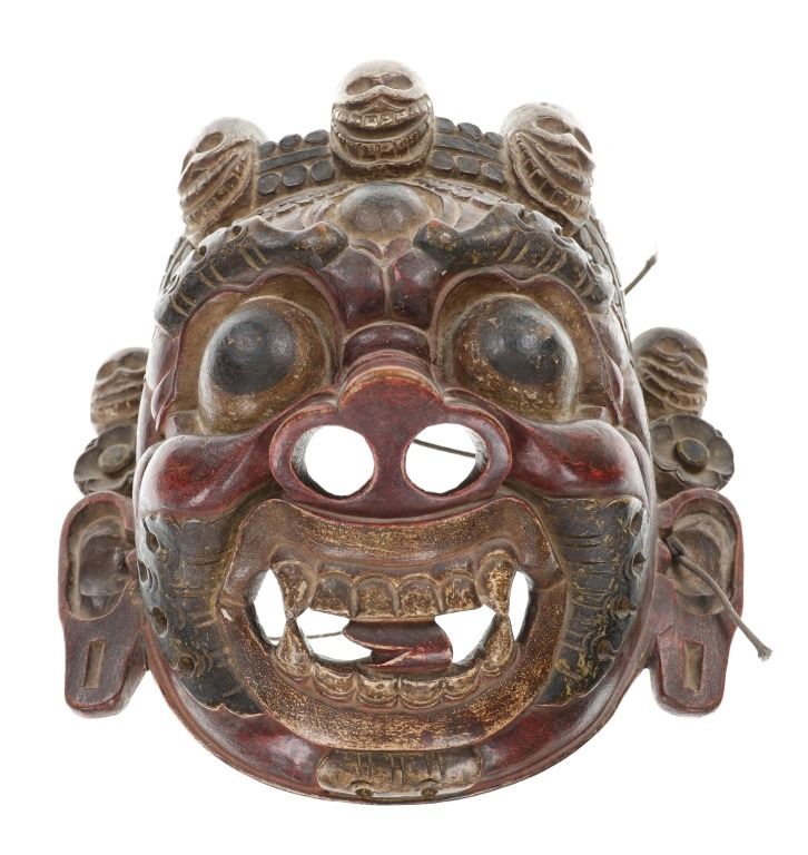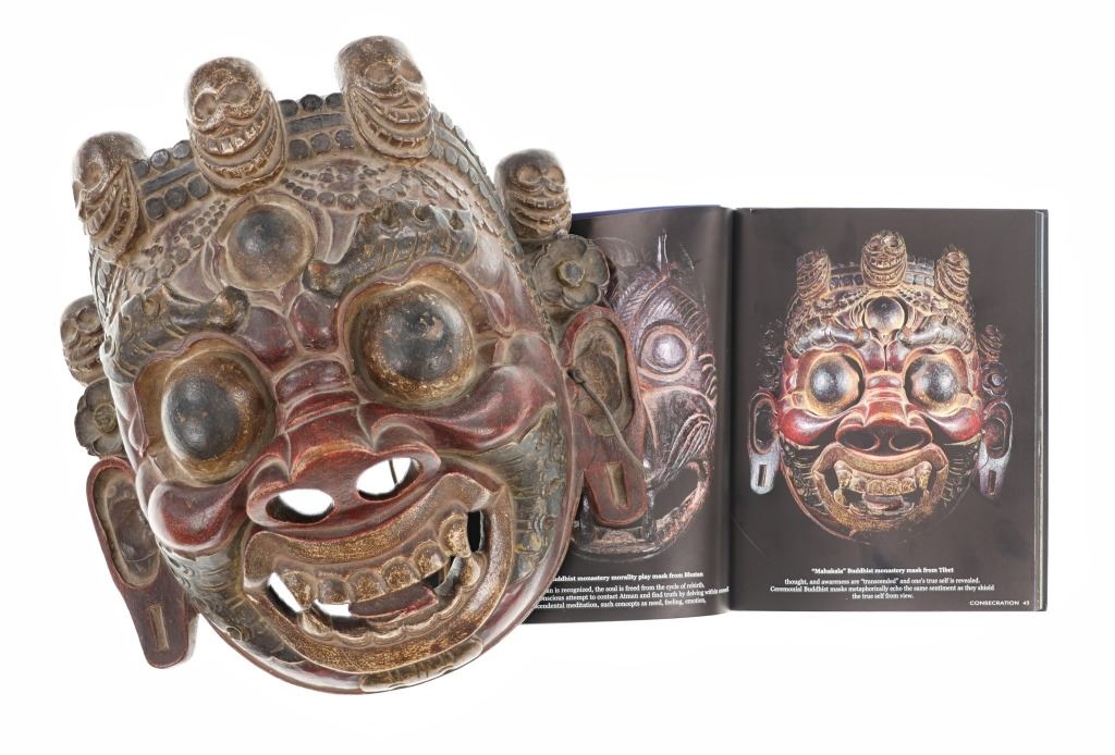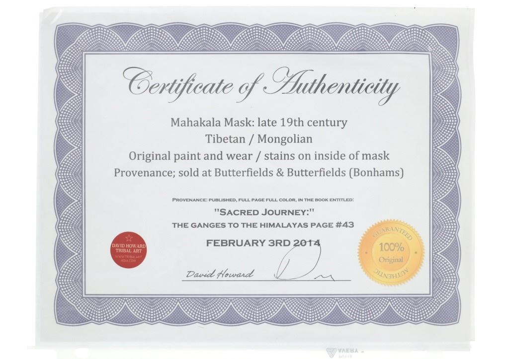 Featured in this lot is this original Tibetan Mongolian Mahakala mask circa 19th century that was published and comes with a certificate of authenticity. The mask features a wonderfully and professionally crafted wooden construction that shows a painted exterior with had carved decoration to the mask. The "Mahakala" Buddhist monastary mask from Tibet; thought, and awareness are "transcended" and one's true self is revealed. Ceremonial Buddhist masks metaphorically echo the same sentiment as they shield the true self from view. This mask comes complete with the Certificate of Authenticity from Butterfields & Butterfields (Bonhams) from 2014, and comes with a book with the exact mask presented in it on page 43. The mask also sold at a Bonhams Auction in 2016 for $5,250.00. The condition of this Tibetan or Mongolian mask is preserved with some wear to the wood and to the paint adorning the mask but otherwise shows preserved overall condition. The measurements of this mask is 13" x 13" x 7 1/2". The collective weight of this mask is 3lb 6oz.
