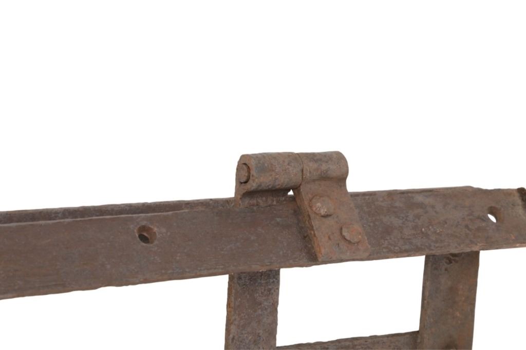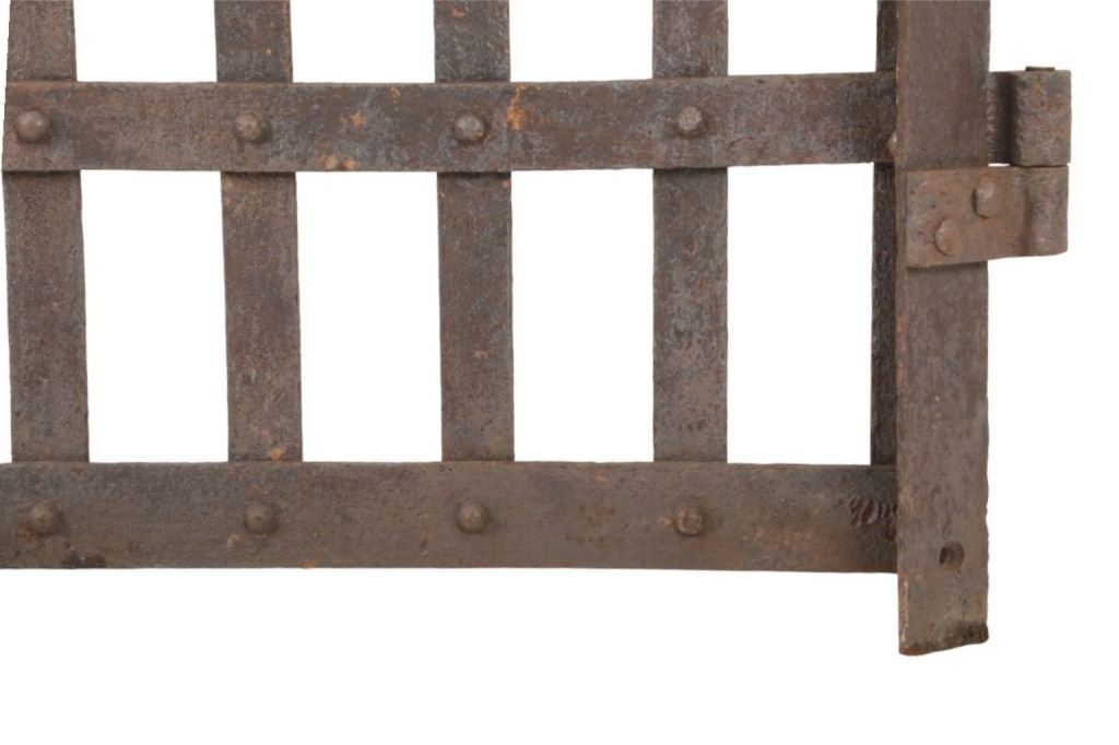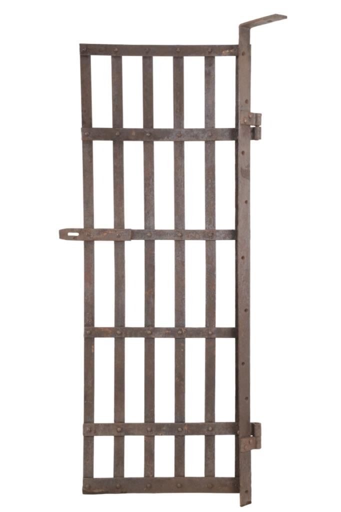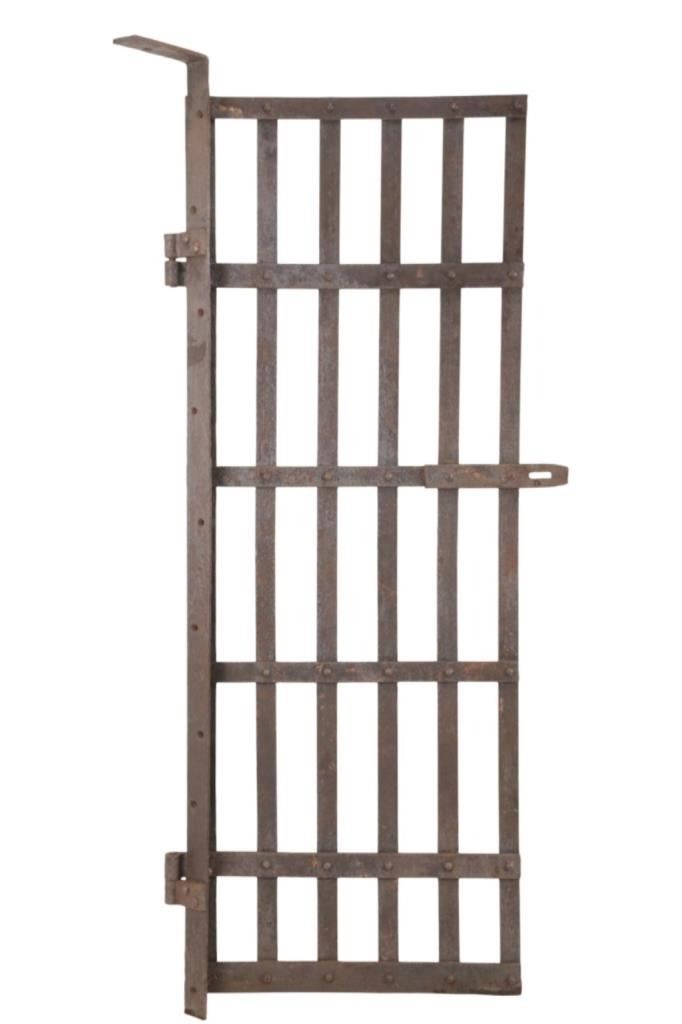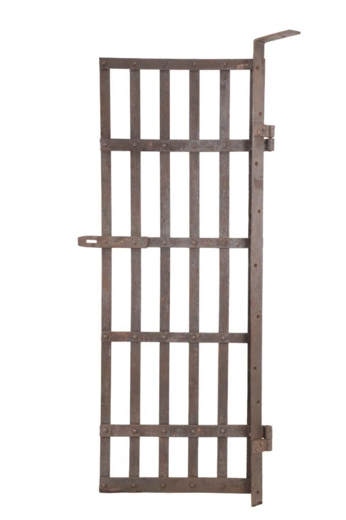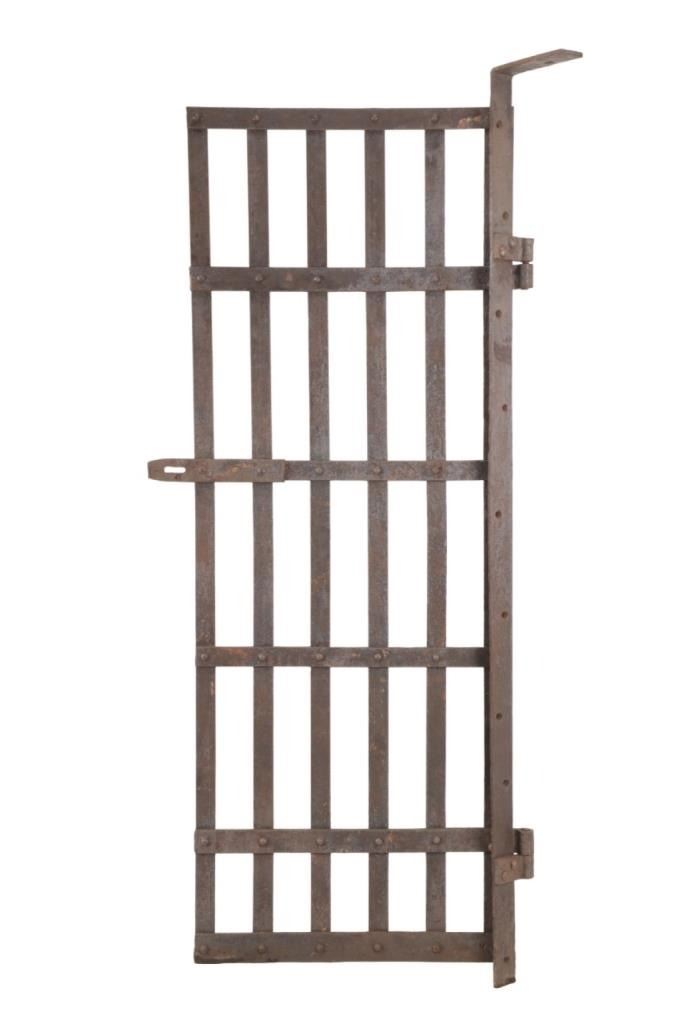 Featured in this lot is this Tombstone, Arizona Territory jailhouse reinforced door circa 19th century and was housed at the Tombstone Western Heritage Museum; Provenance: From the Tombstone Western Heritage Museum in Tombstone, Arizona. The jailhouse door features a wonderfully and professionally crafted reinforced forged iron construction and shows the original hinge attached to the door and shows the bars reinforced and meant to be a viable deterrence to the escape of jailed individuals. The door was identified by the museum curator Stephen Elliot. The condition of this Tombstone Jail Door is preserved with heavy oxidation due to exposure and has been pulled form the jailhouse proper but otherwise shows a preserved overall condition. The measurements jailhouse door is 75 3/4" x 32" x 12". The collective weight of the jail door is Museum tag that read: 1881 Tombstone Jaildoor, dug up from under city hall- it was used as fill when they built the hall in 1882. Obviously it had been through a fire - the big fire of 1881. just imagine, all the Earps and most of the outlaws would have had their hands on this door. Museum TT01.