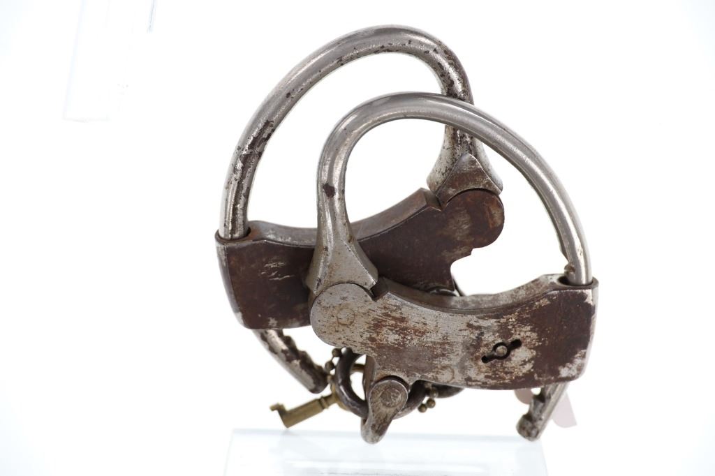 Featured in this lot Tombstone Tombstone, Arizona Territory LEO stainless steel handcuffs circa 19th century and displayed in the Tombstone Western Heritage Museum; Provenance: From the Tombstone Western Heritage Museum in Tombstone, Arizona. The handcuffs feature a wonderfully and professionally crafted stainless steel and chrome covered construction that shows the right key to open the handcuffs with its press down locking mechanism. The condition of this pair of Law enforcement handcuffs is well preserved with some oxidation to the stainless steel underneath the chrome but otherwise shows a well preserved condition. The measurements of this pair of handcuffs is 9 1/2" x 3 3/4" x 1/2". The collective weight of this pair of handcuffs is 1lb. LO215