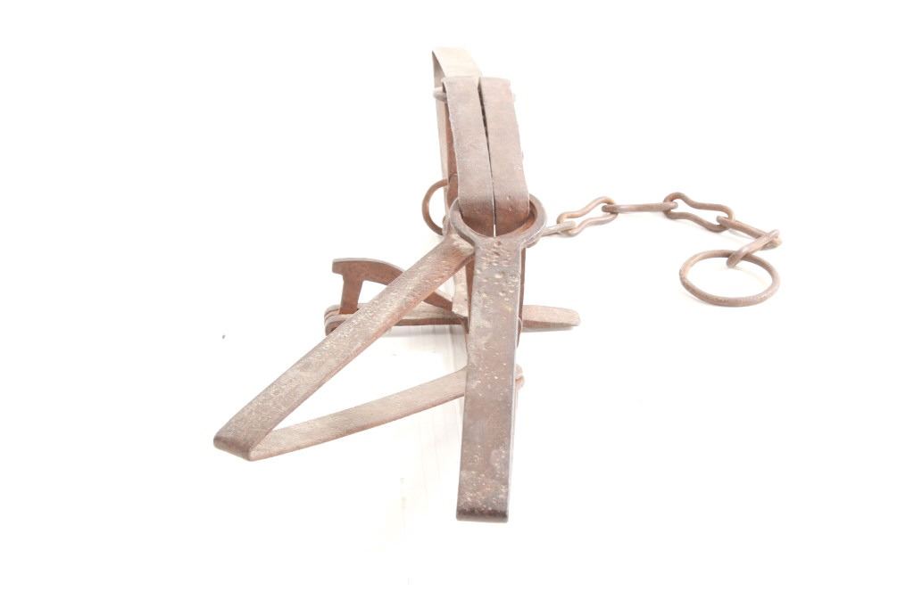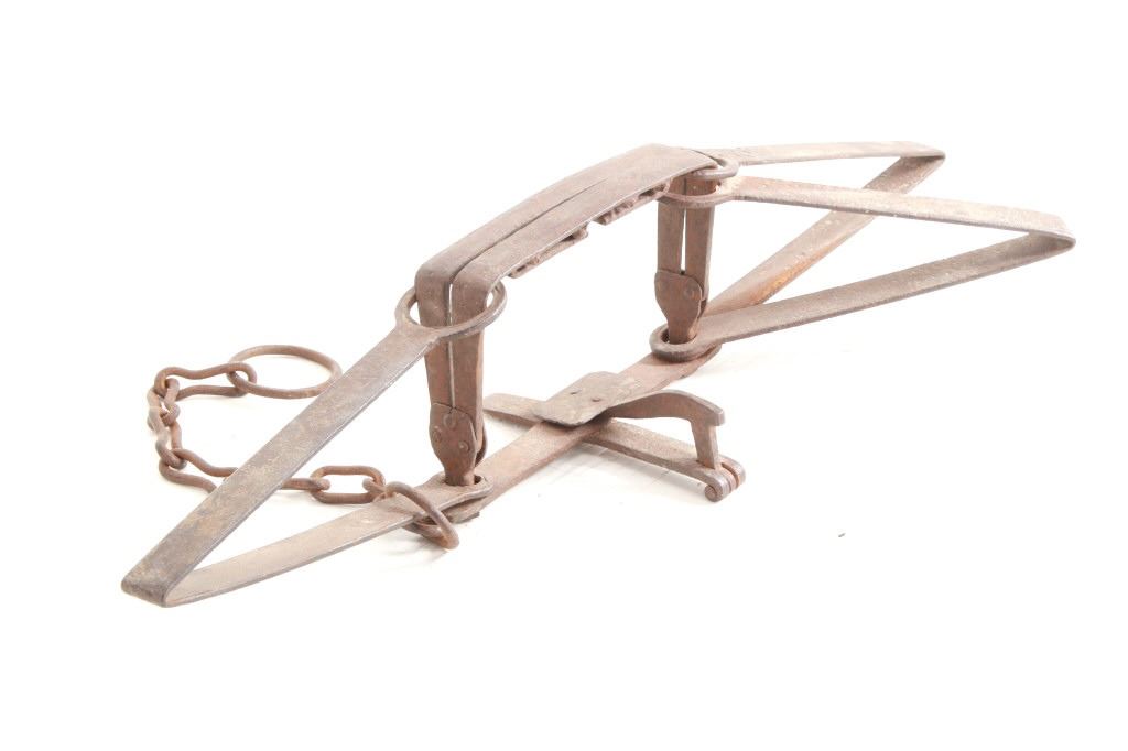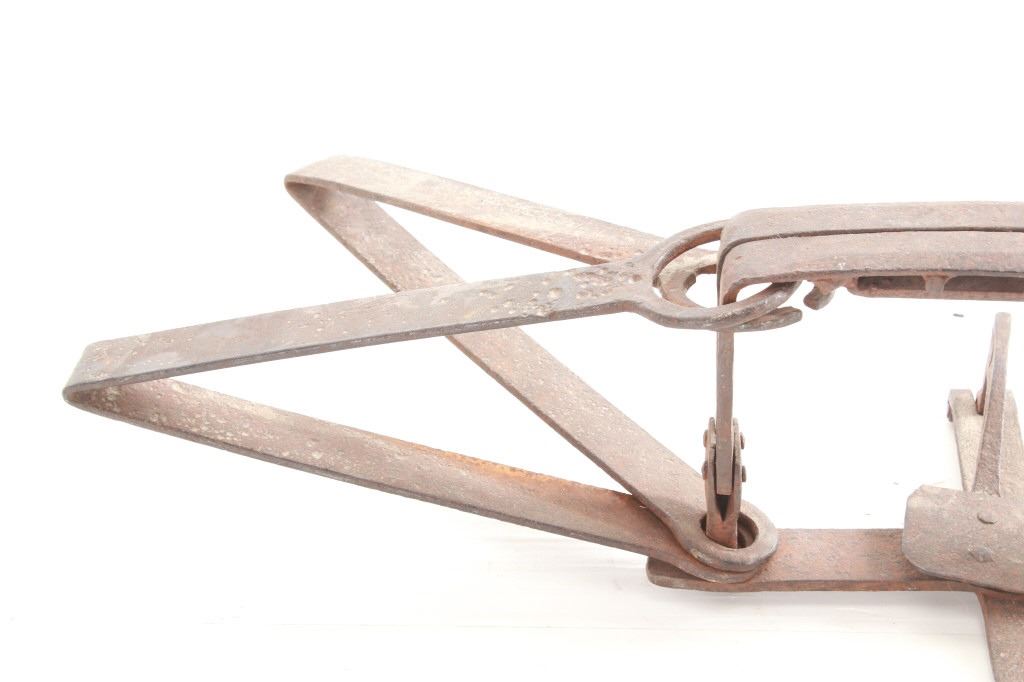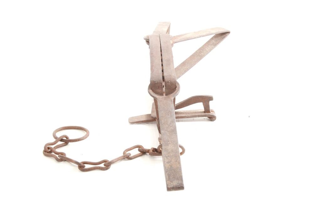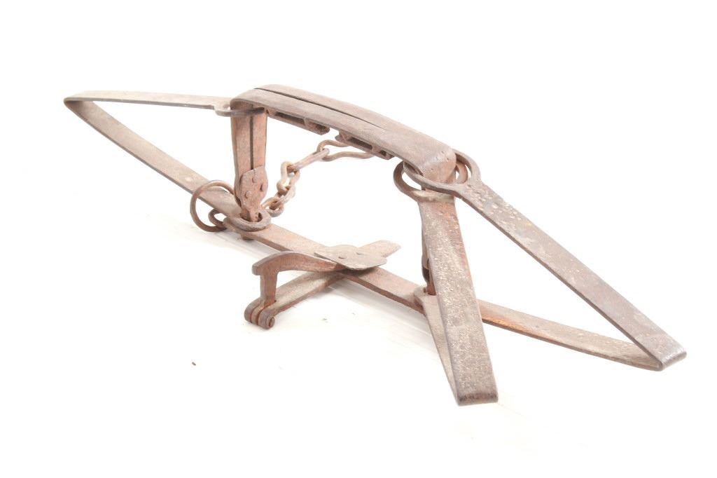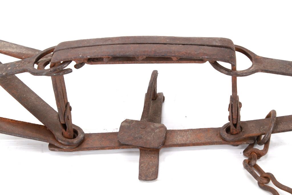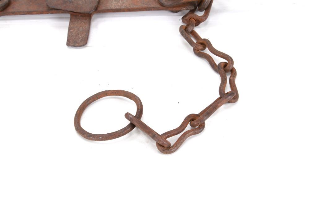 Featured in this lot is this 19th century triple spring blacksmith forged bear trap. The bear trap is wonderfully and professionally crafted steel construction that shows triple springs to the bear trap with a rectangular slick pan with no marks, and the teeth line the inside of both sides of the trap where the teeth are enclosed and welded in the bars of the trap. The condition of this blacksmith forged bear trap is well preserved with heavy oxidation adorning the entire bear trap but otherwise is well preserved. The measurements of this 42" x 10 3/4" x 9 1/2". The collective weight of this bear trap is 26lb 8oz.