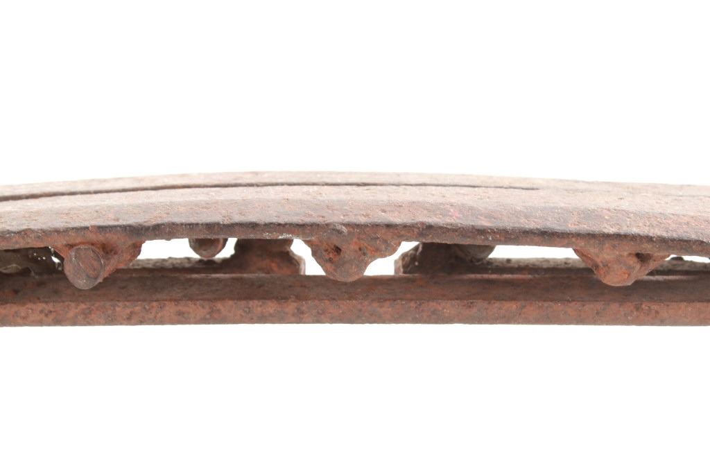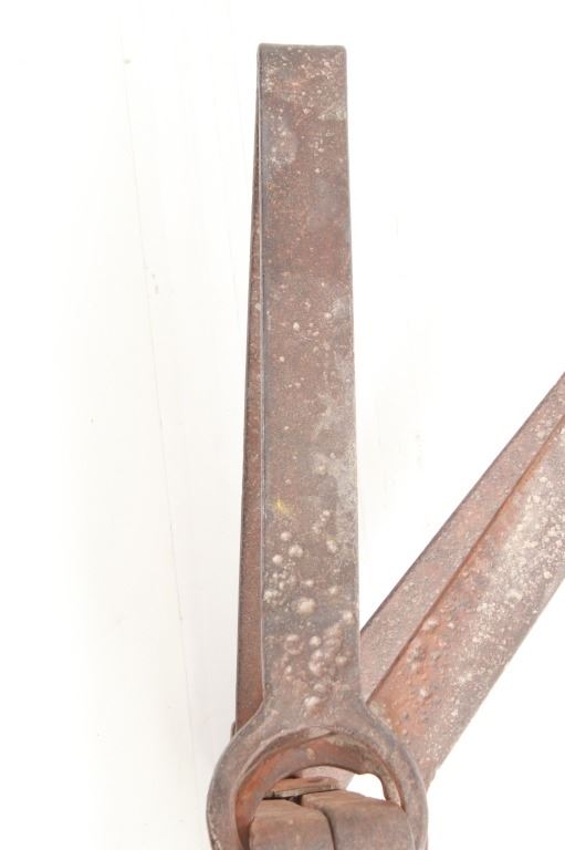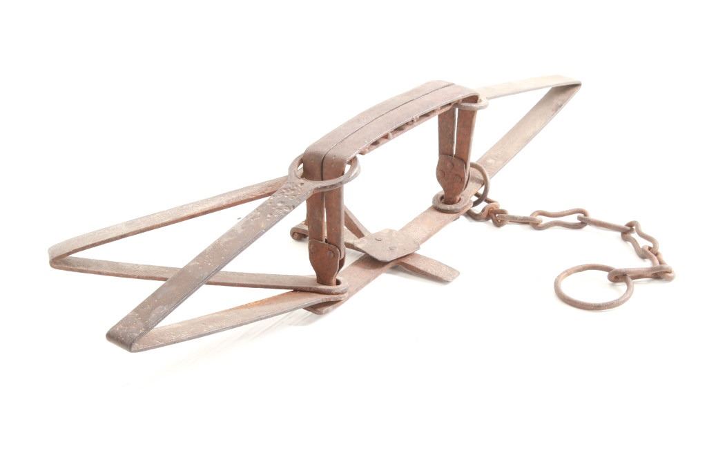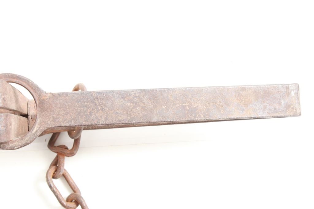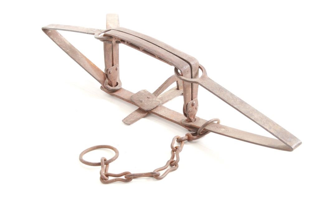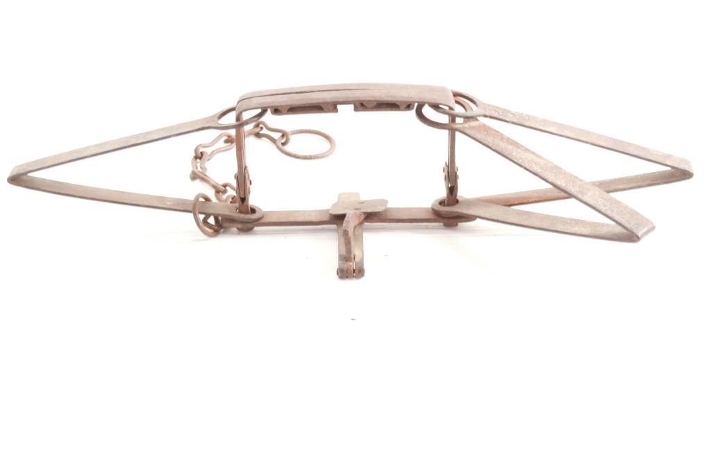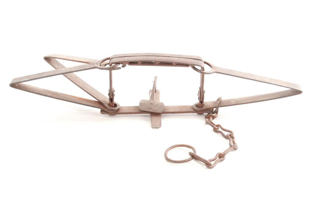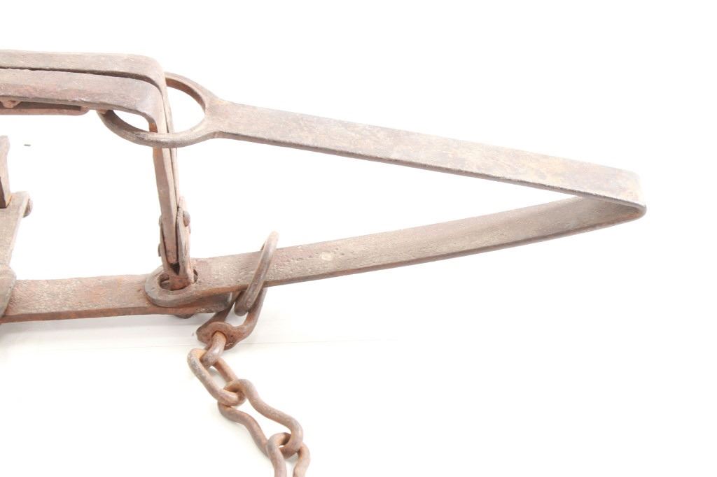 Featured in this lot is this 19th century triple spring blacksmith forged bear trap. The bear trap is wonderfully and professionally crafted steel construction that shows triple springs to the bear trap with a rectangular slick pan with no marks, and the teeth line the inside of both sides of the trap where the teeth are enclosed and welded in the bars of the trap. The condition of this blacksmith forged bear trap is well preserved with heavy oxidation adorning the entire bear trap but otherwise is well preserved. The measurements of this 42" x 10 3/4" x 9 1/2". The collective weight of this bear trap is 26lb 8oz.
