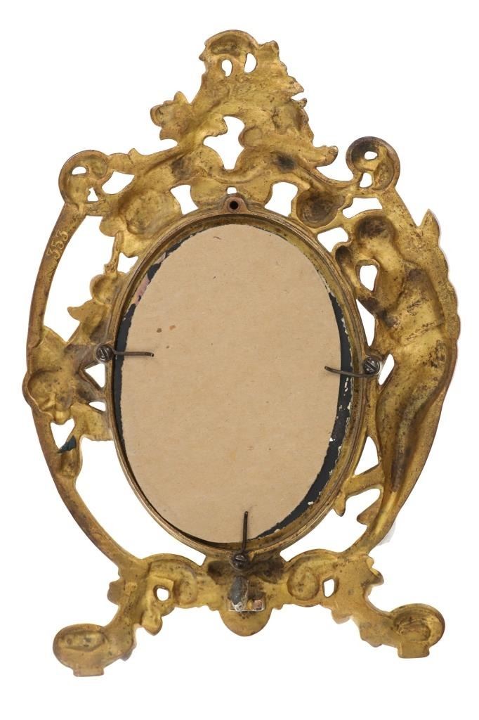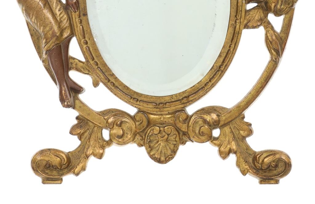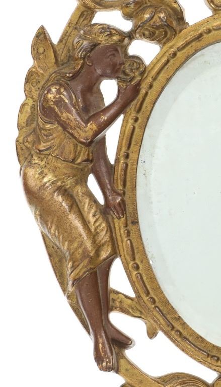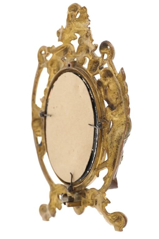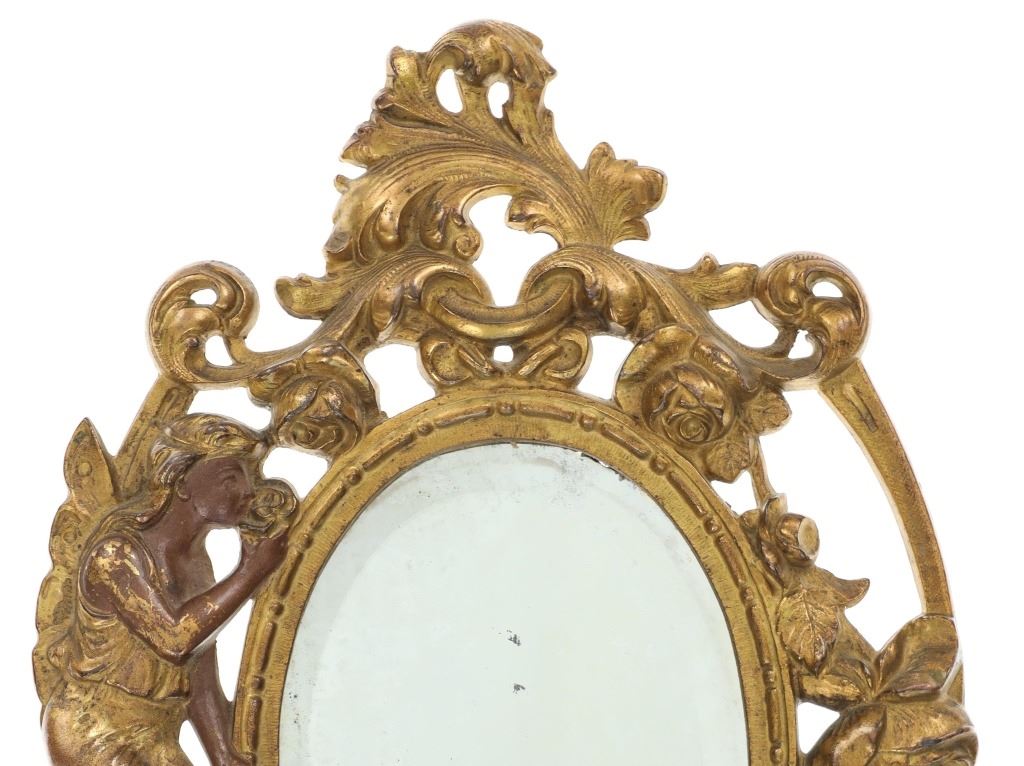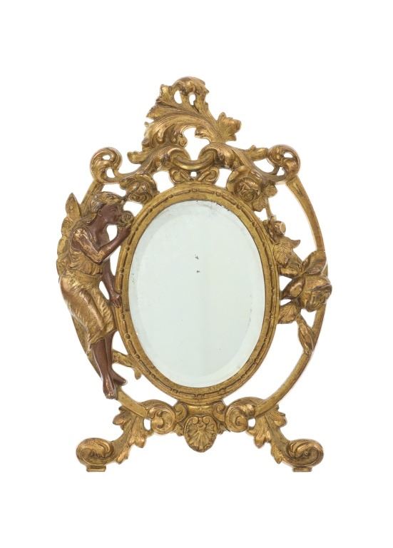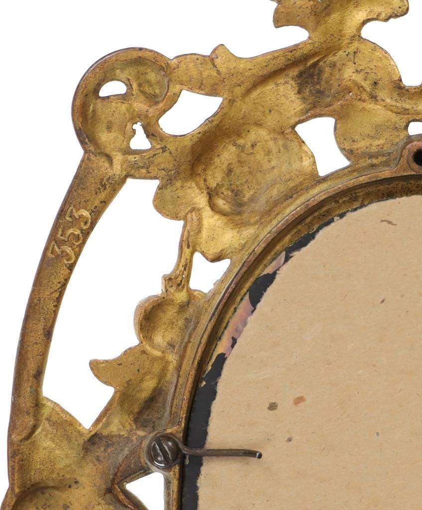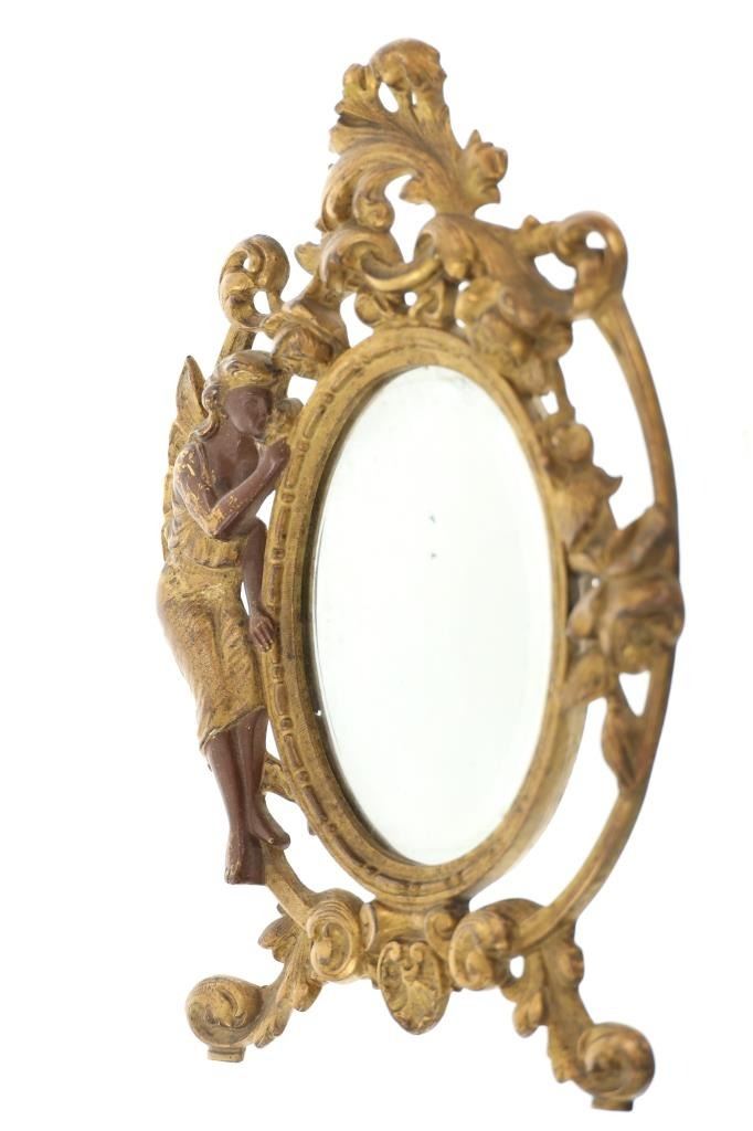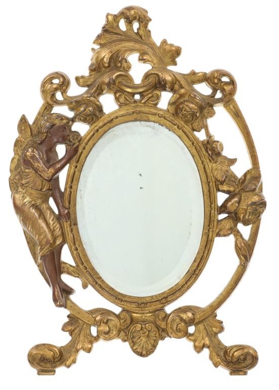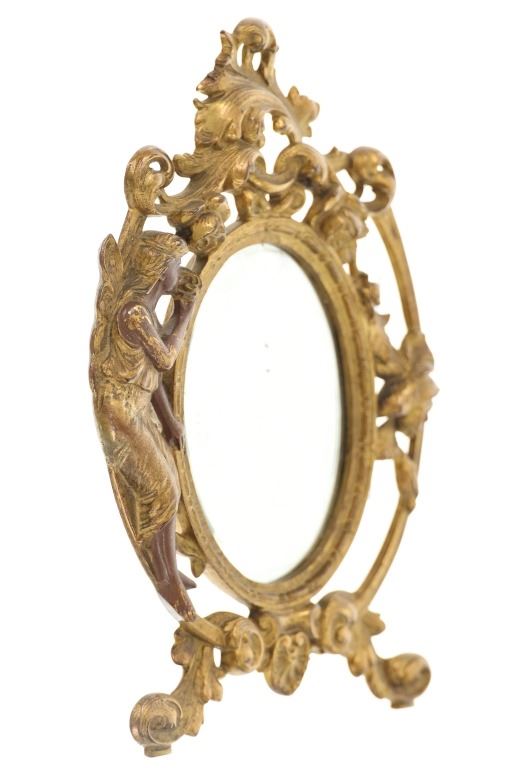 Featured in this lot is this 19th Century Victorian floral fair easel gilt mirror. The mirror features a wonderfully and professionally crafted brass and gold gilt construction that shows a florally decorated frame with a fairy in the left of the frame with a mirror places as the center piece. The easel mirror is marked on the back '353' and 'P' on the back. The condition of this this gilt easel mirror is well preserved with some wear slightly to the gilt and shows an easel peg is missing from the mirror but otherwise shows well preserved overall condition. The measurements of this mirror is 11" x 7 1/2".