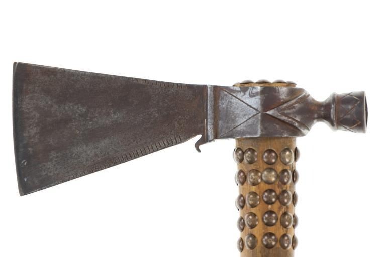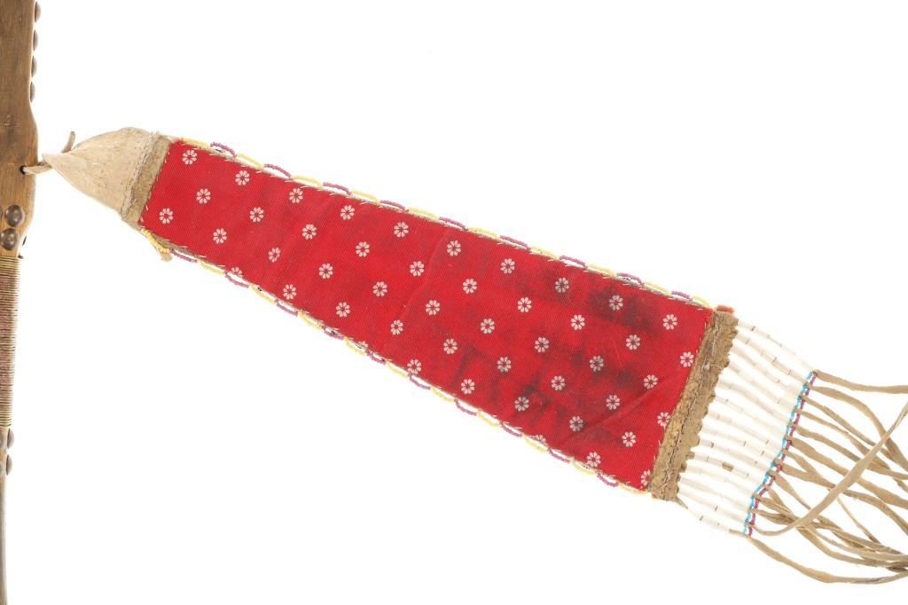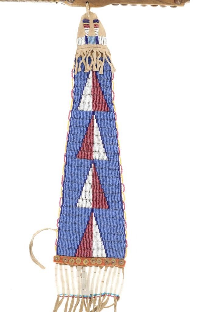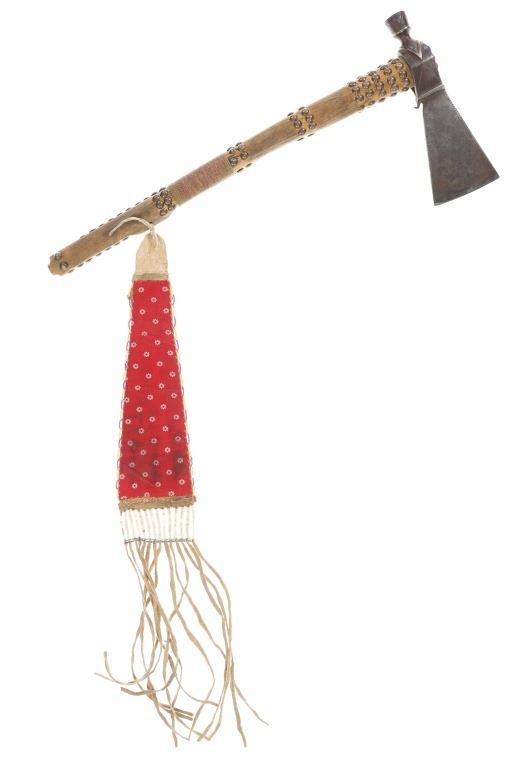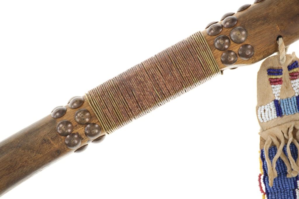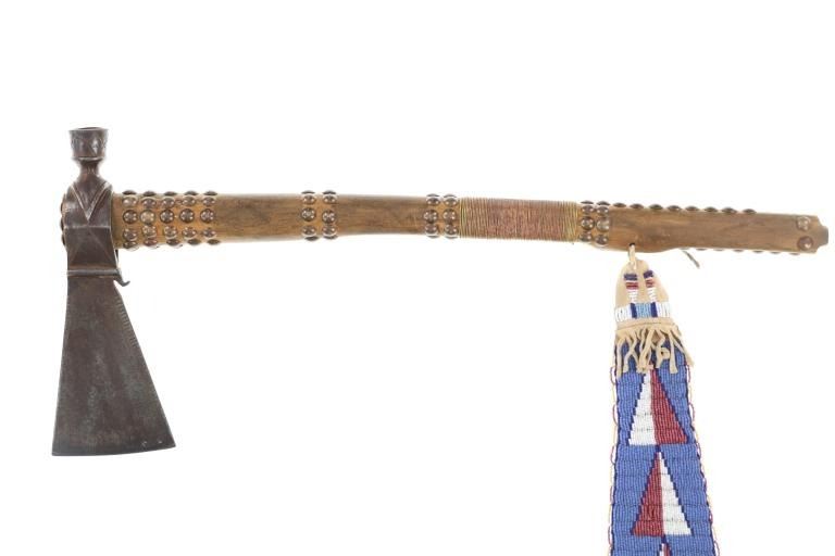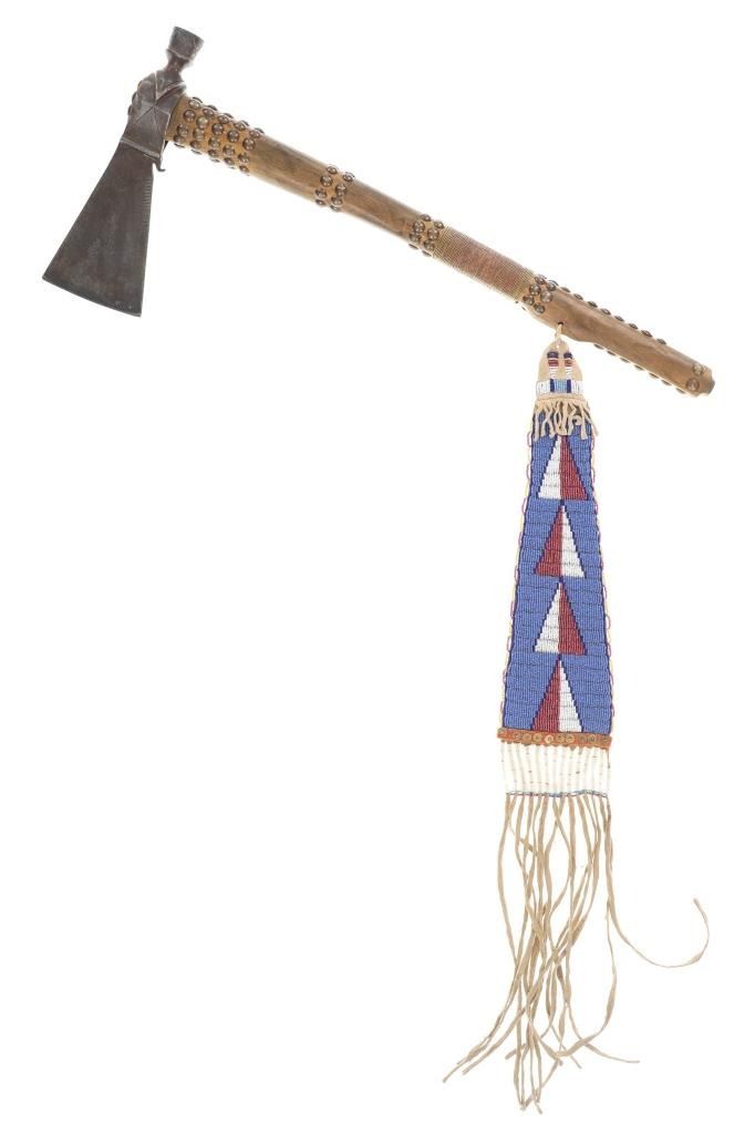 This is a fabulous 19th-century Western pipe tomahawk with beaded drop. The tomahawk exhibits a hand-forged iron head with wide flaring western blade with tear drop eye and a short vase like bowl. The back of the blade has a rear facing basal process spur and the blade has a notched or cut filed design running down the outsides of both sides of the blade. The bowl has an “X” design and the eye has raised chevrons with some etching as well. The head has a dark chocolate patina coloring and is paired with an old ash wood haft with a nice mellow patina and elaborate decoration with brass covered metal trade tacks. The handle also has a wrap of old telegraph copper wire at the gripping area and at the pierced hole is tied an old drop. The drop is comprised of Indian tanned hide with classic geometric beadwork with old glass trade seed beads, trade clothe, Czechoslovakia trade beads and fringes. The set is likely from the Sioux or Cheyenne of the Northern Plains. From an private ex-Missouri collection of weapons and beadwork.