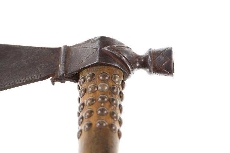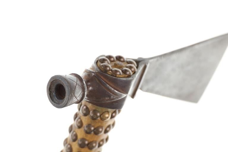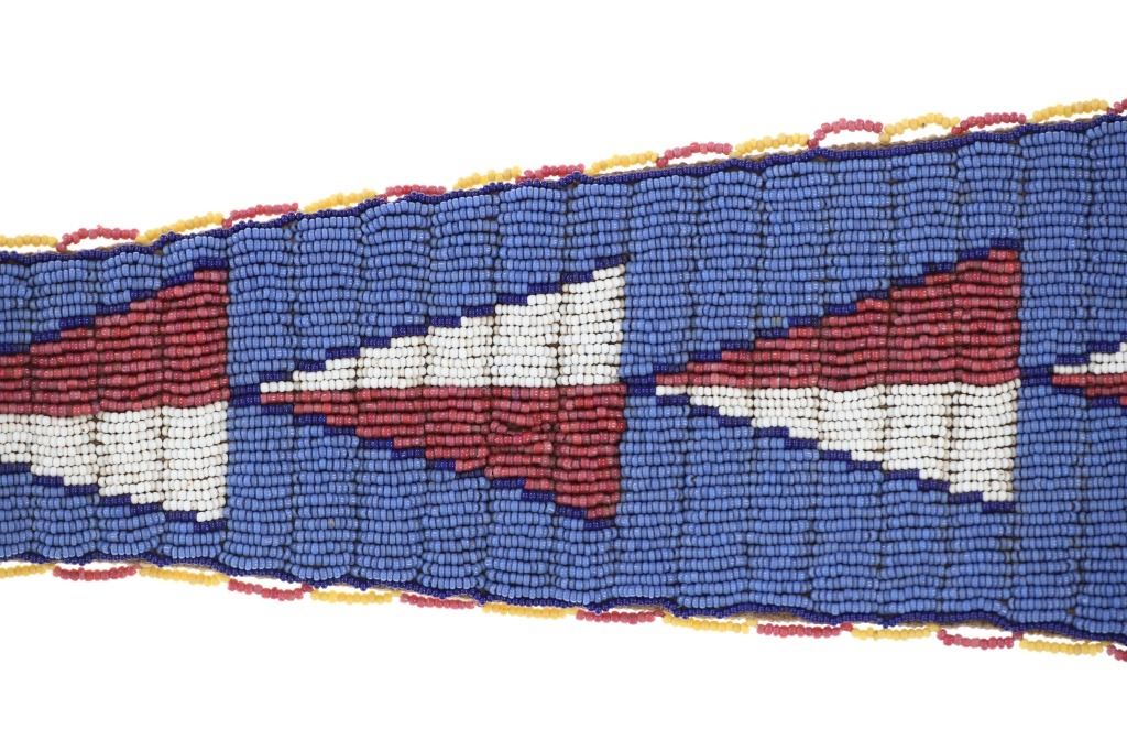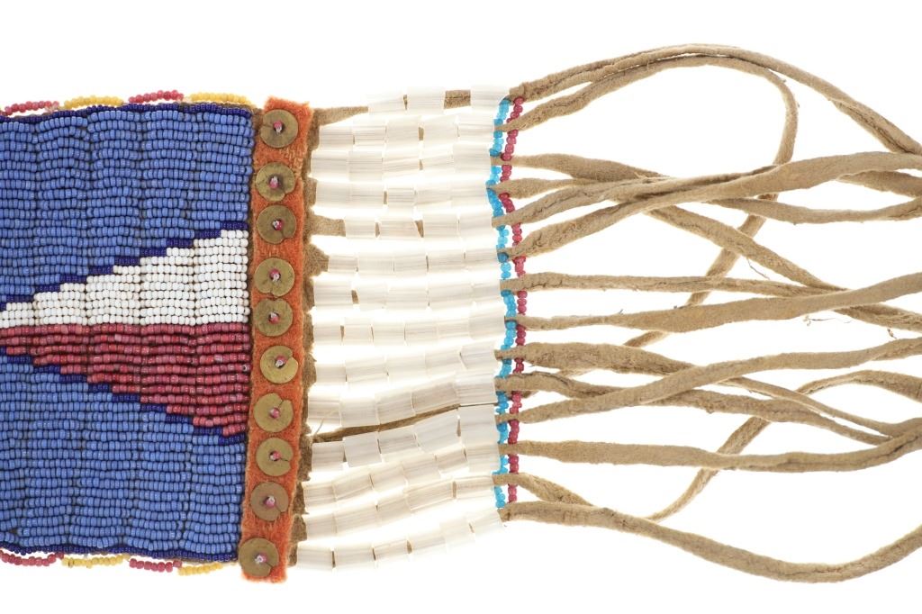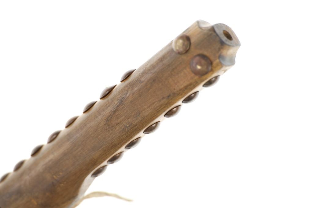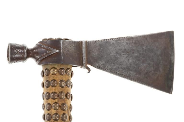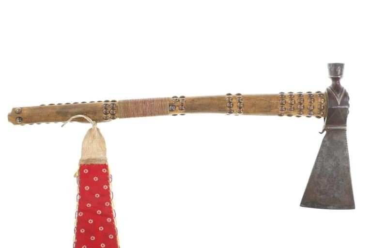 This is a fabulous 19th-century Western pipe tomahawk with beaded drop. The tomahawk exhibits a hand-forged iron head with wide flaring western blade with tear drop eye and a short vase like bowl. The back of the blade has a rear facing basal process spur and the blade has a notched or cut filed design running down the outsides of both sides of the blade. The bowl has an “X” design and the eye has raised chevrons with some etching as well. The head has a dark chocolate patina coloring and is paired with an old ash wood haft with a nice mellow patina and elaborate decoration with brass covered metal trade tacks. The handle also has a wrap of old telegraph copper wire at the gripping area and at the pierced hole is tied an old drop. The drop is comprised of Indian tanned hide with classic geometric beadwork with old glass trade seed beads, trade clothe, Czechoslovakia trade beads and fringes. The set is likely from the Sioux or Cheyenne of the Northern Plains. From an private ex-Missouri collection of weapons and beadwork.