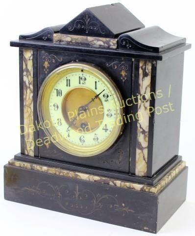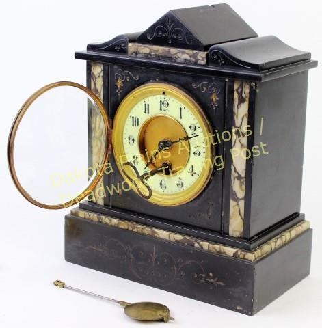 19th C. black marble mantle clock with porcelain dial, handpainted numerals, 10 1/2" tall, unmarked,