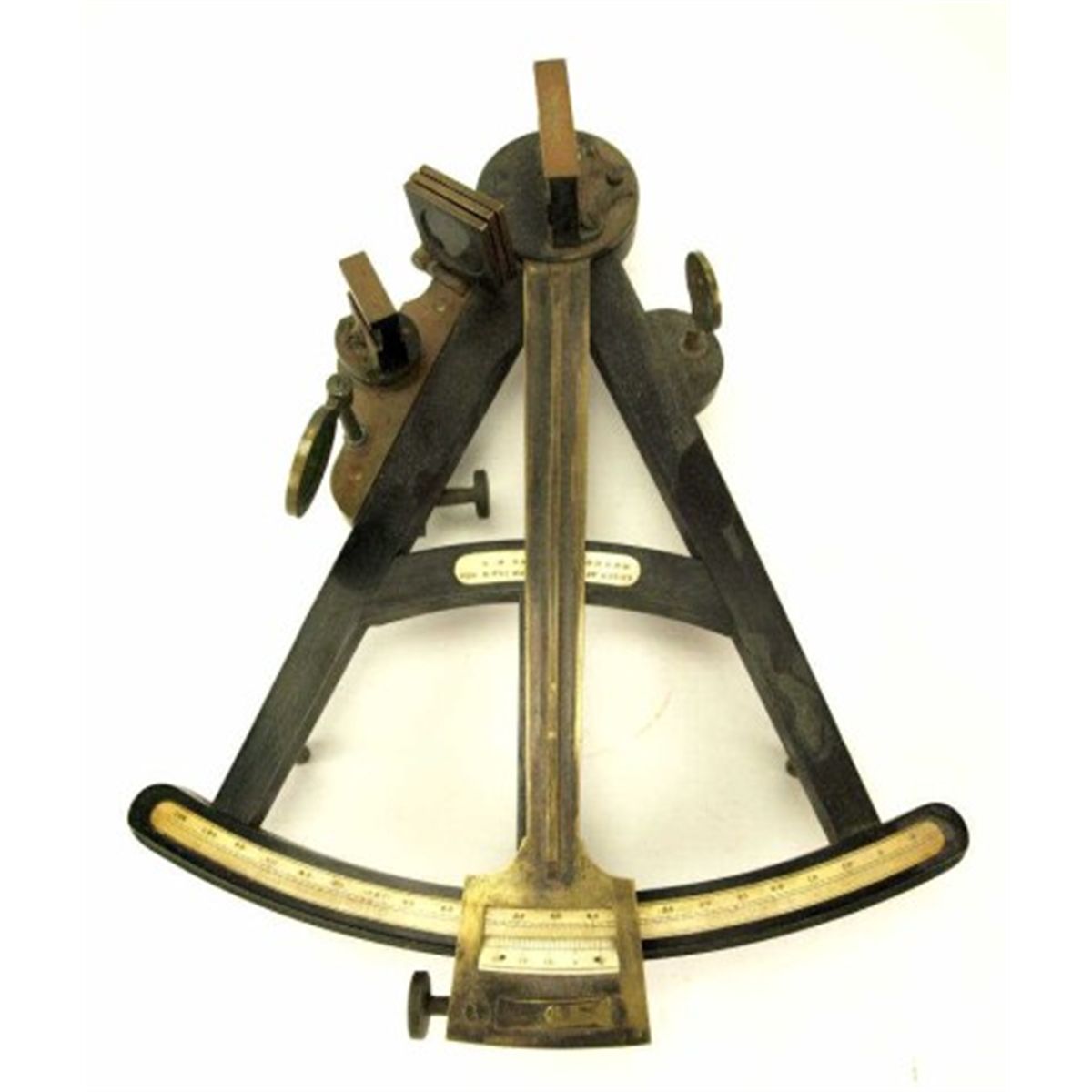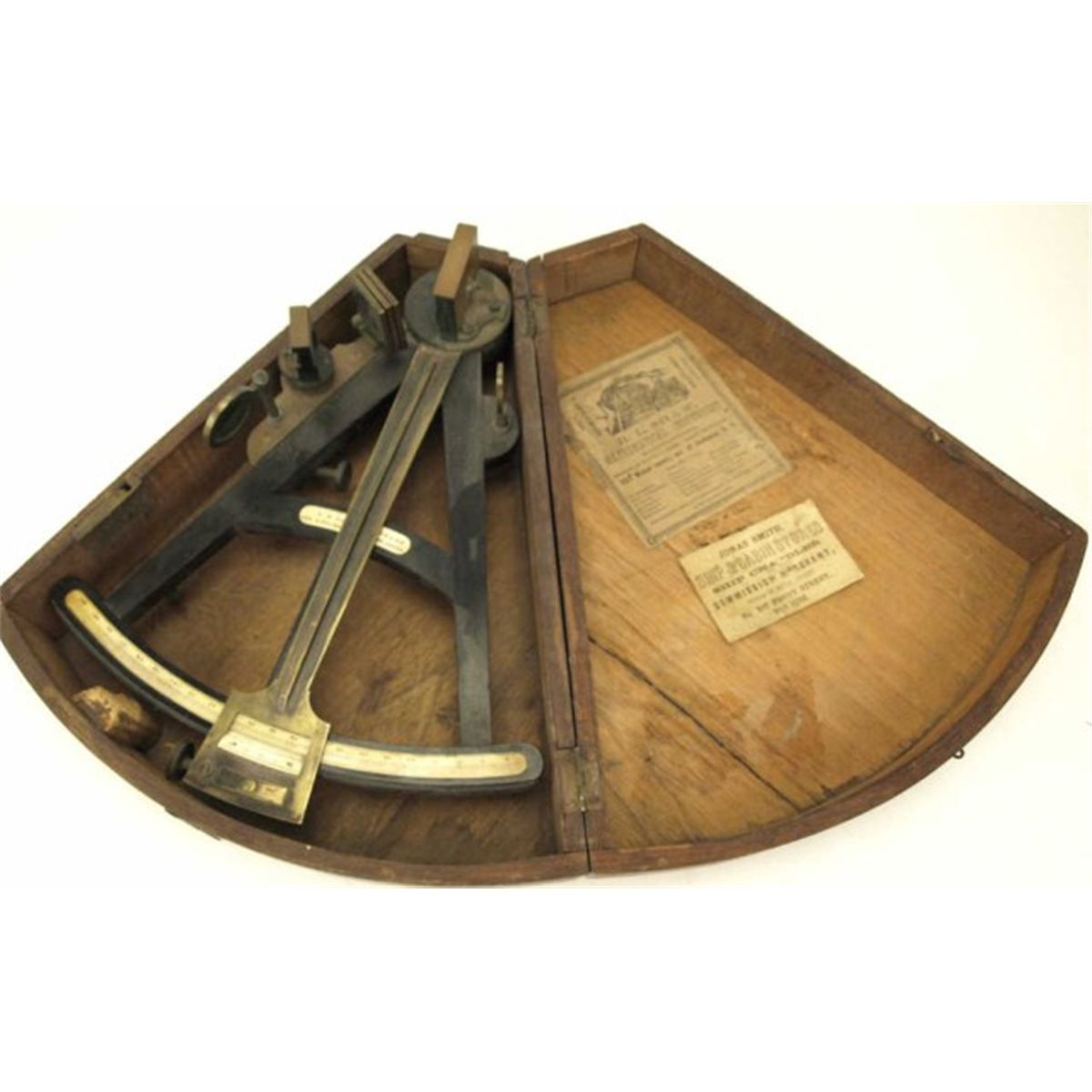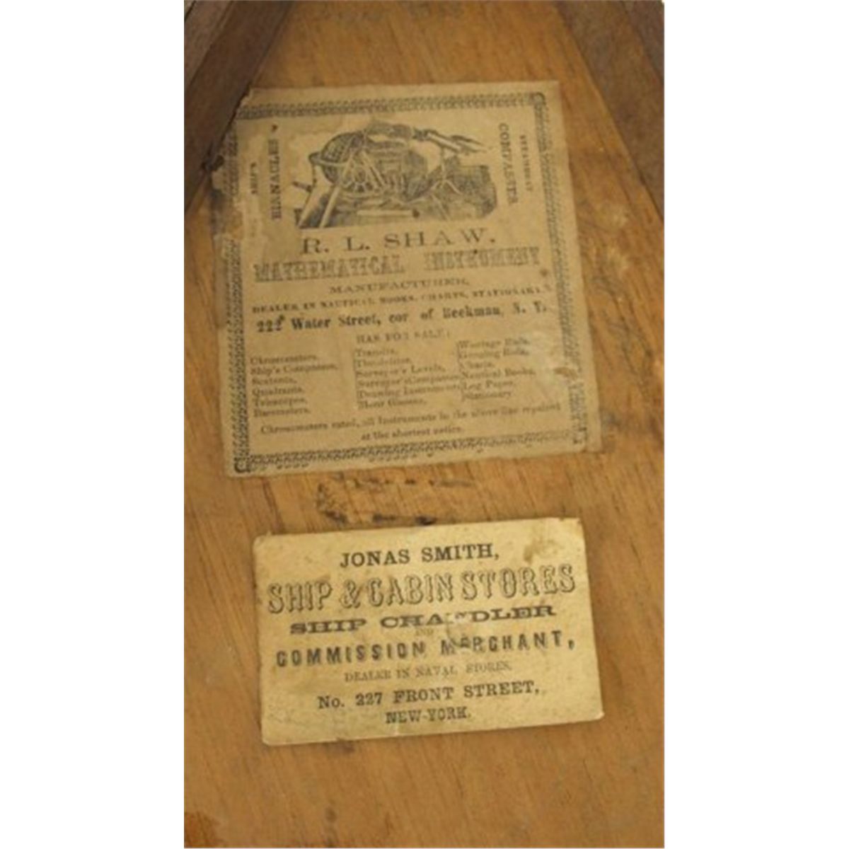 19th C. cased Quadrant marked on body RM Barrett London, the original walnut case with intact paper label reads "RL Shaw Mathematical Instruments Mfg. Dealer in Nautical Books, Charts, Stationary Beckman NY." Also included Business Card from salesman Jonas Smith Ship and Cabin Stores Front Street NY.