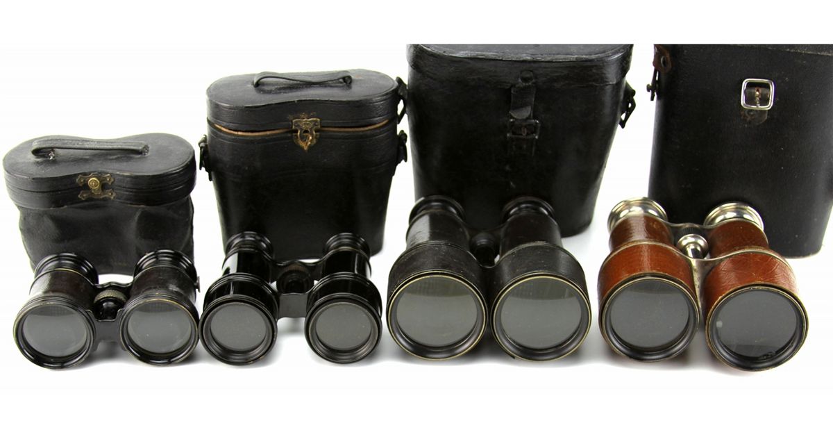 19th CENTURY BINOCULARS LOT OF 4 Chevalier, Cahen, Jumelle, and German made field theatre marine. Country: NA Condition: Very good.