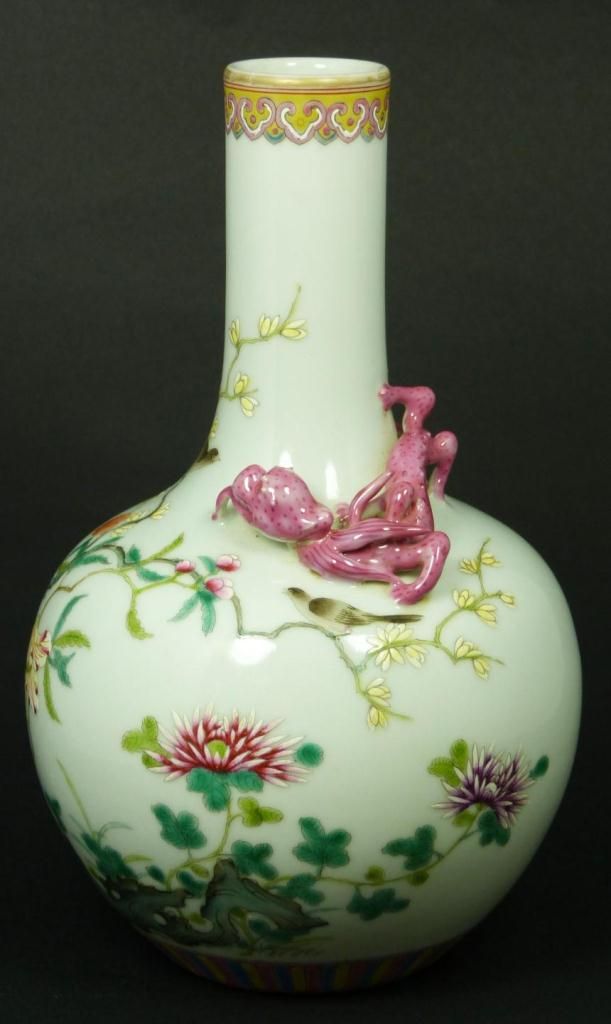 Antique Chinese Pink hand painted enameled vase depicting lotus blossoms and branches. Has raised pink dragon to neck. Stylized lotus blossom border design to neck. Holds six character archaic Qianlong reign marks to bottom but made late 19th century. Measures 9 1/2" height (24.1cm). Total weight of 689 grams.