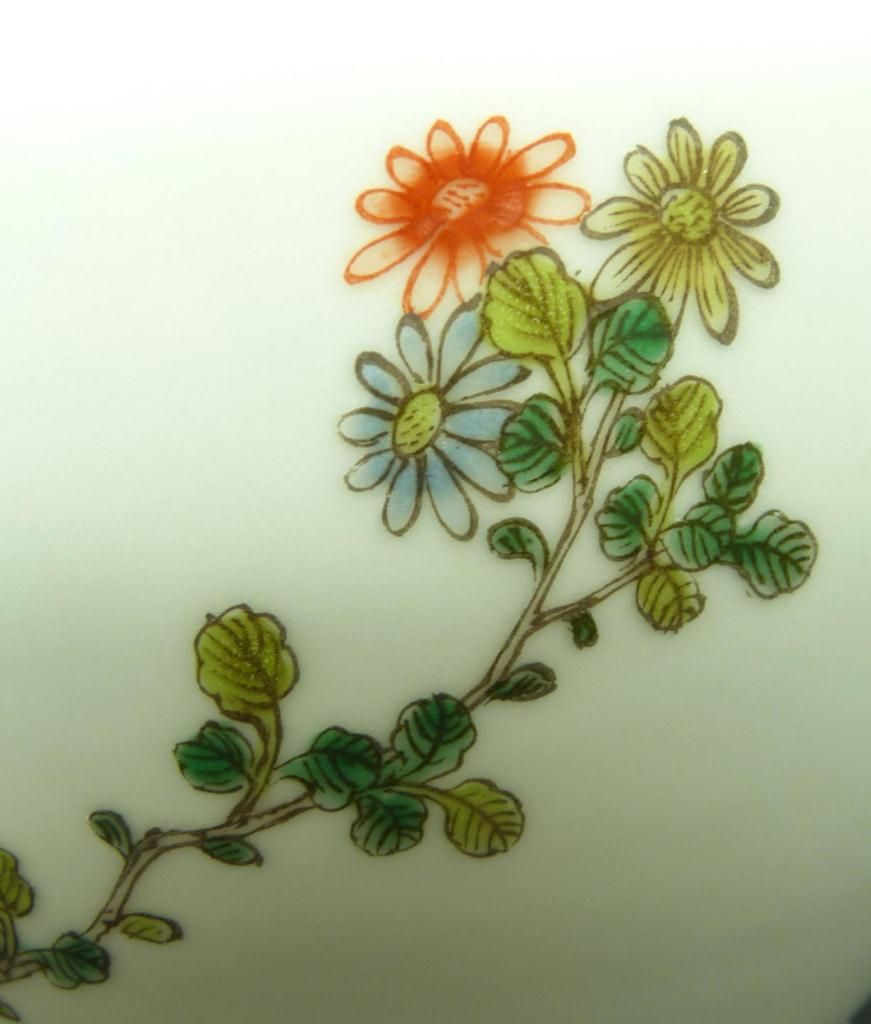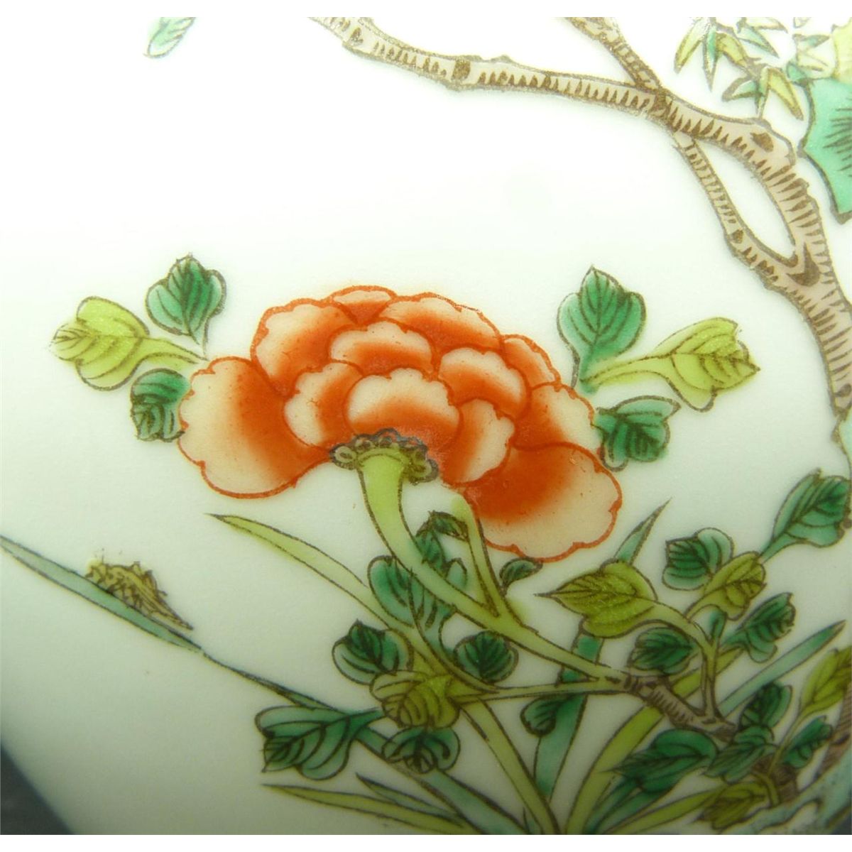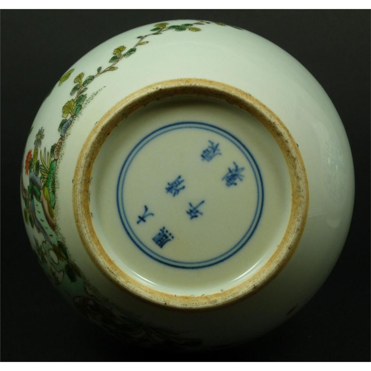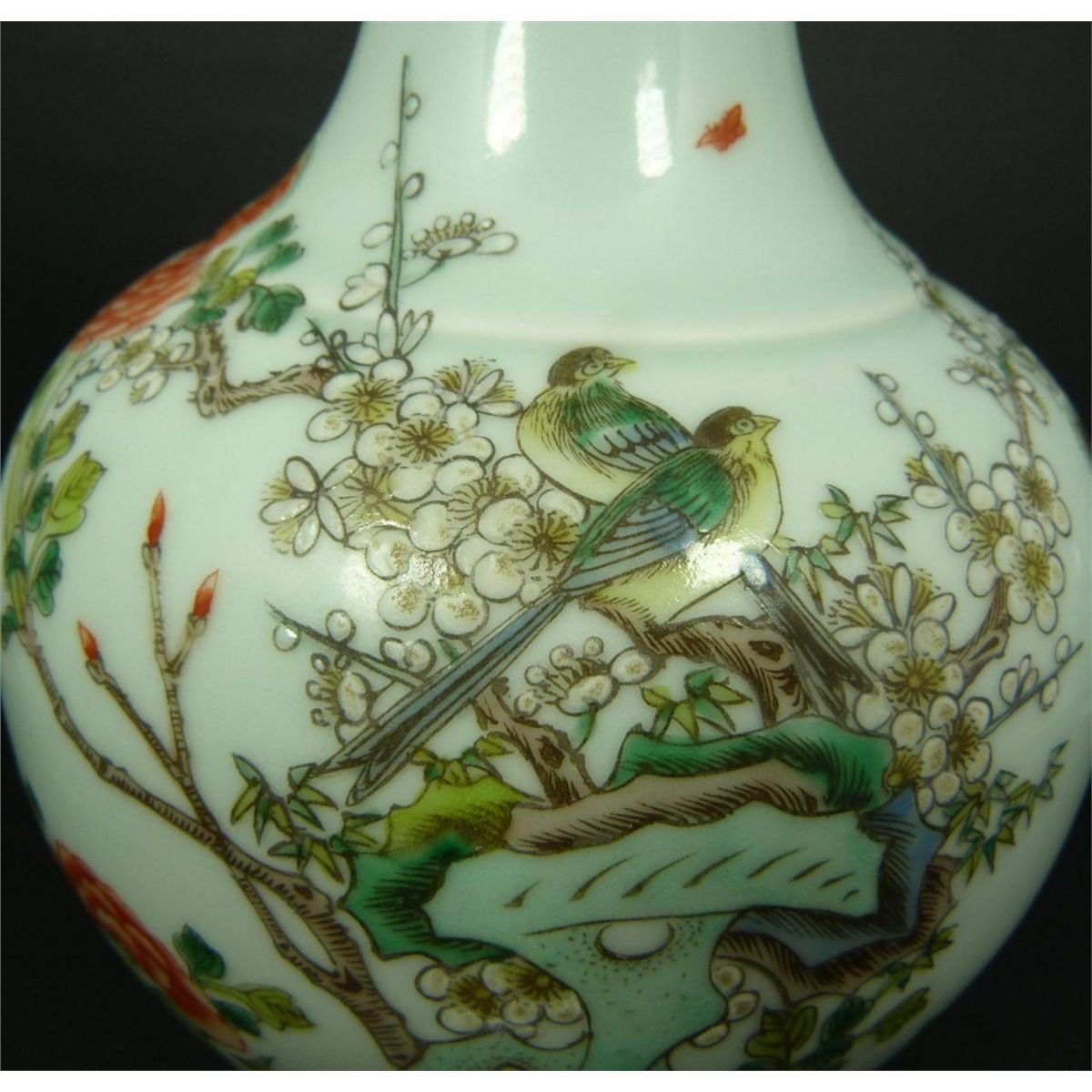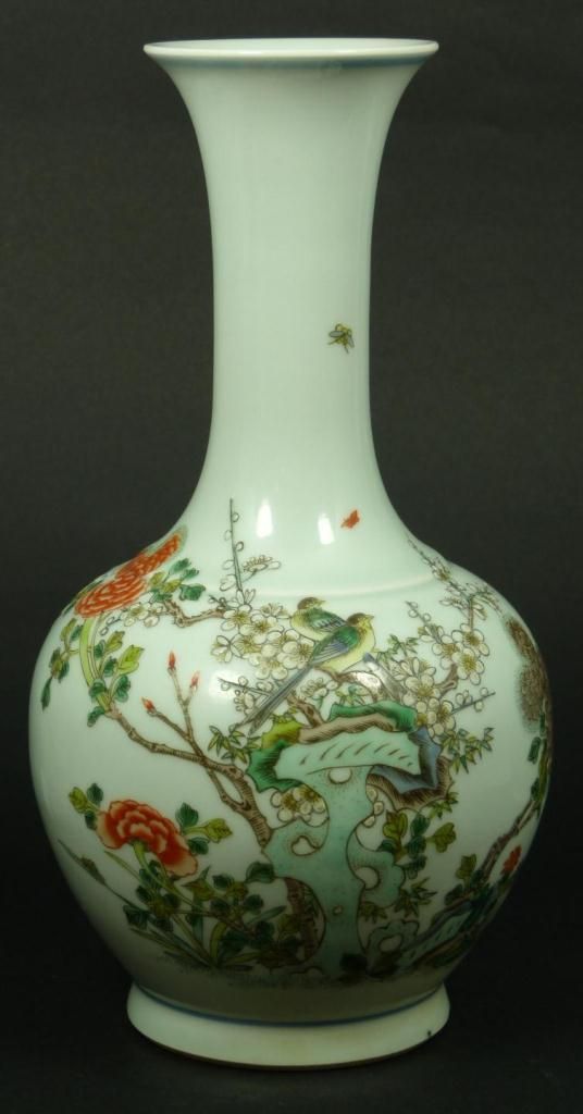 Antique Chinese hand painted enameled Wucai porcelain bottle form vase depicting birds in trees with flowers and butterflies. Flared lip with blue band to rim. Single blue band to foot. Bottom holds blue six character calligraphy Kangxi (1662-1722) period reign marks to bottom but probably made 19th century. Measures 10 1/8" height (25.7cm). Total weight of 771 grams.