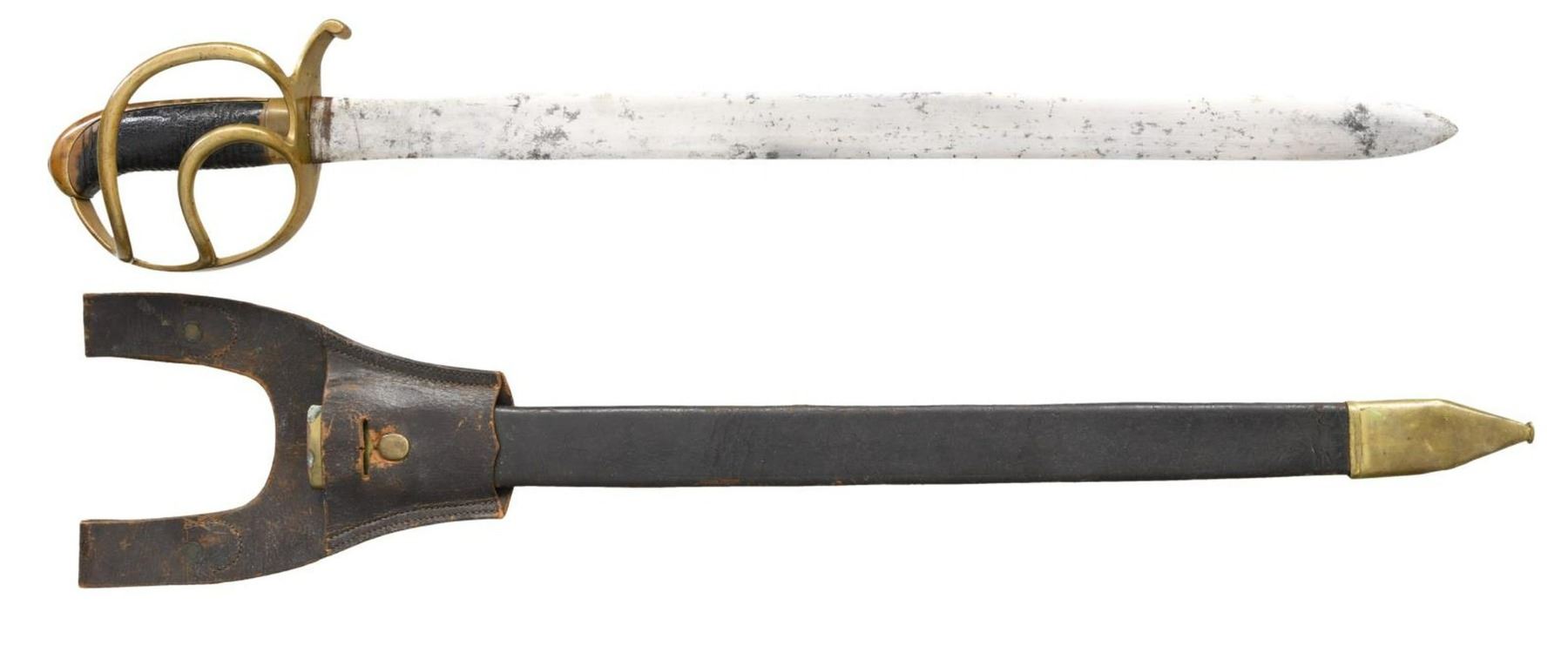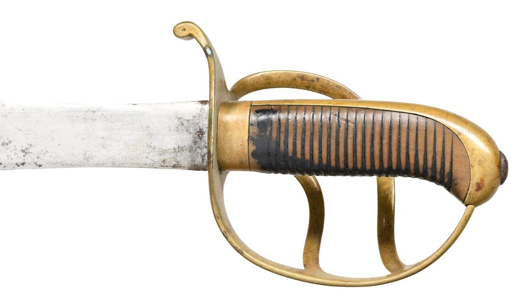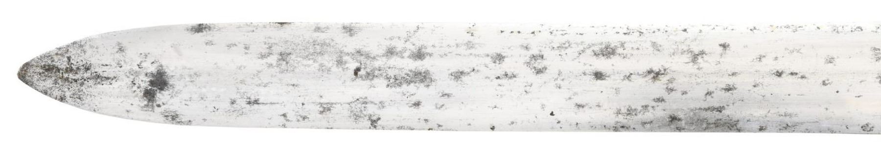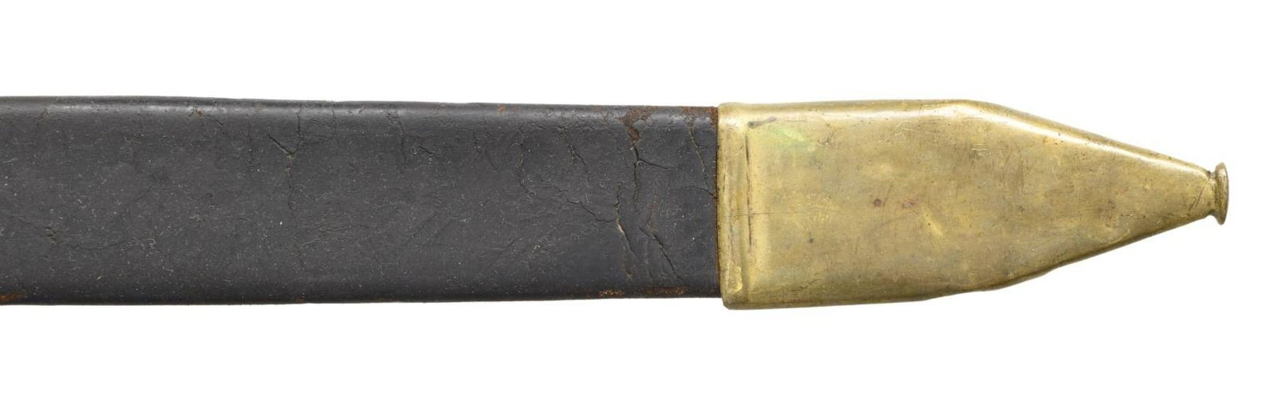 Overall length: 30”. Blade length: 23 1/2". This sword is likely Bavarian or German in origin and was possibly used by police or other law enforcement forces. Plain blade is slightly waisted near the hilt. Brass hilt with a plain guard and downturned quillon. 2 Branches meet the plain knuckle bow before entering the bird’s head style pommel. Grip appears to be a thin leather wrap over hardwood above a plain brass ferrule. Brass mounted leather scabbard with frog. CONDITION: blade has a light gray, somewhat mottled patina. Hilt has a pleasing mustard patina. The wrap is about 60% complete. Scabbard mounts have a pleasing patina. Leather body is a bit flexed but remains solid. Frog shows light to moderate wear. (02-20078/BF). $350-500.