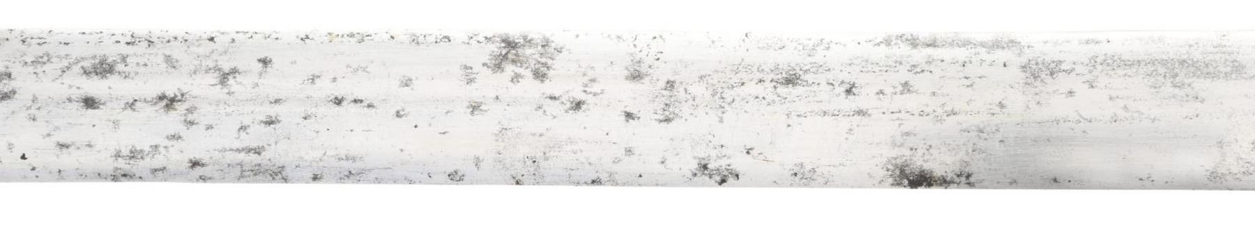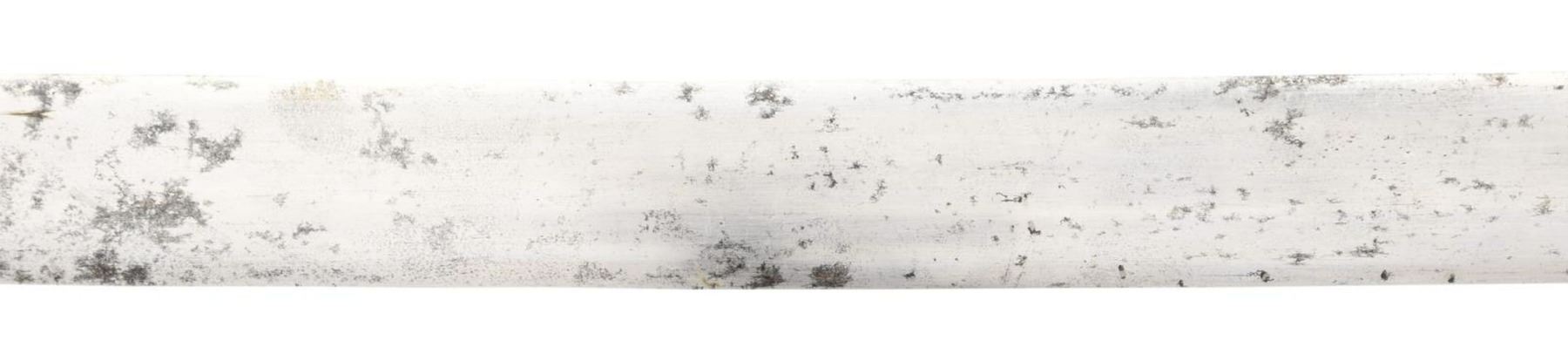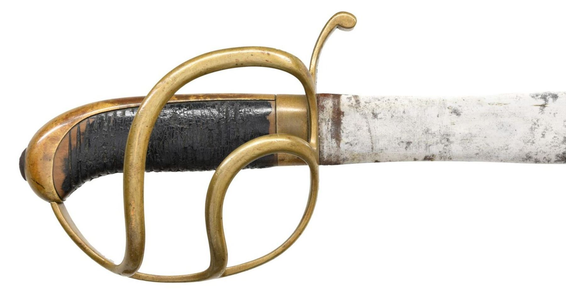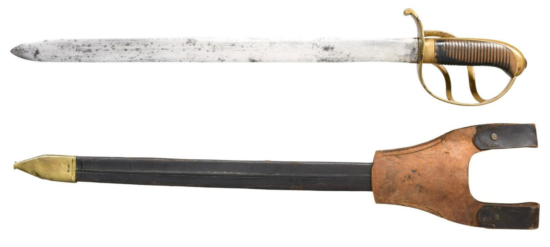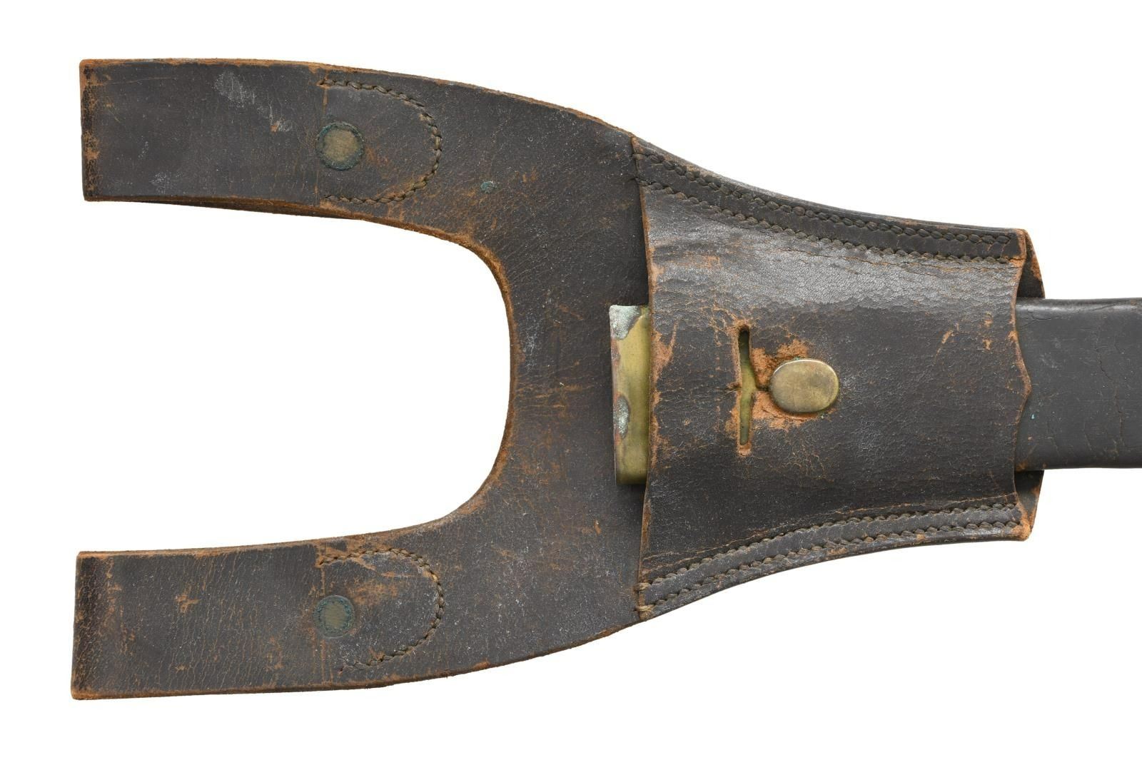 Overall length: 30”. Blade length: 23 1/2". This sword is likely Bavarian or German in origin and was possibly used by police or other law enforcement forces. Plain blade is slightly waisted near the hilt. Brass hilt with a plain guard and downturned quillon. 2 Branches meet the plain knuckle bow before entering the bird’s head style pommel. Grip appears to be a thin leather wrap over hardwood above a plain brass ferrule. Brass mounted leather scabbard with frog. CONDITION: blade has a light gray, somewhat mottled patina. Hilt has a pleasing mustard patina. The wrap is about 60% complete. Scabbard mounts have a pleasing patina. Leather body is a bit flexed but remains solid. Frog shows light to moderate wear. (02-20078/BF). $350-500.